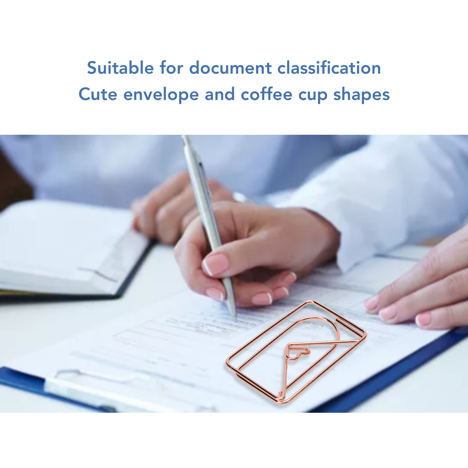 1、Metal Material: The cute paper clip is made of metal material, with anti rust electroplating process, not easy to fade, not easy to rust. 2、Lightweight and Portable: The cute paper clip is lightweight and portable, durable and not easy to break, ensuring long term use and suitable for document sorting. 3、Appearance Shape: Featuring cute envelopes and coffee mugs, the clip has a bright, corrosion resistant finish. 4、Practical: Cute paper clips are not easy to damage the paper, increase slip resistance, can be used as bookmarks, etc. 5、Applicable: Cute paper clips can help organize your documents and drawing paper, suitable for office, home and daily use.
