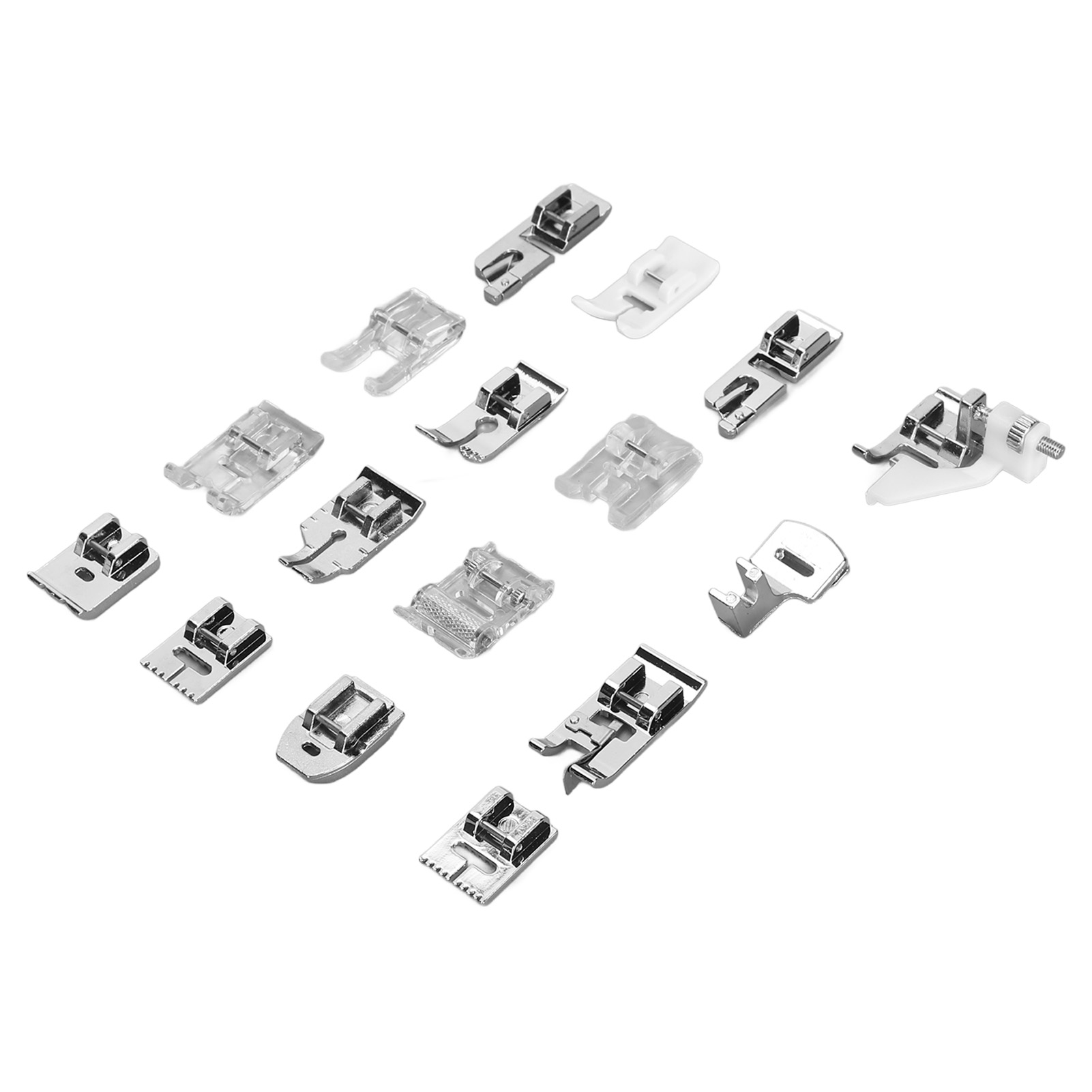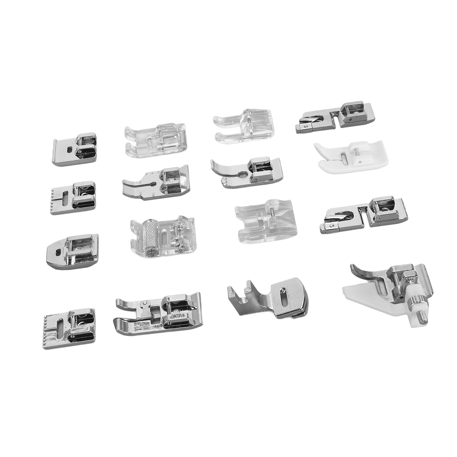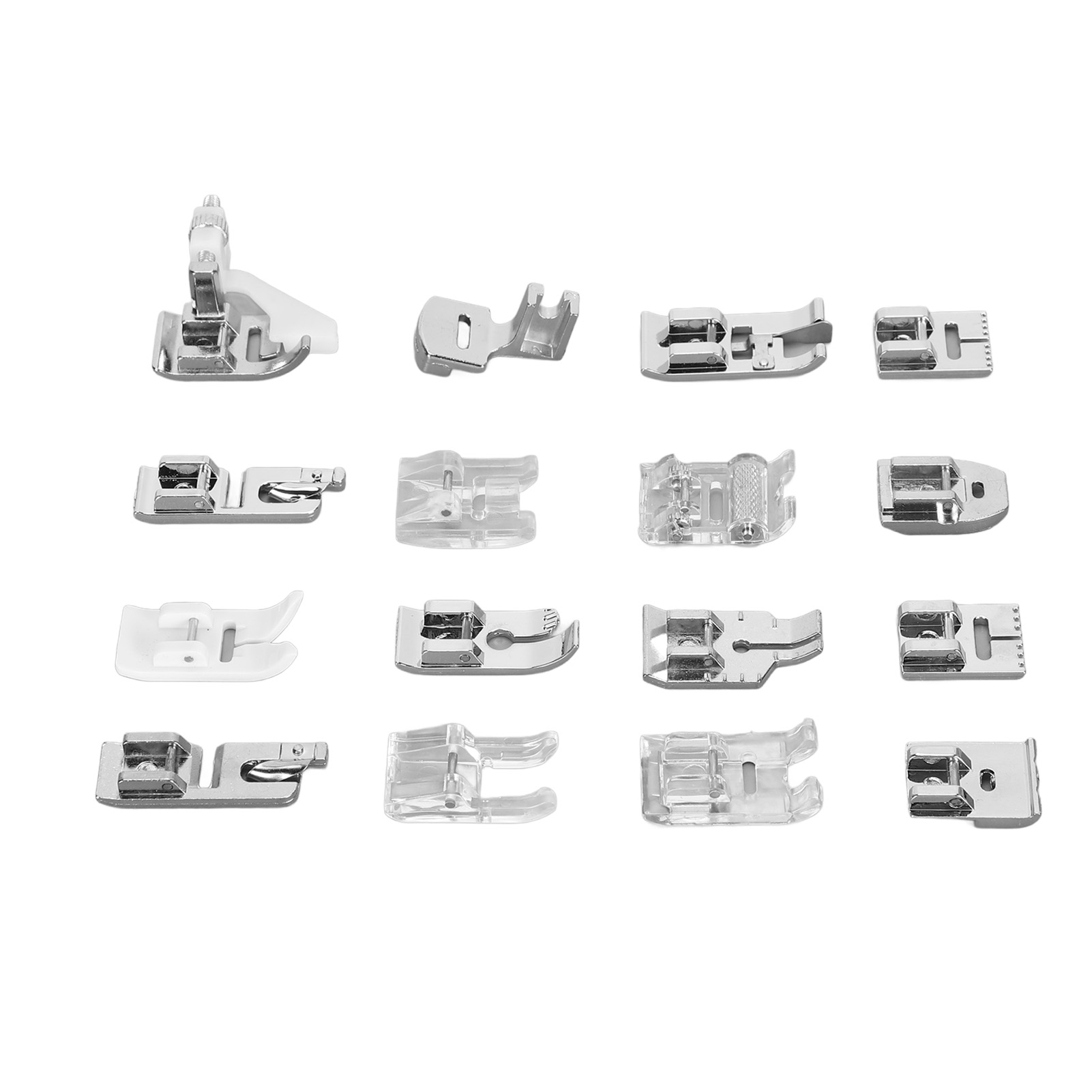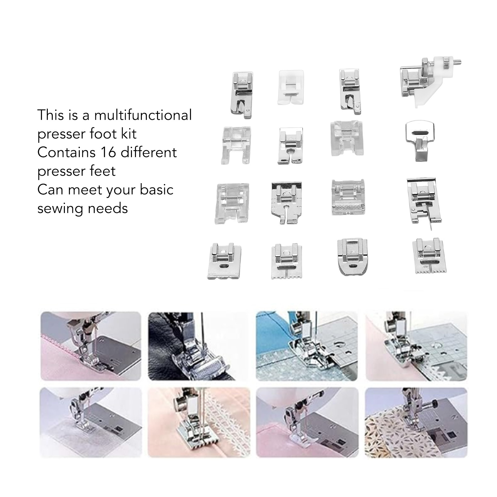 1、16PCS: This is a multifunctional presser foot kit, containing 16 different presser feet, which can meet your basic sewing needs. 2、STAINLESS STEEL MATERIAL: The sewing presser foot is made of stainless steel material, which is sturdy, durable, rust resistance and has high stability for long term use. 3、APPLICABLE: This set is universal for home multifunctional sewing machines, not available for old, small, industrial sewing machines! 4、IDEAL REPLACEMENT PIECE: Sewing presser foot is easy to use and can be used to replace the original part. A fine presser foot replacement for damaged presser feet or to improve your sewing machine. 5、COMPACT SIZE: Metal sewing machine presser foot is small and compact in size, easy to install and operate, a practical sewing machine accessory.