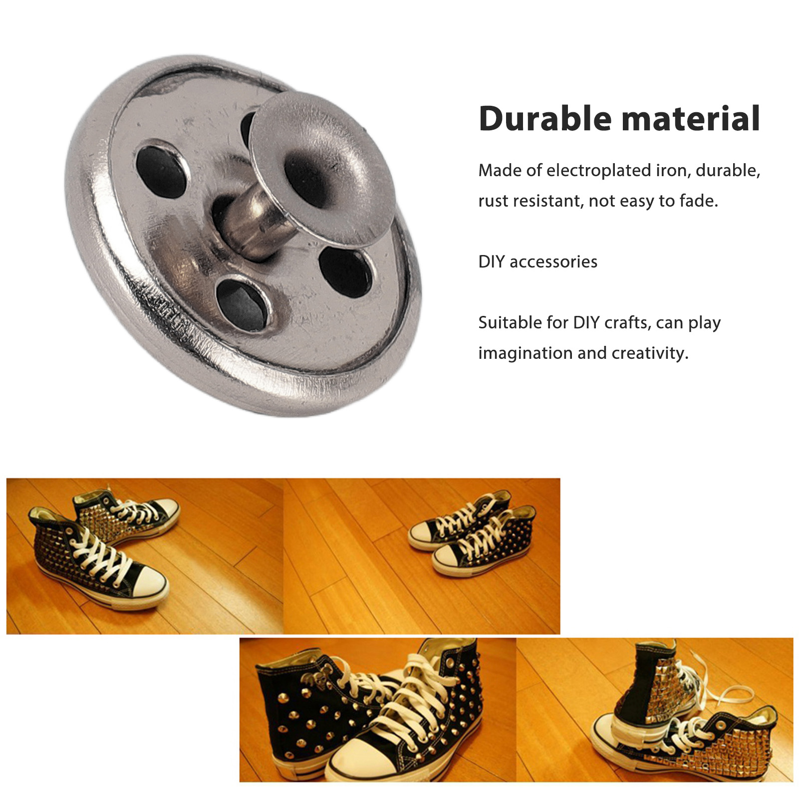 1、Durable Material: The leather rivets are made of electroplated iron, ensuring durability, rust resistance, and colorfastness. They will stay intact for a long time, even with regular use. 2、DIY Accessories: Perfect for DIY crafts, the leather rivets allow you to unleash your imagination and creativity. They provide endless possibilities for customization and personalization. 3、Wide Application: The rivets can be used to repair or decorate shirts, jackets, down coats, backpacks, shoes, hats, belts, and more. They add a stylish touch and a professional finish to any leather or fabric item. 4、Lightweight and Portable: With an 18mm size, the rivets are compact and lightweight, making them easy to carry around. You can conveniently have them on hand for any on the go repairs or embellishments. 5、Packing List: Each set includes 100 mushroom rivets and 100 pronged studs, providing you with ample quantities for your daily needs.