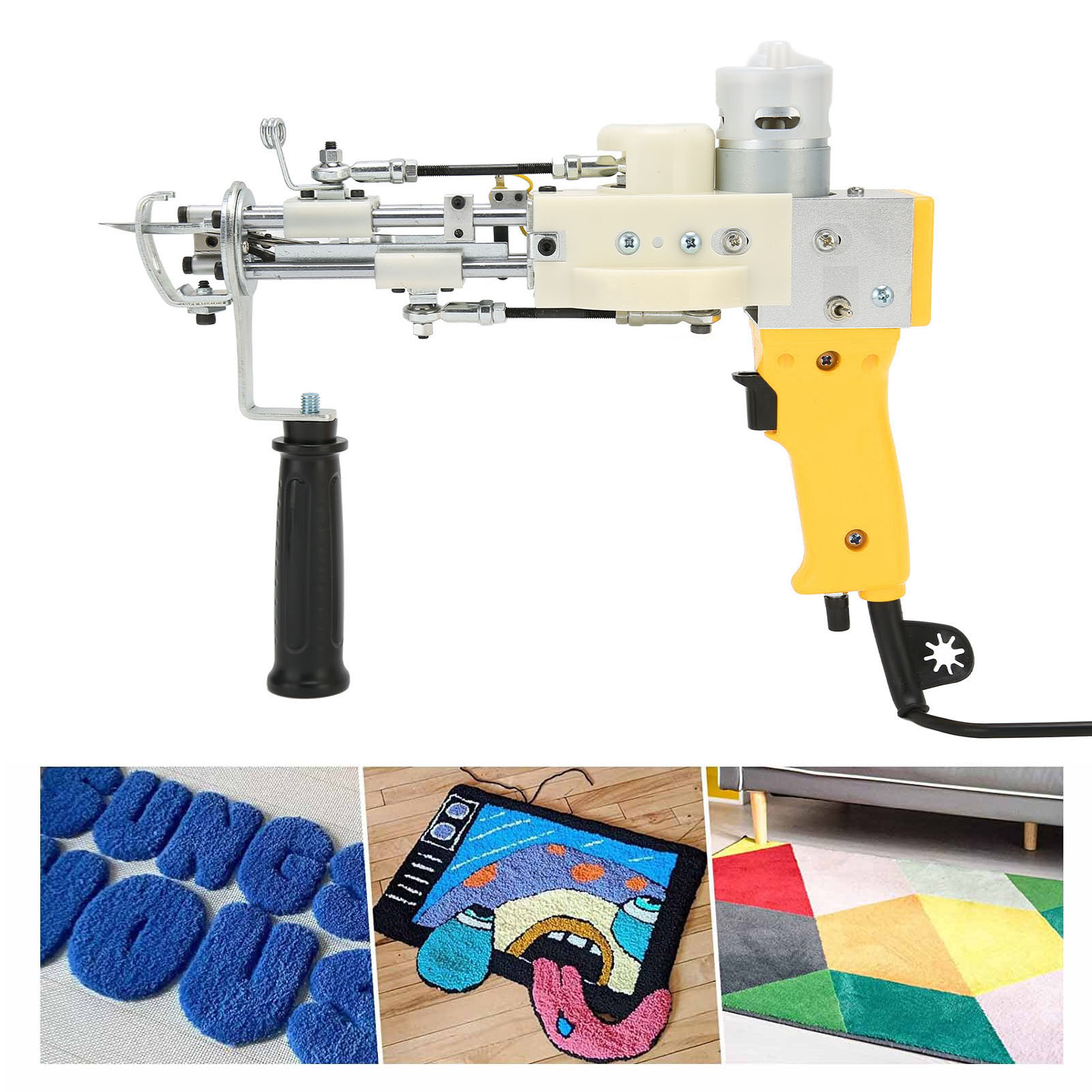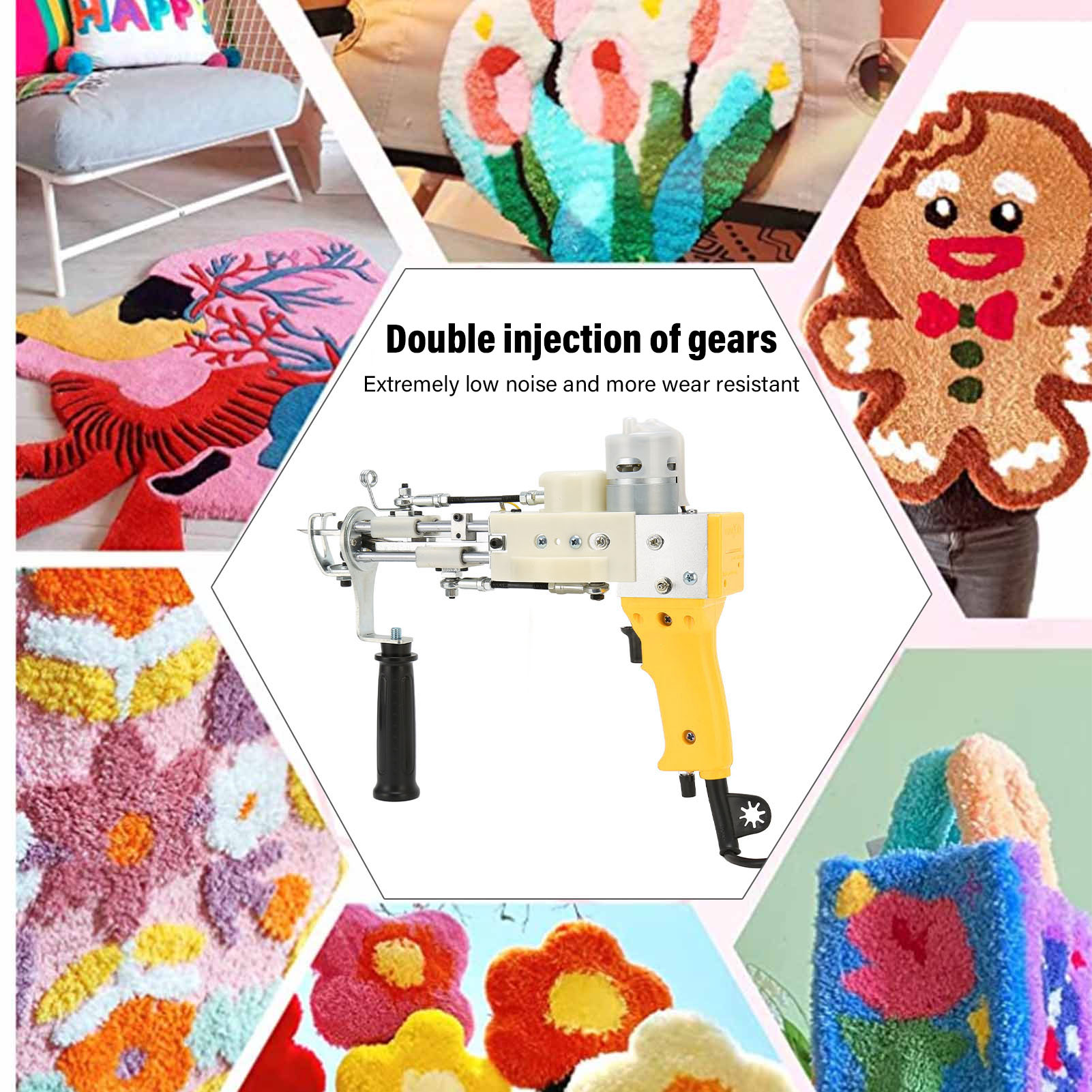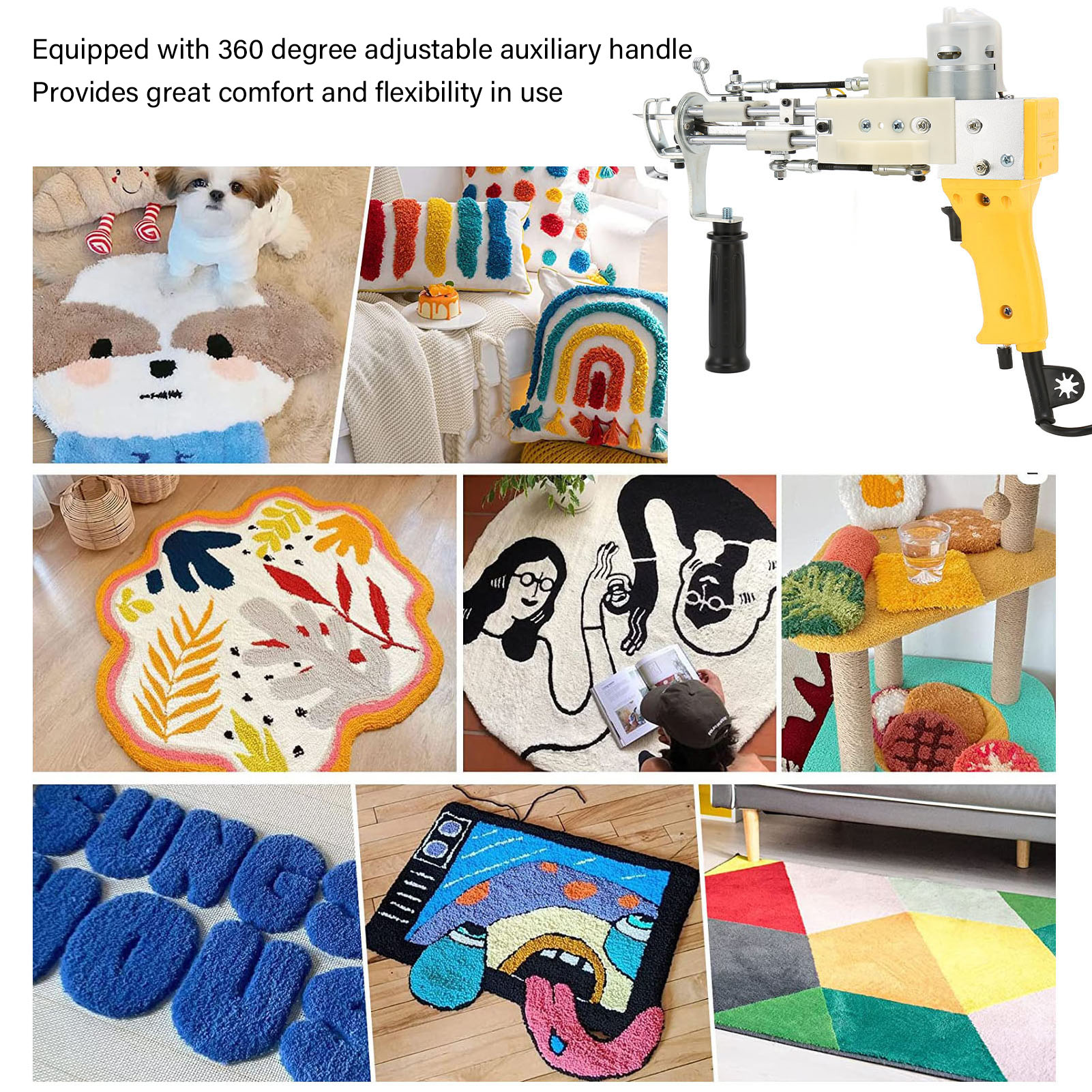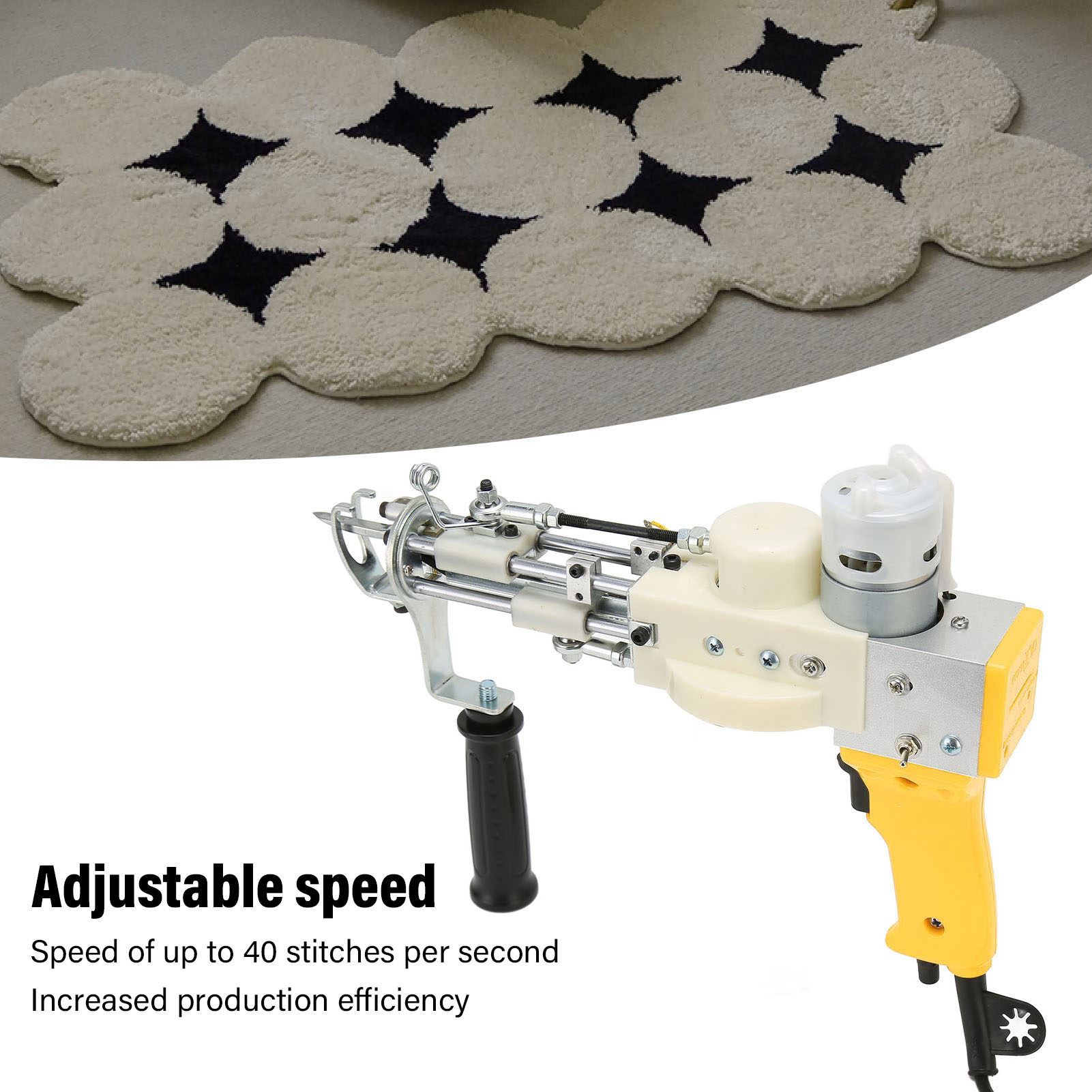 1、Adjustable Speed: The speed of the Carpet weaving machine is up to 40 stitches per second, which is highly productive and adjustable, very practical and safe. 2、360 Degree Adjustable Handle: Carpet gun machine is equipped with 360 degree adjustable auxiliary handle, which provides great comfort and flexibility when using. 3、Low Noise: The gears are twice injection molded and the teeth are made of special material, which is extremely low noise and more wear resistant. 4、DIY Production: Tufting machine can realize the conversion of cutting pile and circulating pile, you can use it to DIY your favorite carpet and make many beautiful artworks. 5、Widely Used: Electric rug gun machine is widely used for weaving various types of carpets. And compatible with all kinds of yarns, suitable for beginners or professionals.