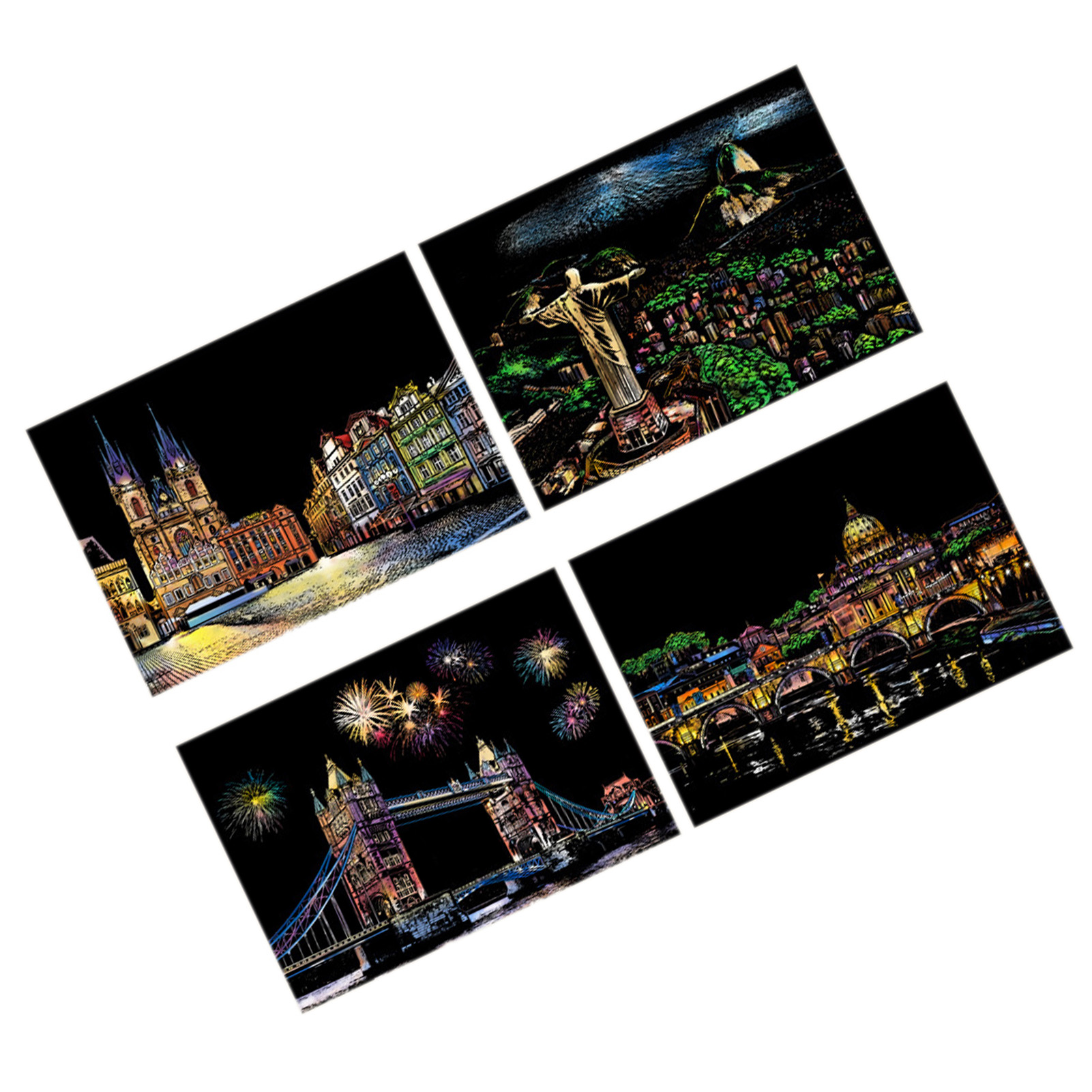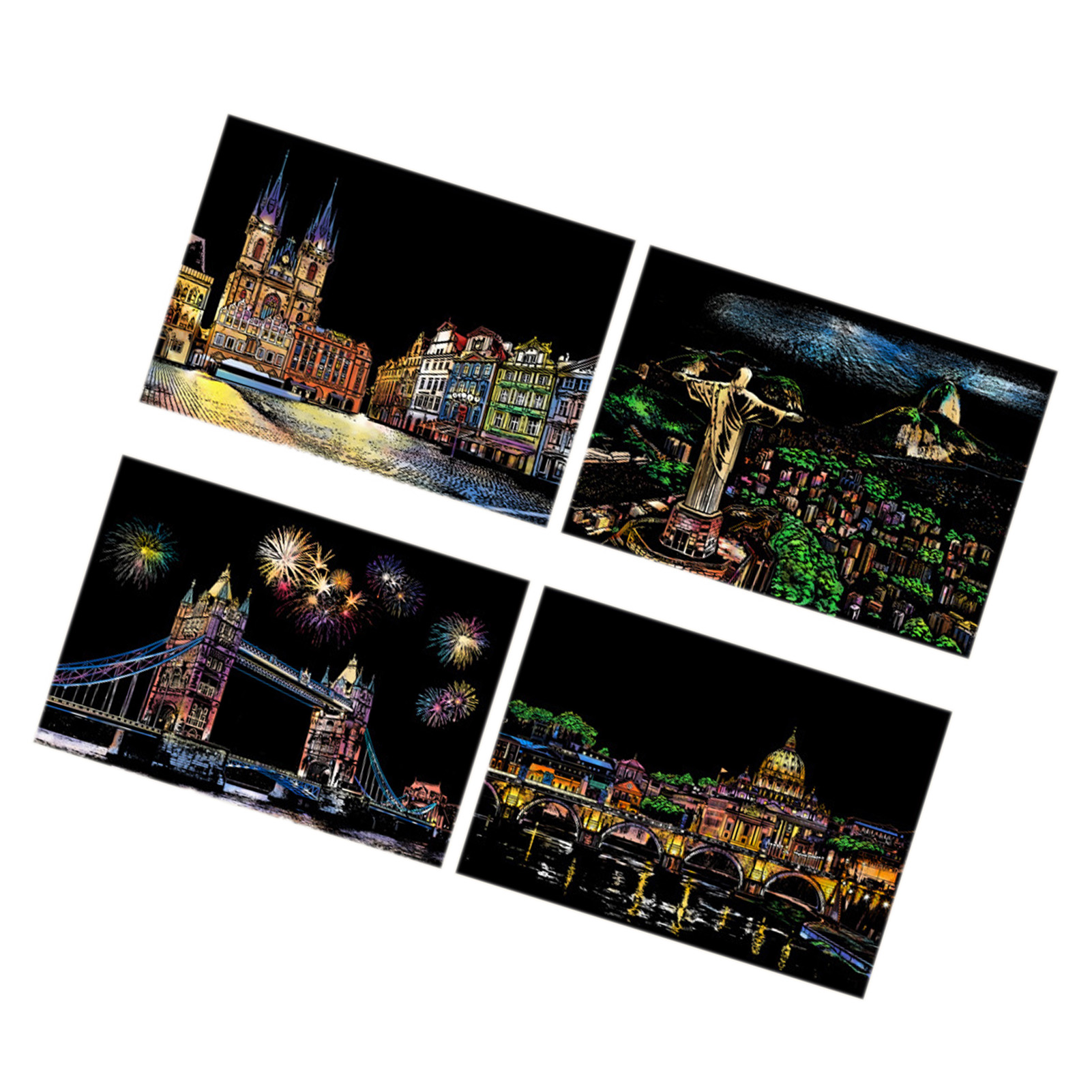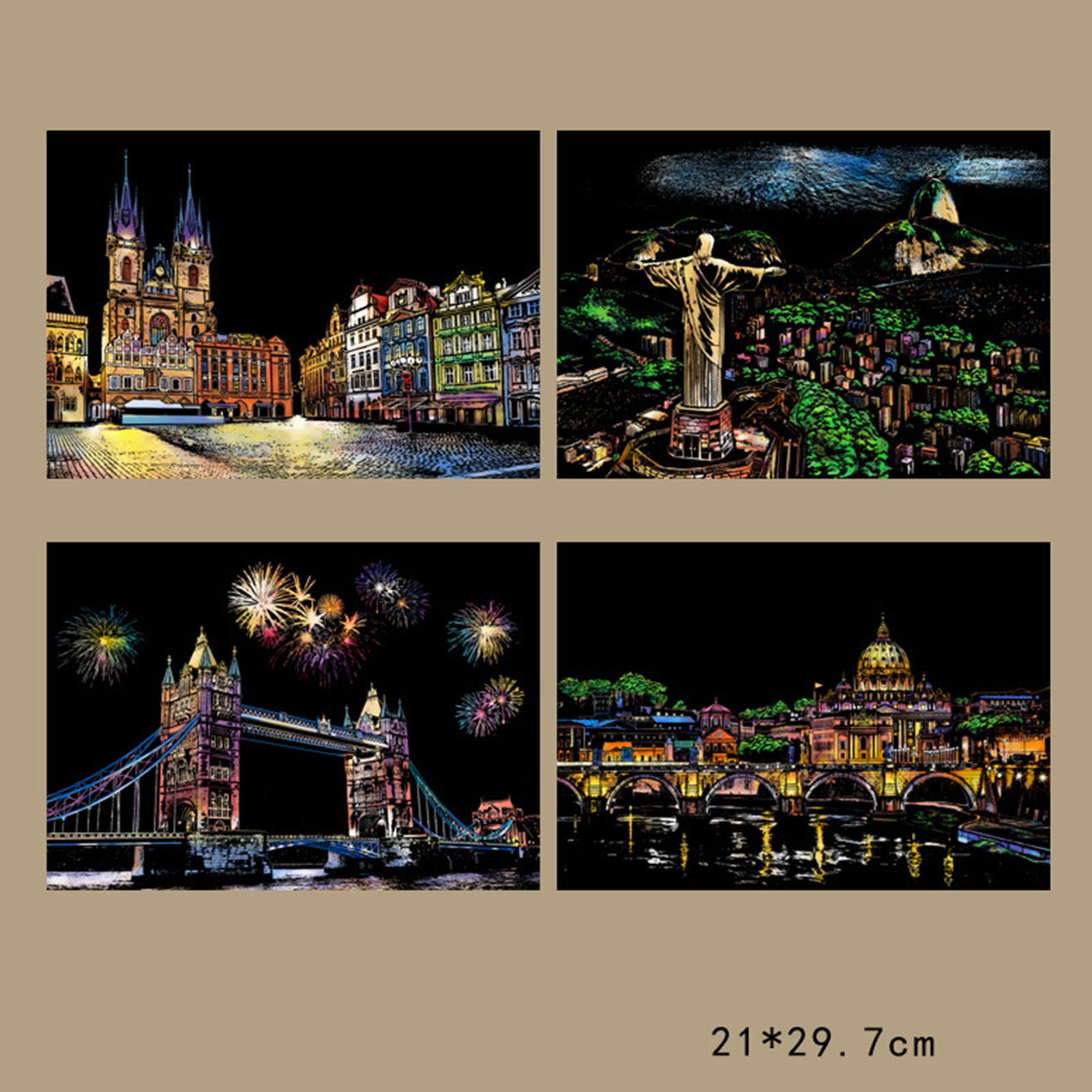 4 Sheets Scratch Paper DIY Handicraft A4 White Cardboard Landscape Scratchboard Scratch Painting Paper Beautiful City