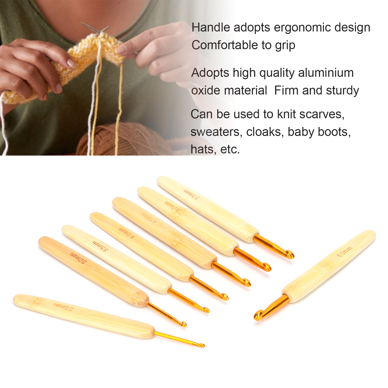 1、The crochet handle adopts ergonomic design, which is comfortable to grip and easy to crochet, which can reduce the pressure on fingers and wrist. 2、After several process polishing, our crochet hook will not hook the yarn or break, convenient for use. 3、Adopts high quality aluminium oxide material, safe and eco‑friendly, firm and sturdy, can be used for a long time. 4、Can be used to knit scarves, sweaters, cloaks, baby boots, hats, etc., with a wide range of application. 5、8pcs crochet hook are available, with different model, perfect for beginners and crochet lovers, suitable for different occasion.