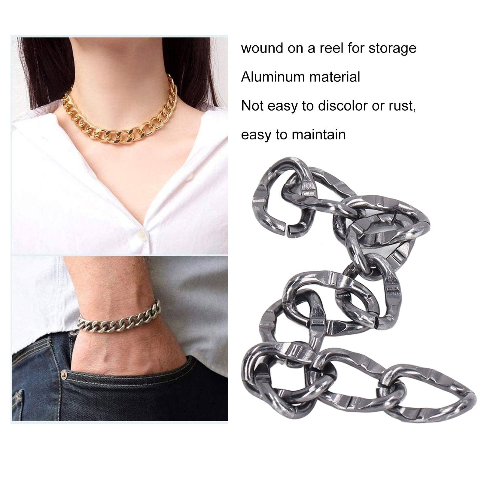 1、Convenient Storage: The aluminum chain is wound on a spool, when not in use, simply roll the chain back onto the spool for storage 2、Elegant Style: The aluminum curb chains have a sturdy and elegant look making them suitable for daily wear or any special gathering 3、Aluminum Material: The craft chain is made of aluminum material, which is not easy to discolor or rust, easy to maintain 4、DIY Making: The jewelry making curb chain can be used to DIY various necklaces and bracelets to show your personality 5、Scope of Application: The curb chain is suitable for DIY jewelry making, such as necklaces, bracelets, anklets, etc., suitable for dating, shopping, parties, etc