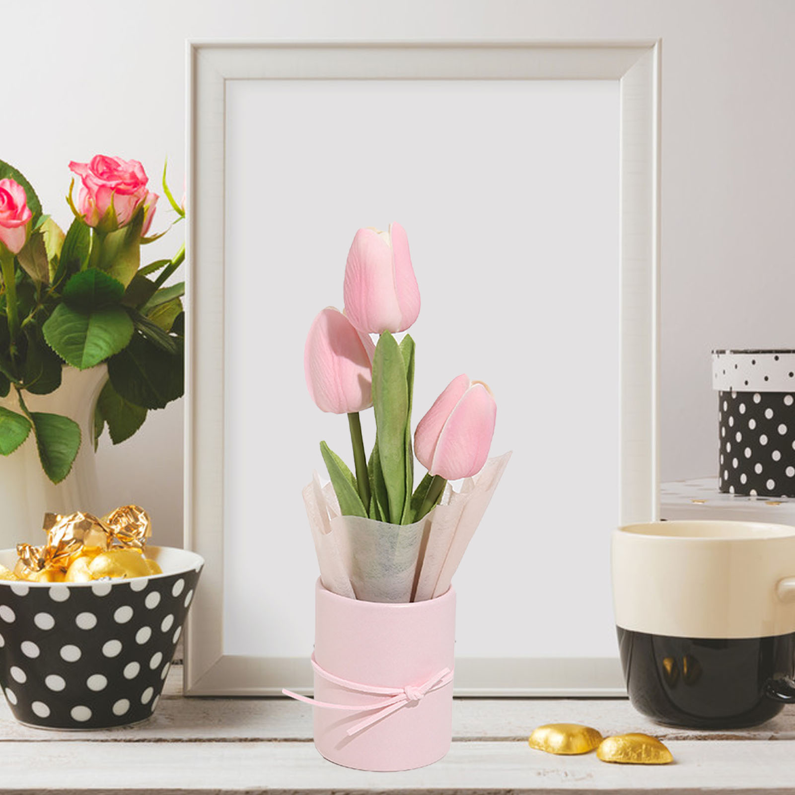 1、Vibrant Colors: Artificial flowers are exquisitely made, brightly colored, never fade and always stay beautiful. 2、DIY Production: DIY tulip bouquet can give a better experience of its production process, stimulate children's hands on ability and imagination. 3、Applicable Scenes: Artificial flowers bouquets can be used for Christmas parties, baby showers, home, indoor or covered outdoor places. 4、Perfect Gift: Fake flowers are the perfect gift for your craft loving friends, family, co workers for Christmas, Thanksgiving, anniversaries, etc. 5、Paper and PU: Flowers bouquets are made of Paper and PU material, real touch, not easy to damage, and can be used for a long time.