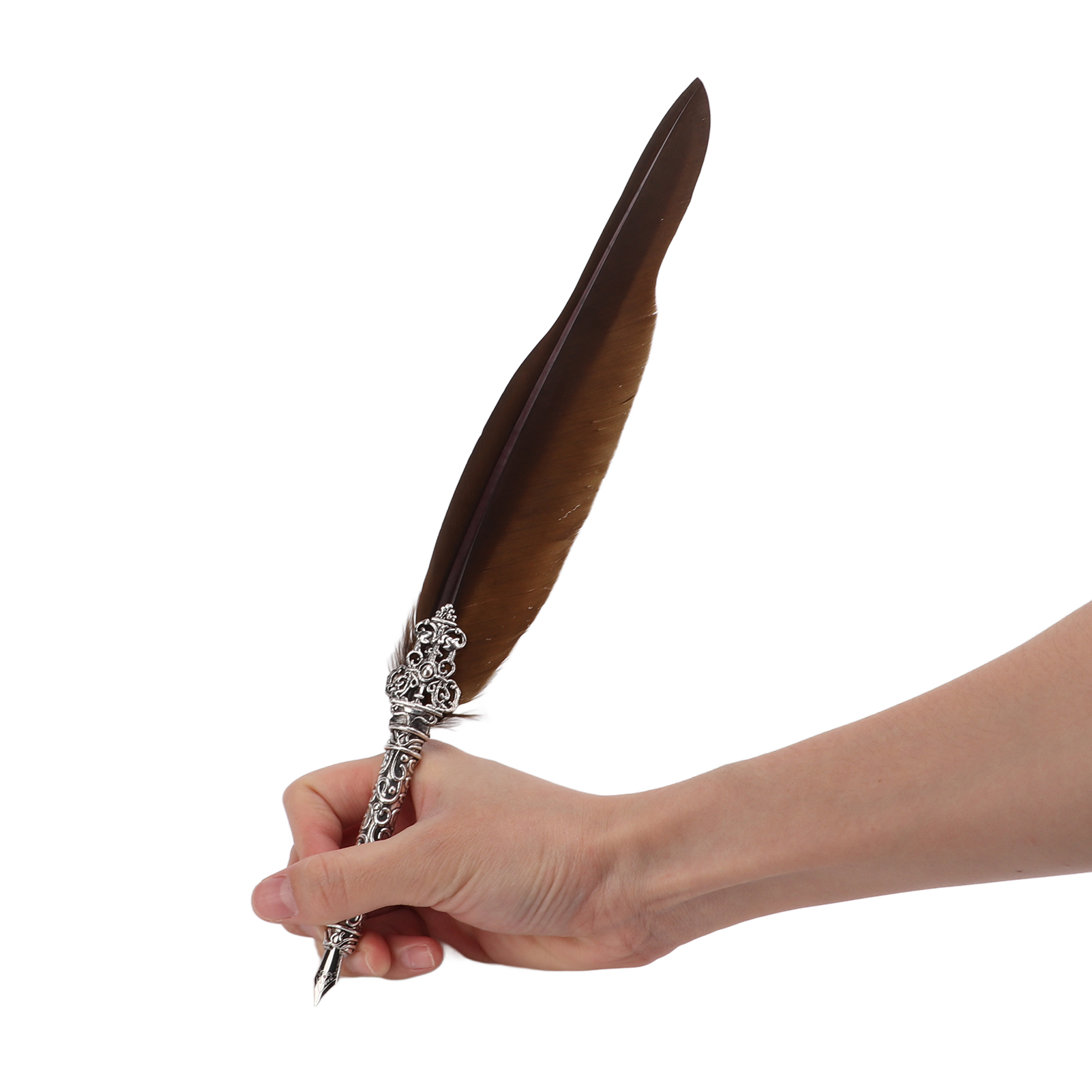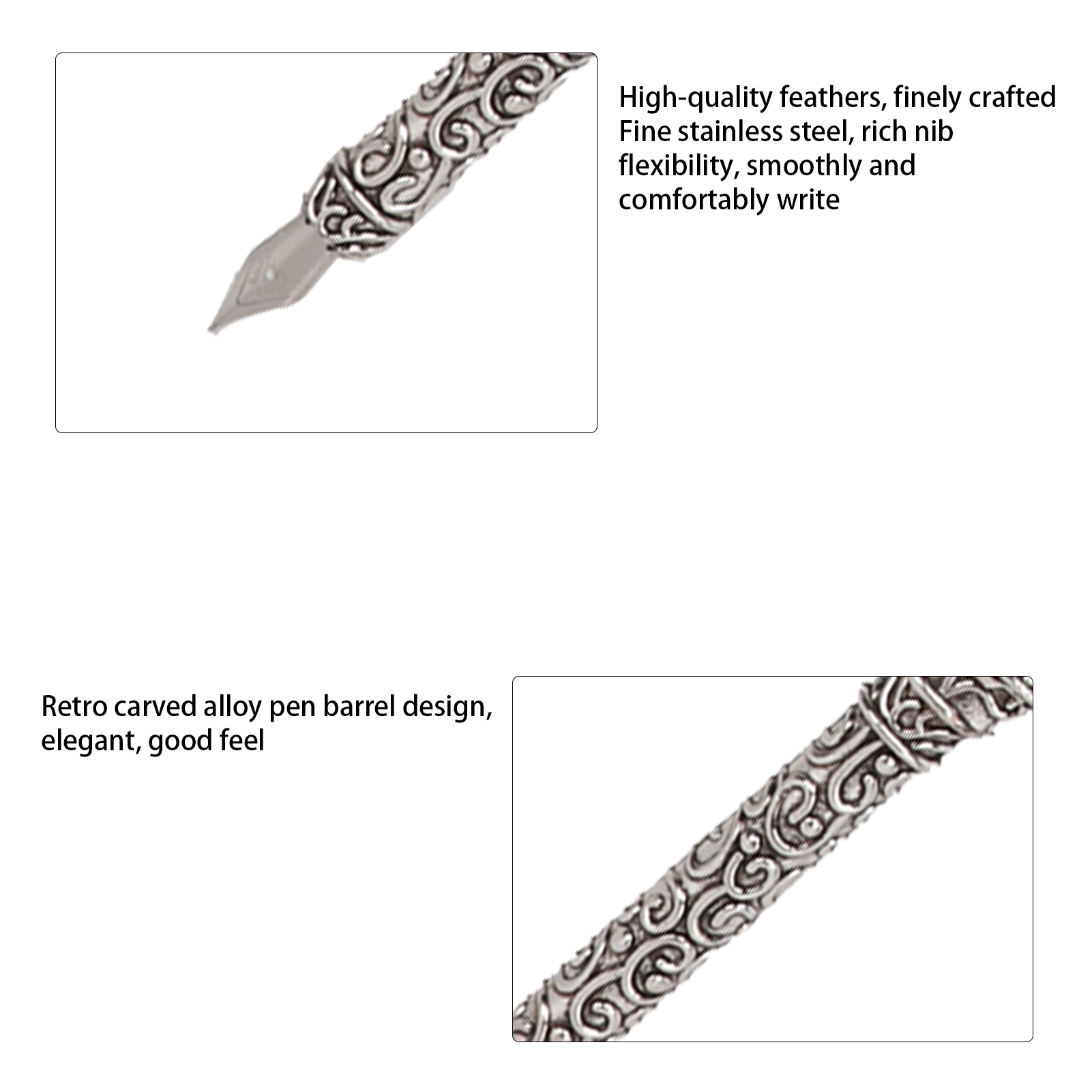 1、The retro‑carved alloy penholder design, the concave‑convex three‑dimensional pattern is more elegant, and the hand feels comfortable. 2、Using fine stainless steel, the nib is rich in elasticity, write smoothly and comfortably, more durable, and engraved with exquisite patterns. 3、Various valuable feathers are combined with metal pen barrels and stainless steel nibs to become retro and elegant writing tools. 4、Feather texture, soft and easy to split, use your fingers to gently pinch upward and straighten it out, you can restore it. 5、Ideal for drawing and general handwriting, it is also a meaningful gift for holidays, Christmas, birthdays, and any situation.