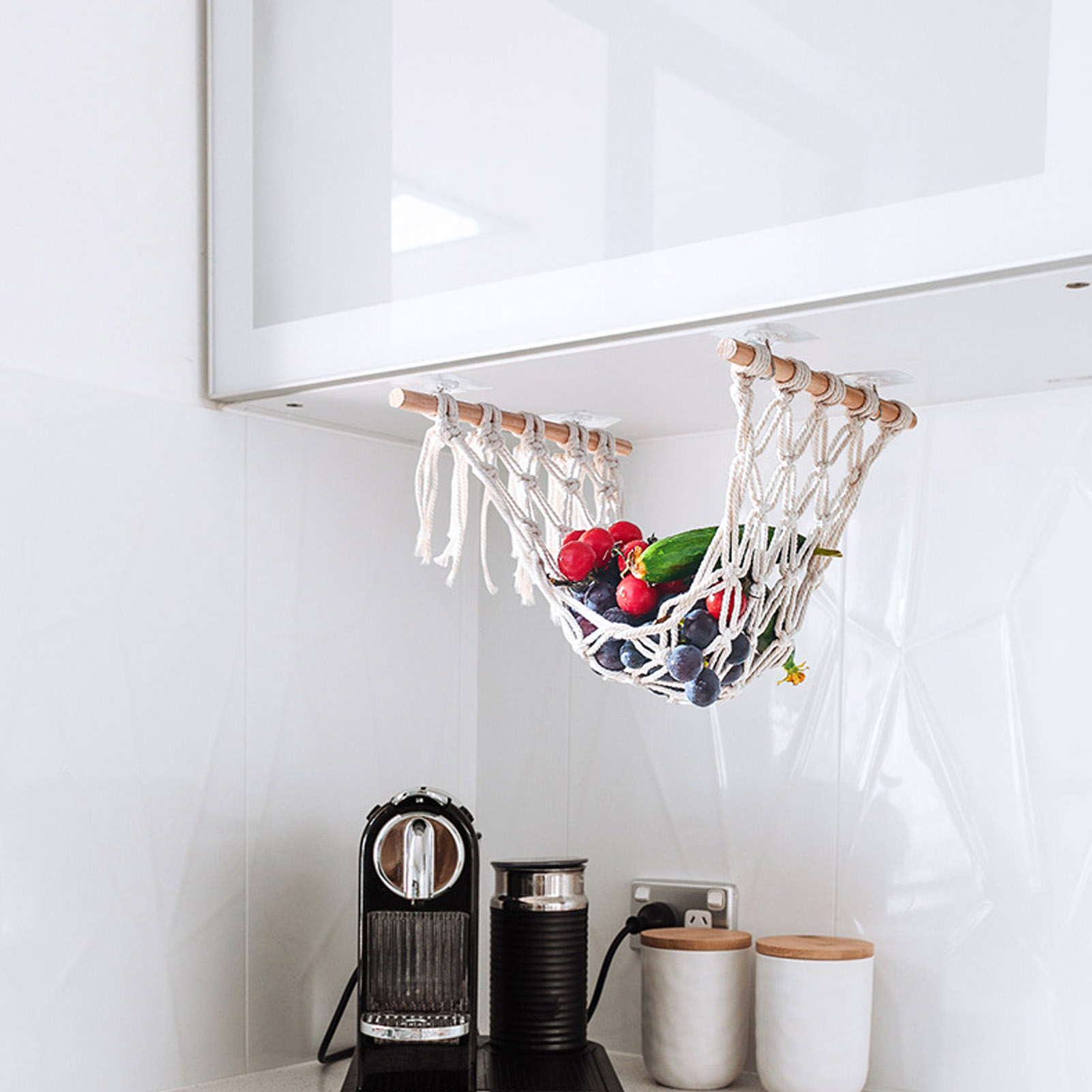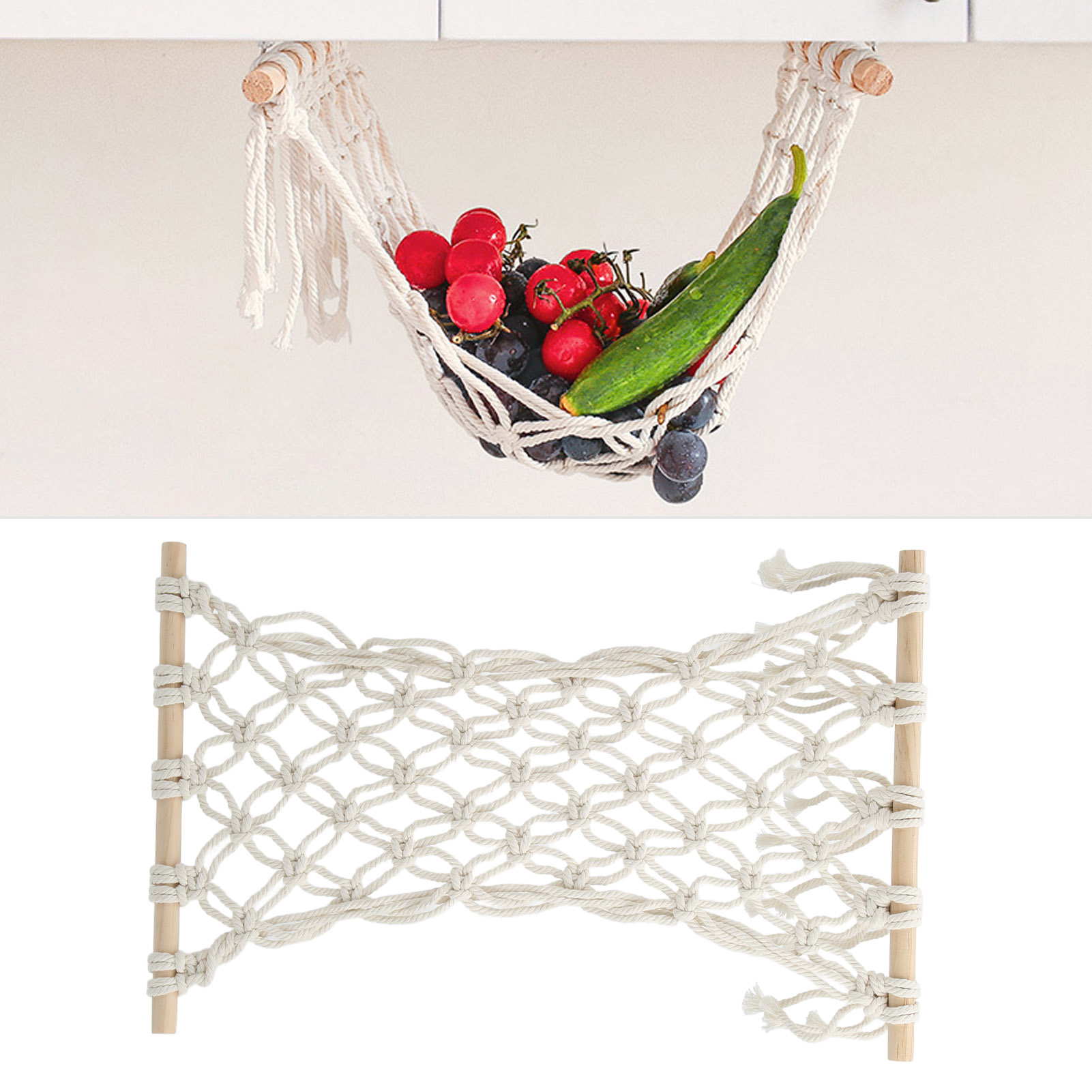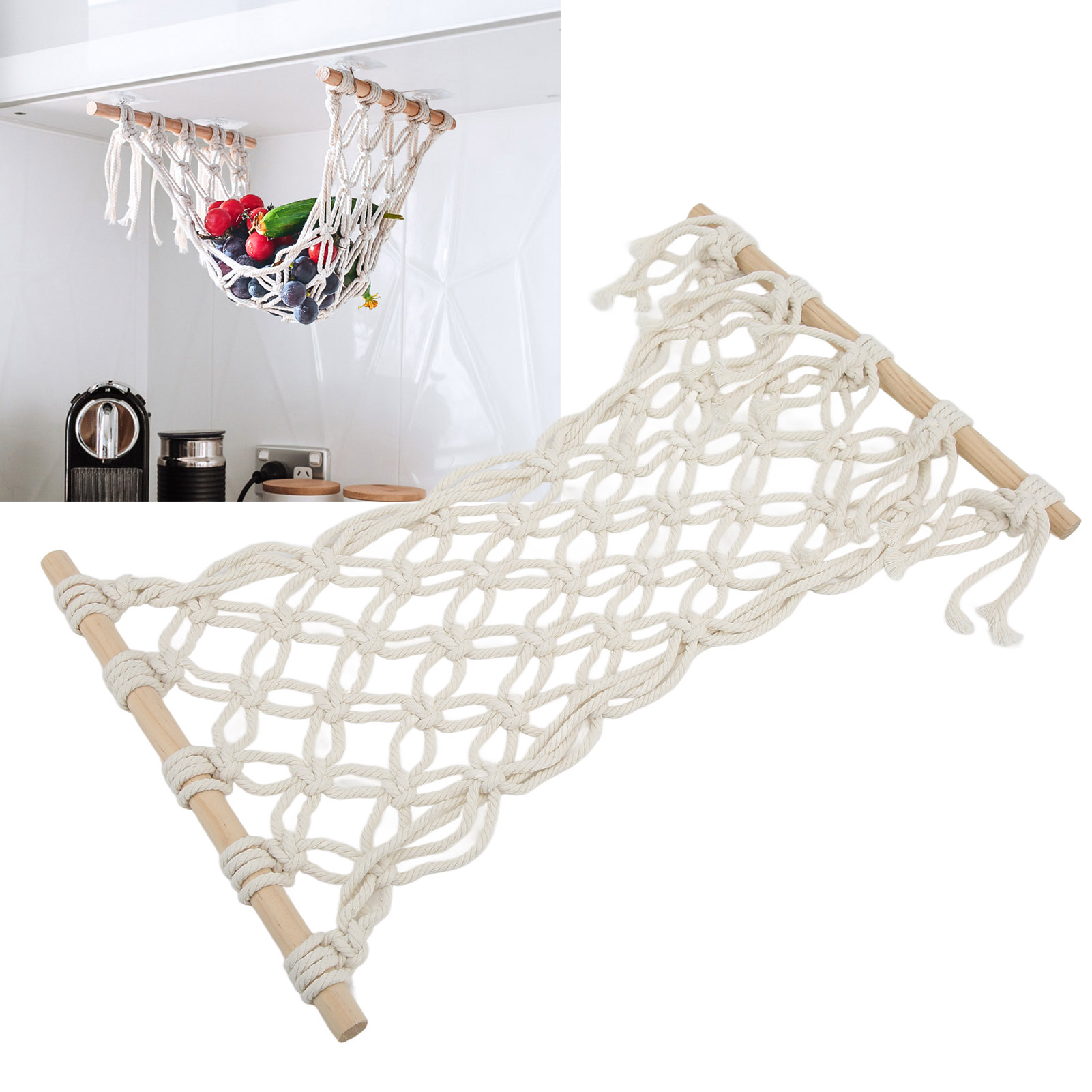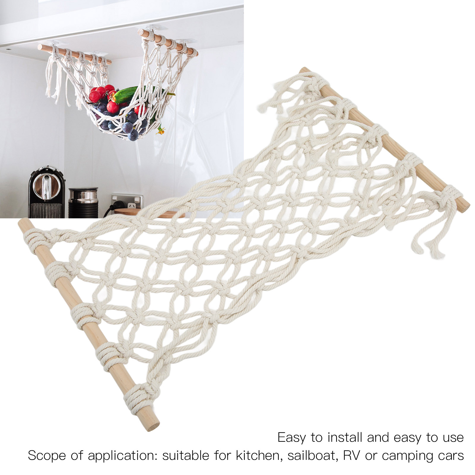 1、Temperature Adjustment: The fruit hammock is made of cotton thread, which has the characteristics of temperature adjustment, anti allergic, anti static, environmental protection, and no odor 2、Space Saving: The fruit hammock can save counter space and can be easily placed under cabinets or shelves 3、Scope of Application: The fruit hammock is suitable for installation on kitchens, sailboats, RVs or camping cars 4、Ideal Gift: The fruit hammock is an ideal gift for mother, wife or any friend. Very suitable for Christmas, birthdays, etc 5、Simple Operation: Installation is simple and convenient, the fruit hammock can be used without complicated process
