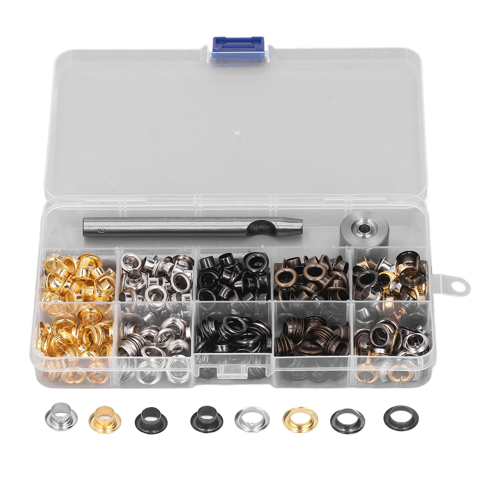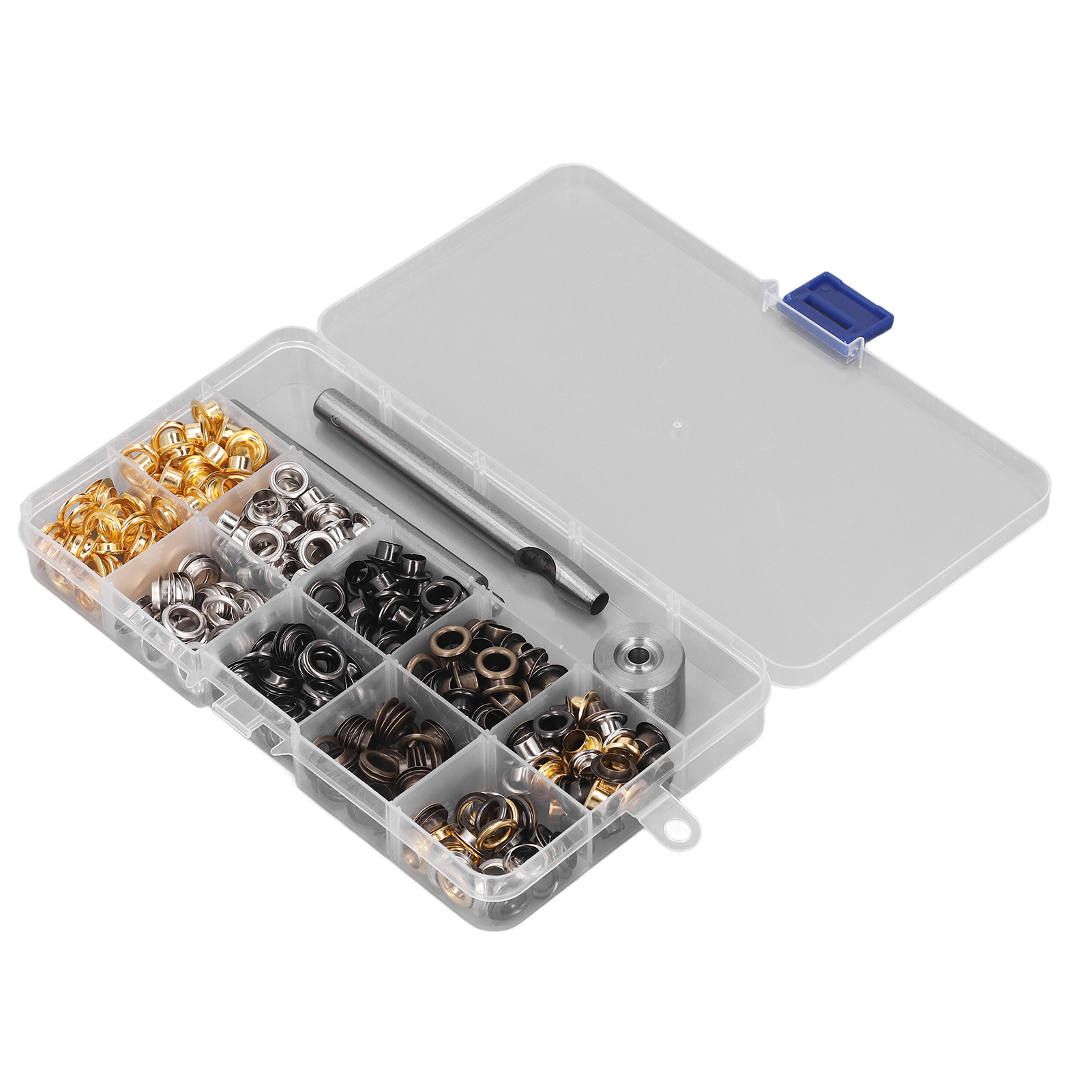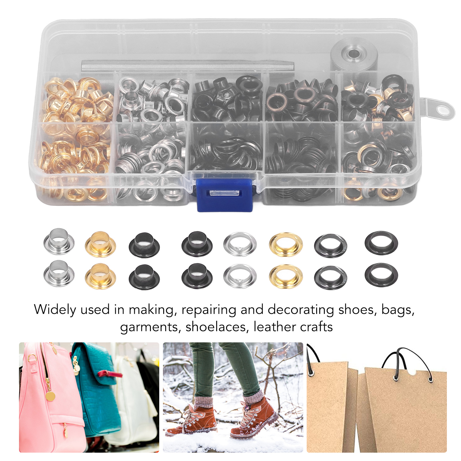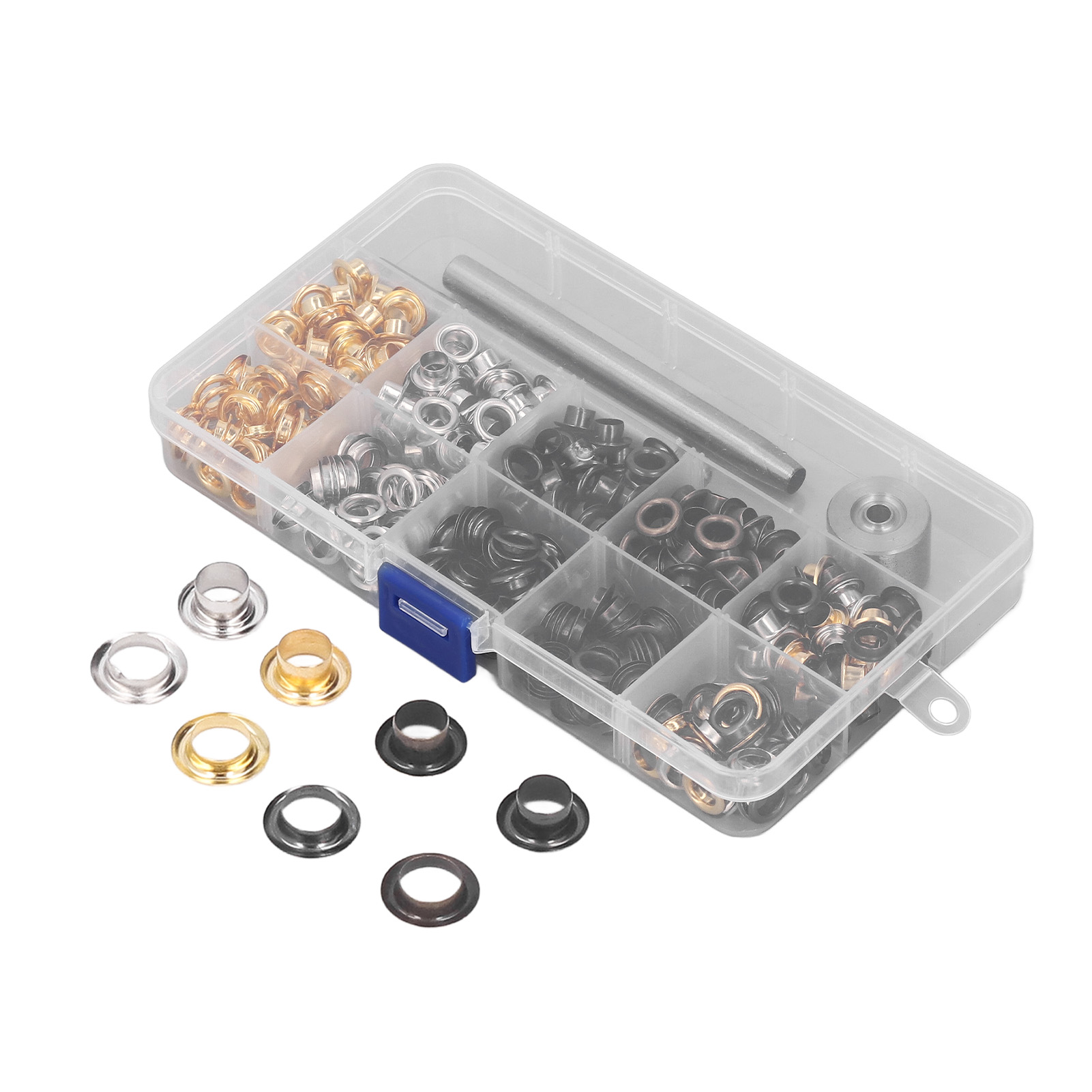 1、4 Colors: Eyelets tool kit is available in gold, silver, silver black and antique copper to meet your needs, ideal and perfect gift for mothers, friends and family. 2、Widely Used: Eyelet kit is widely used for making, repairing and decorating shoes, bags, clothes, laces and leather crafts. 3、Easy to Install: The rings are easy to install, just hammer out the small holes directly with our tools and the rings. 4、Metal Material: Eyelets are made of metal, sturdy and durable, not easy to rust and deformation, can be used for a long time. 5、With Plastic Box: All the grommets and tools are packed in a transparent storage box, so that you can find the corresponding parts more easily.