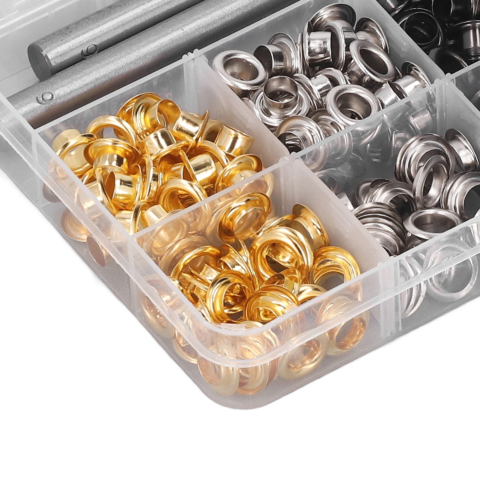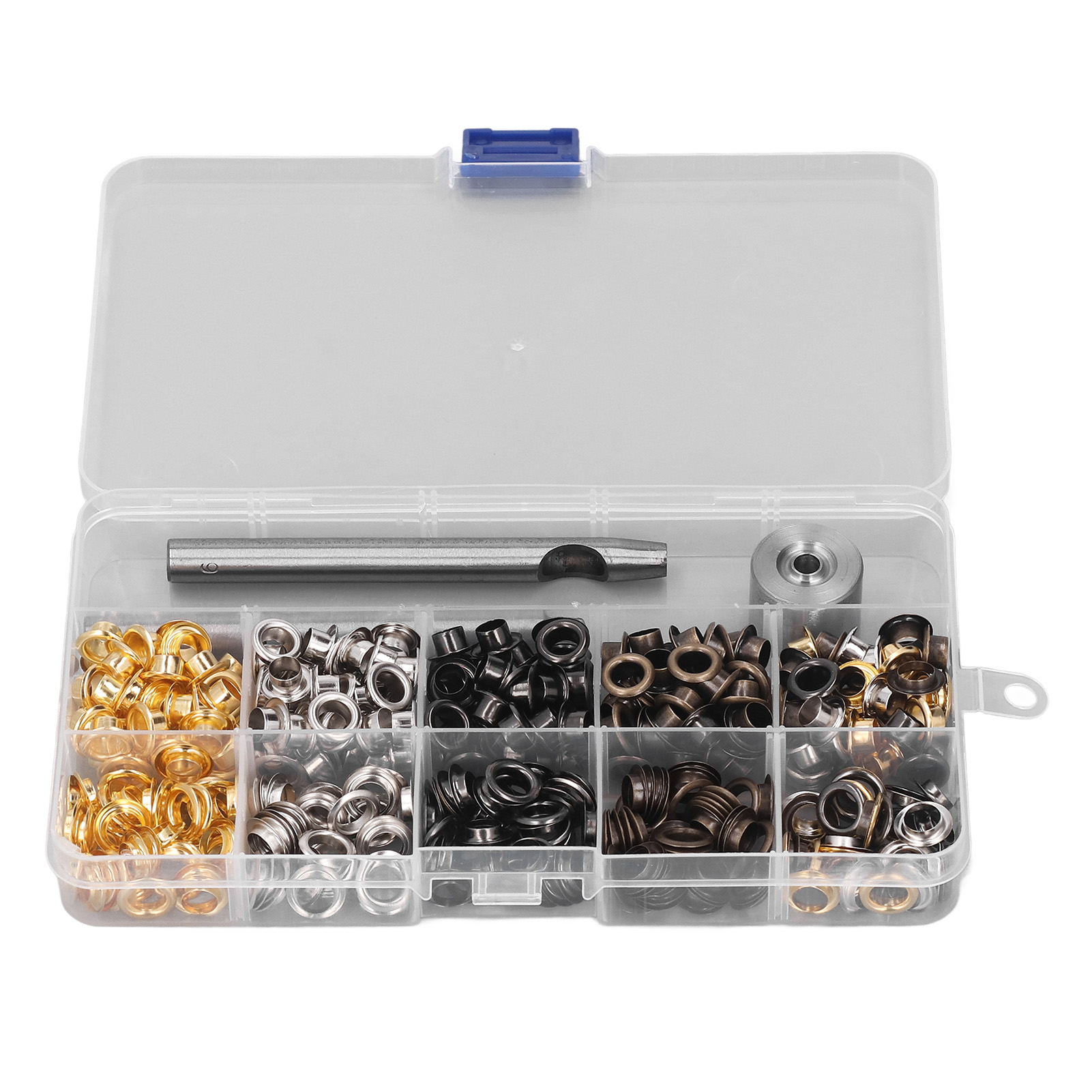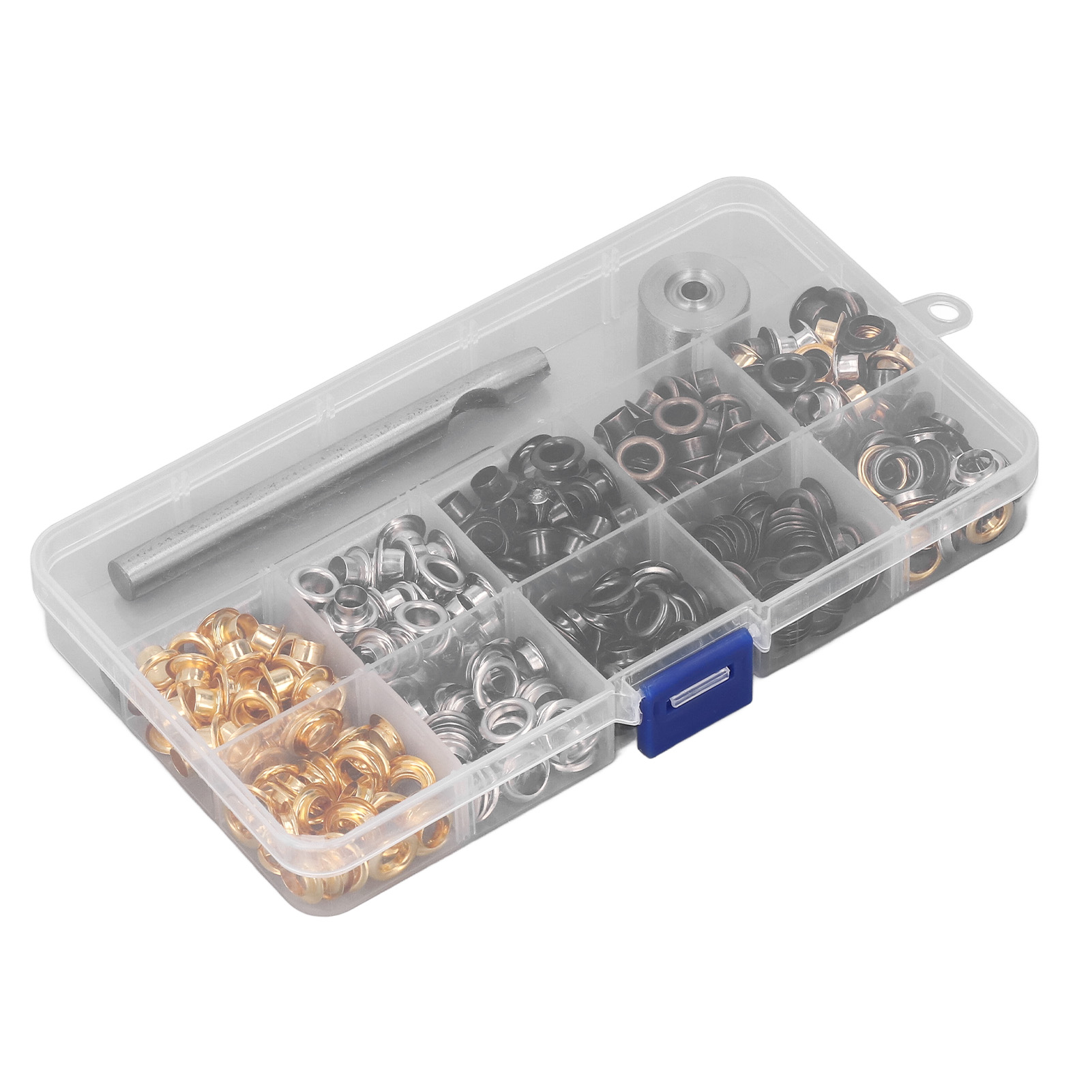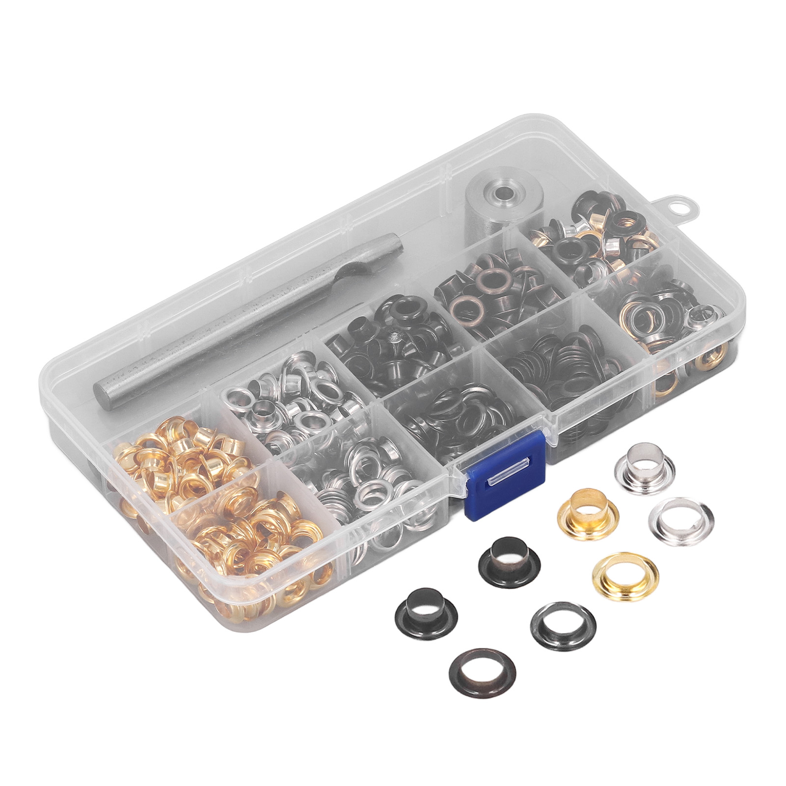 1、4 Colors: Eyelets tool kit is available in gold, silver, silver black and antique copper to meet your needs, ideal and perfect gift for mothers, friends and family. 2、Widely Used: Eyelet kit is widely used for making, repairing and decorating shoes, bags, clothes, laces and leather crafts. 3、Easy to Install: The rings are easy to install, just hammer out the small holes directly with our tools and the rings. 4、Metal Material: Eyelets are made of metal, sturdy and durable, not easy to rust and deformation, can be used for a long time. 5、With Plastic Box: All the grommets and tools are packed in a transparent storage box, so that you can find the corresponding parts more easily.