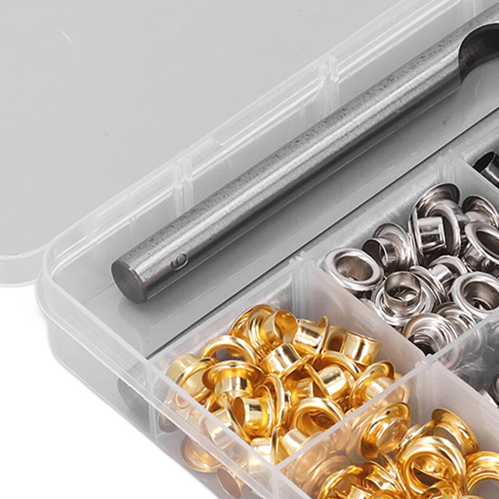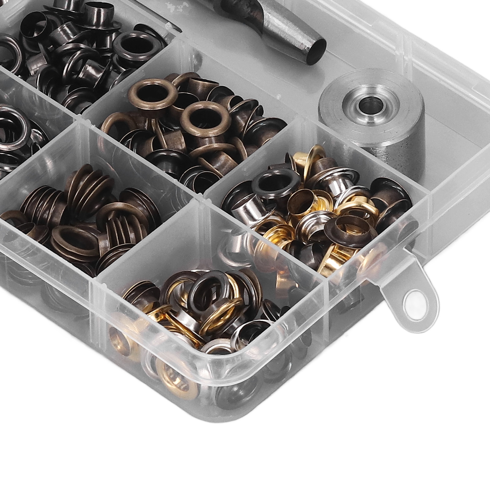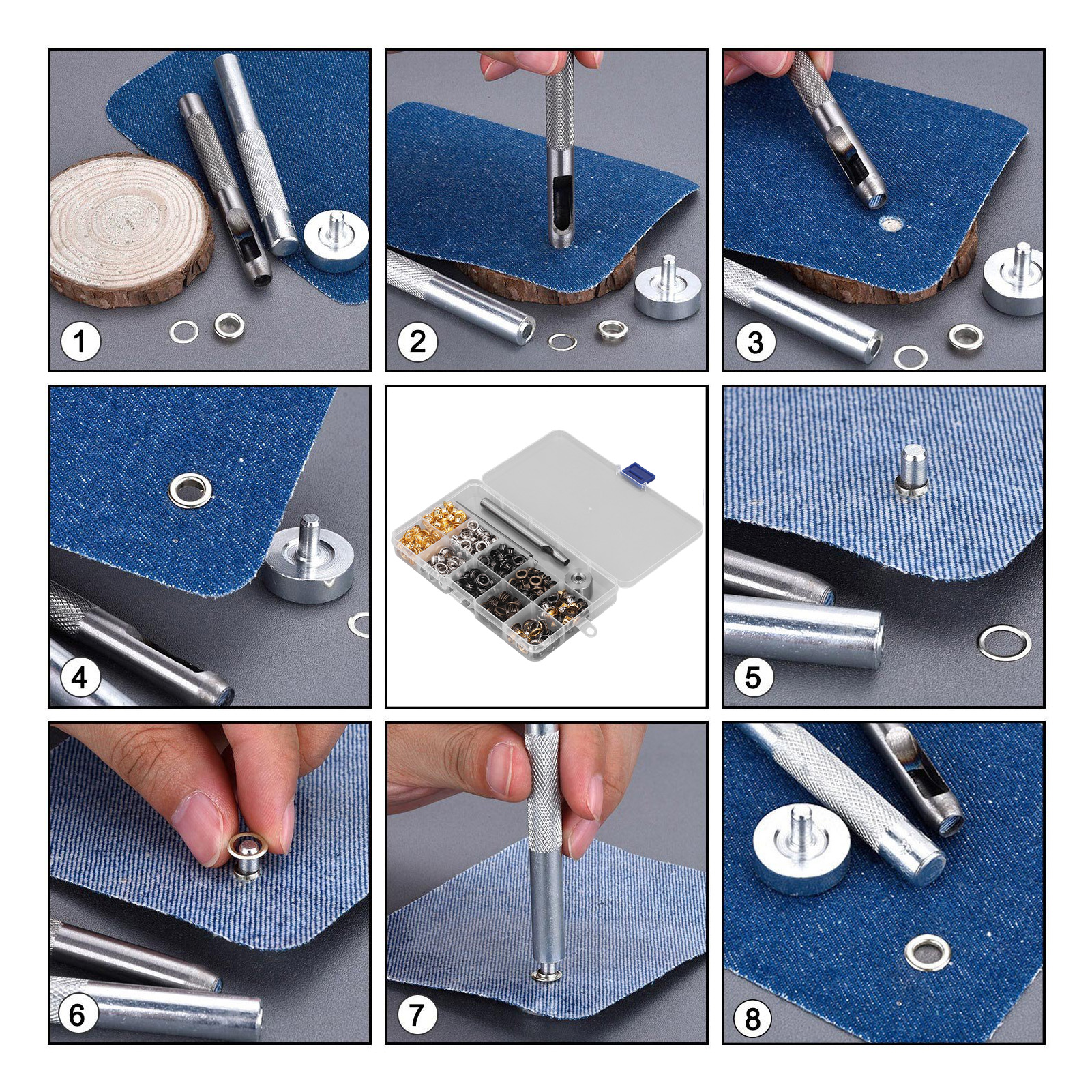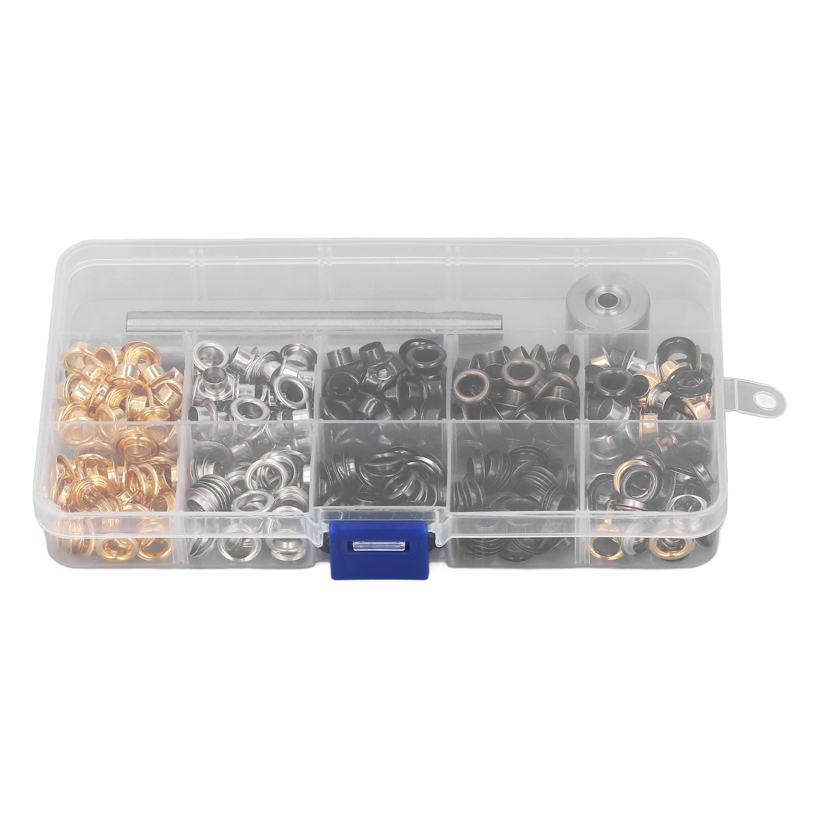 1、4 Colors: Eyelets tool kit is available in gold, silver, silver black and antique copper to meet your needs, ideal and perfect gift for mothers, friends and family. 2、Widely Used: Eyelet kit is widely used for making, repairing and decorating shoes, bags, clothes, laces and leather crafts. 3、Easy to Install: The rings are easy to install, just hammer out the small holes directly with our tools and the rings. 4、Metal Material: Eyelets are made of metal, sturdy and durable, not easy to rust and deformation, can be used for a long time. 5、With Plastic Box: All the grommets and tools are packed in a transparent storage box, so that you can find the corresponding parts more easily.
