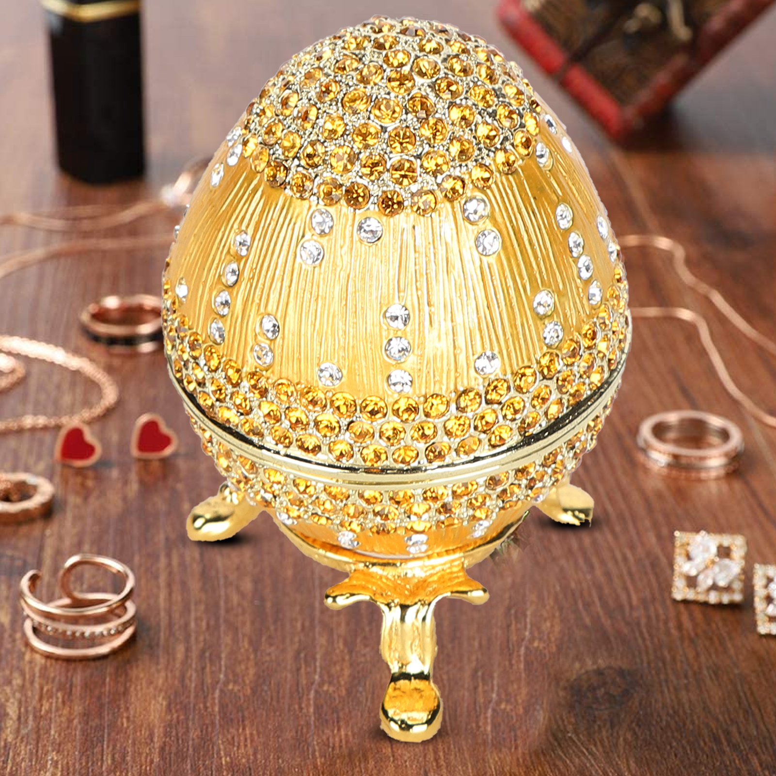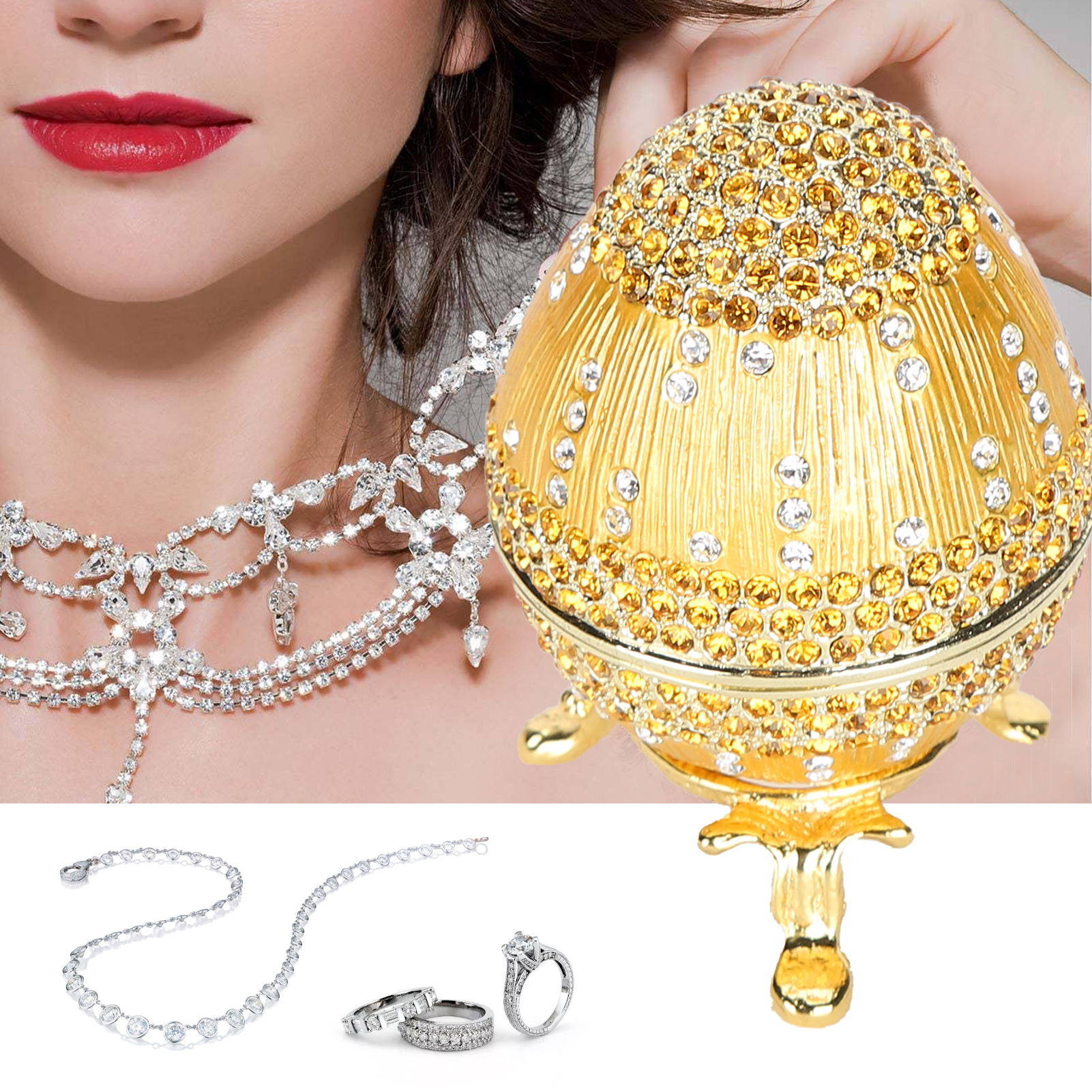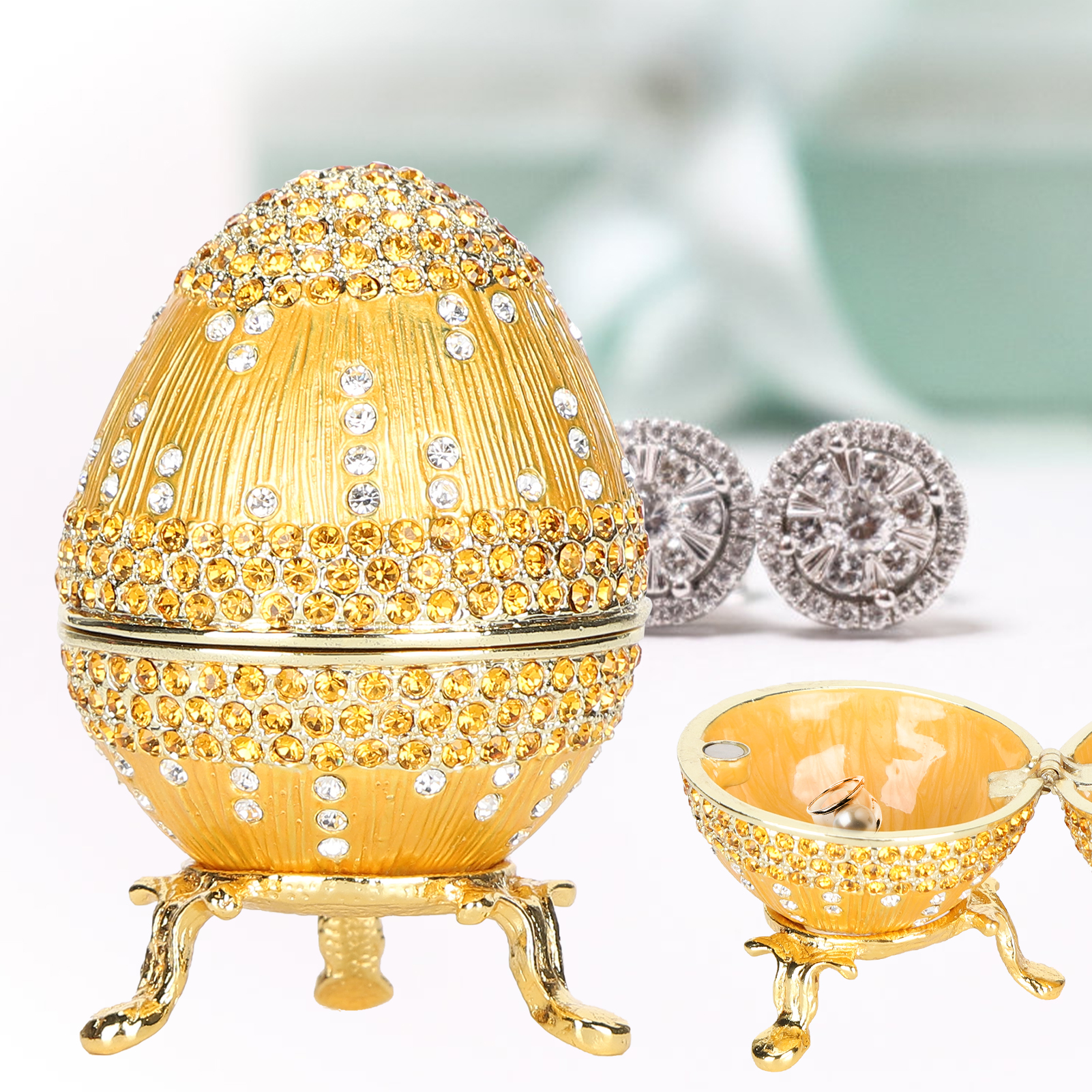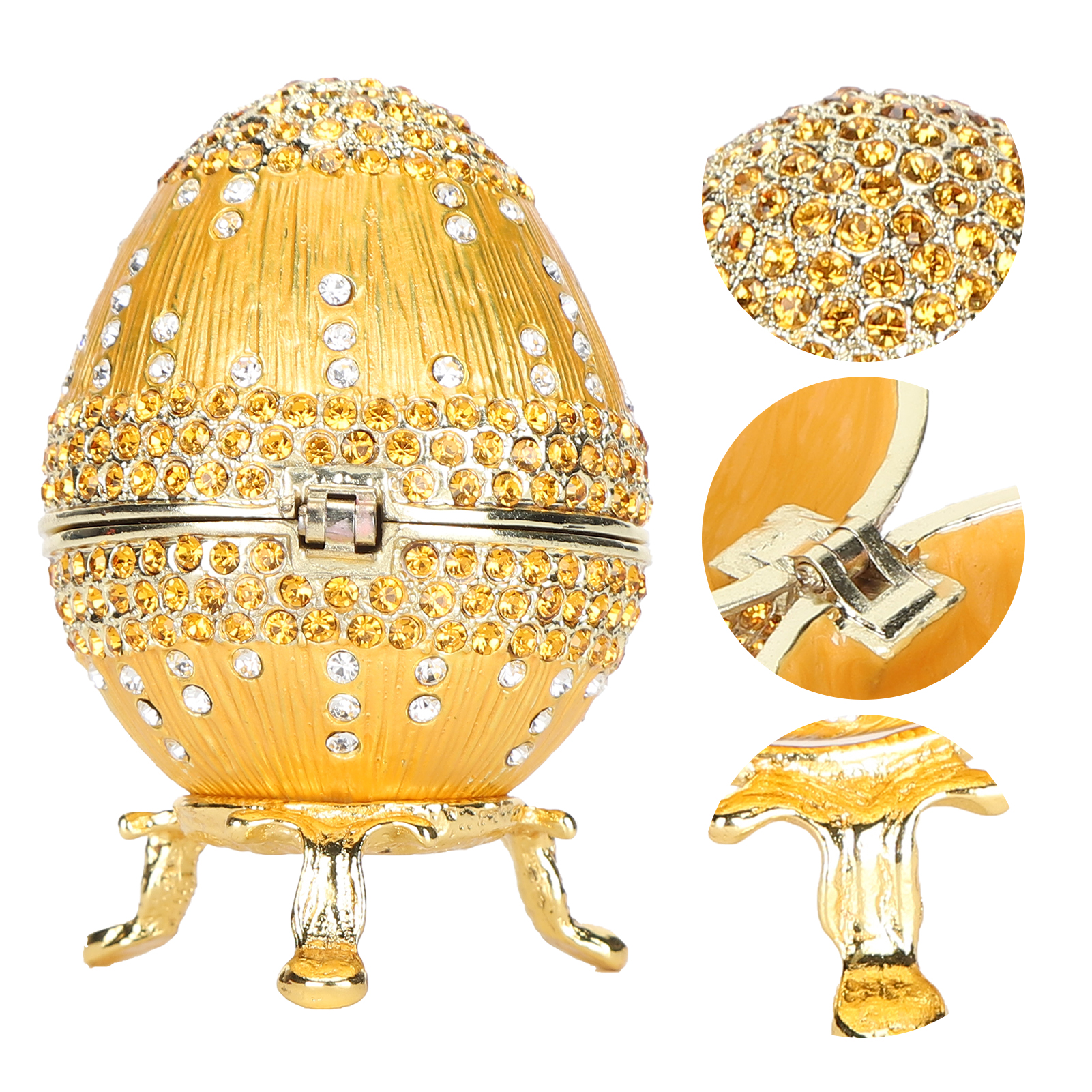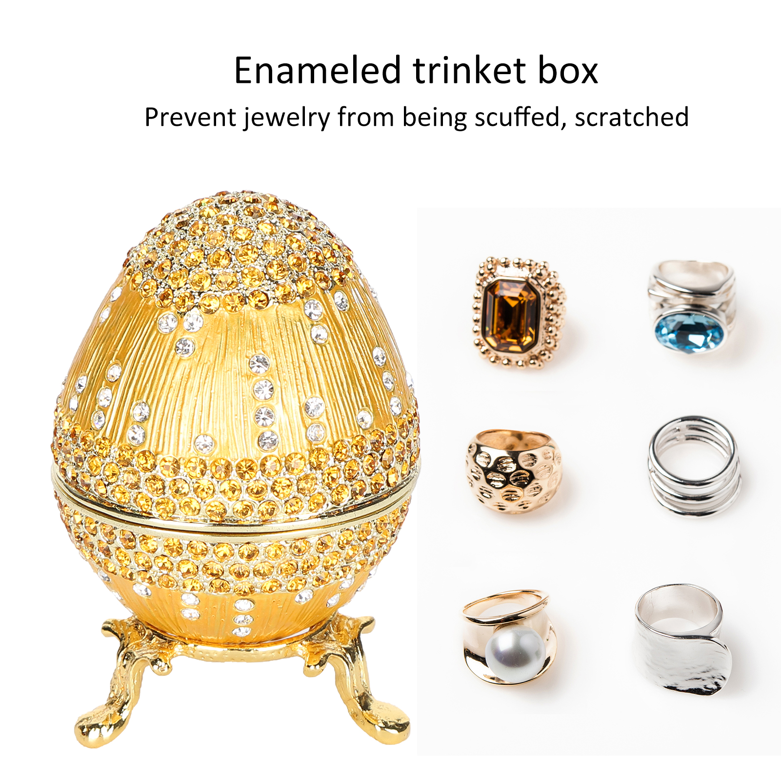 1、The special jewelry box is very suitable for jewelry display and collection, art collection, or storing other small accessories. 2、Enameled trinket box made of high‑quality zinc alloy with rhinestones has luxurious style which is perfect for gifts. 3、The box can also prevent your jewelry from oxidation or being scuffed, scratched, damaged, and make jewelry last longer. 4、The golden glittering appearance embellishes the jewelry with a noble and luxurious feeling. 5、The egg‑shaped hinged jewelry box will be packed well in case, so it is perfec for Mother's day, birthday or any other holidays and events.