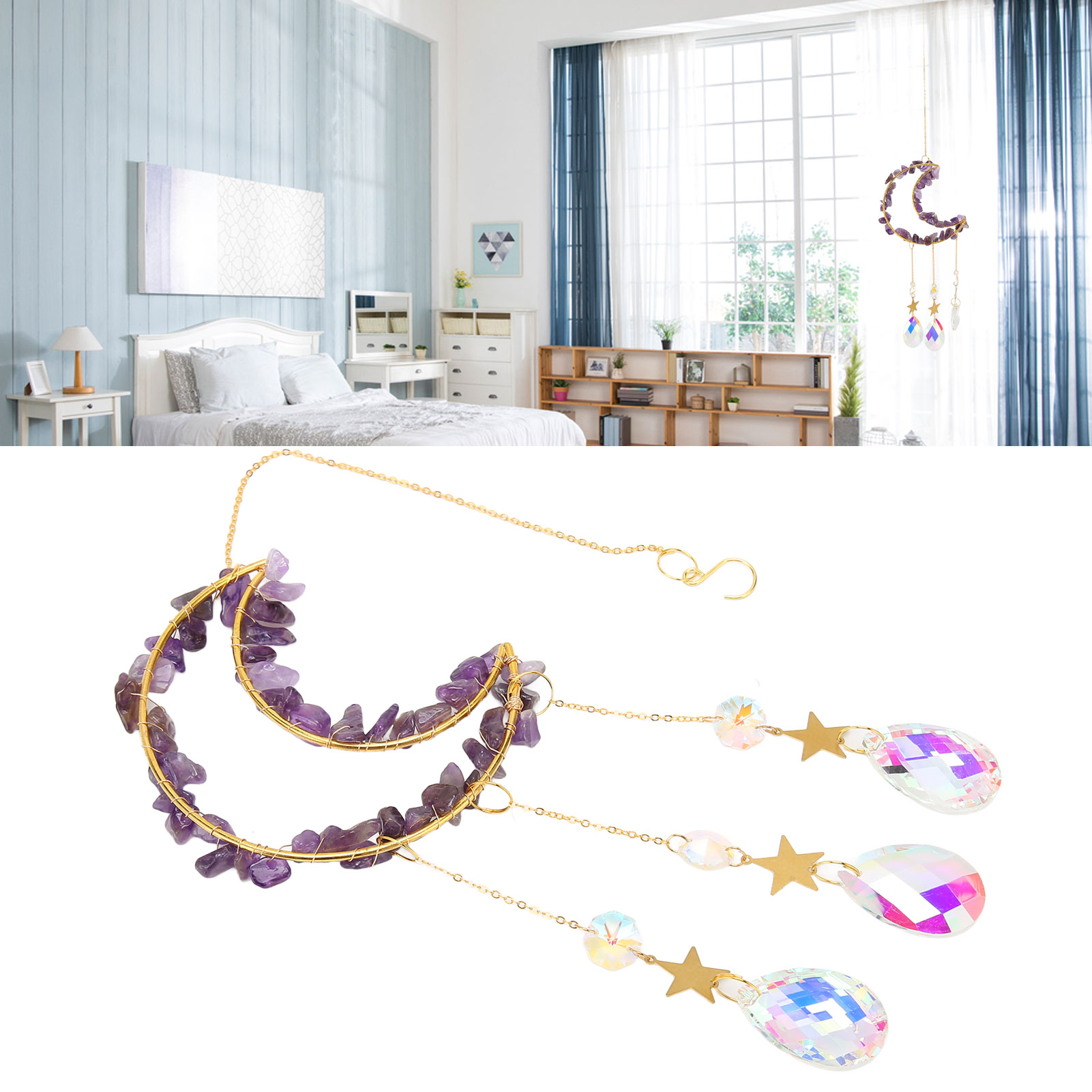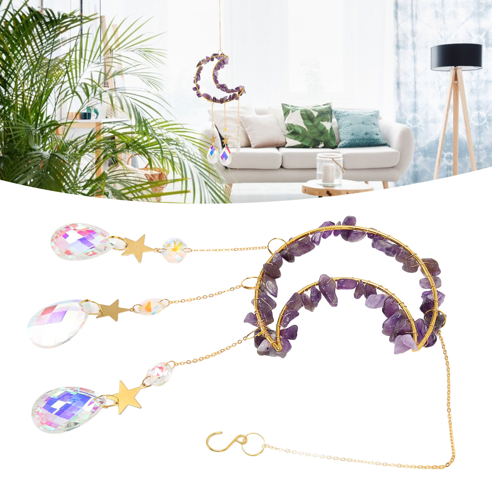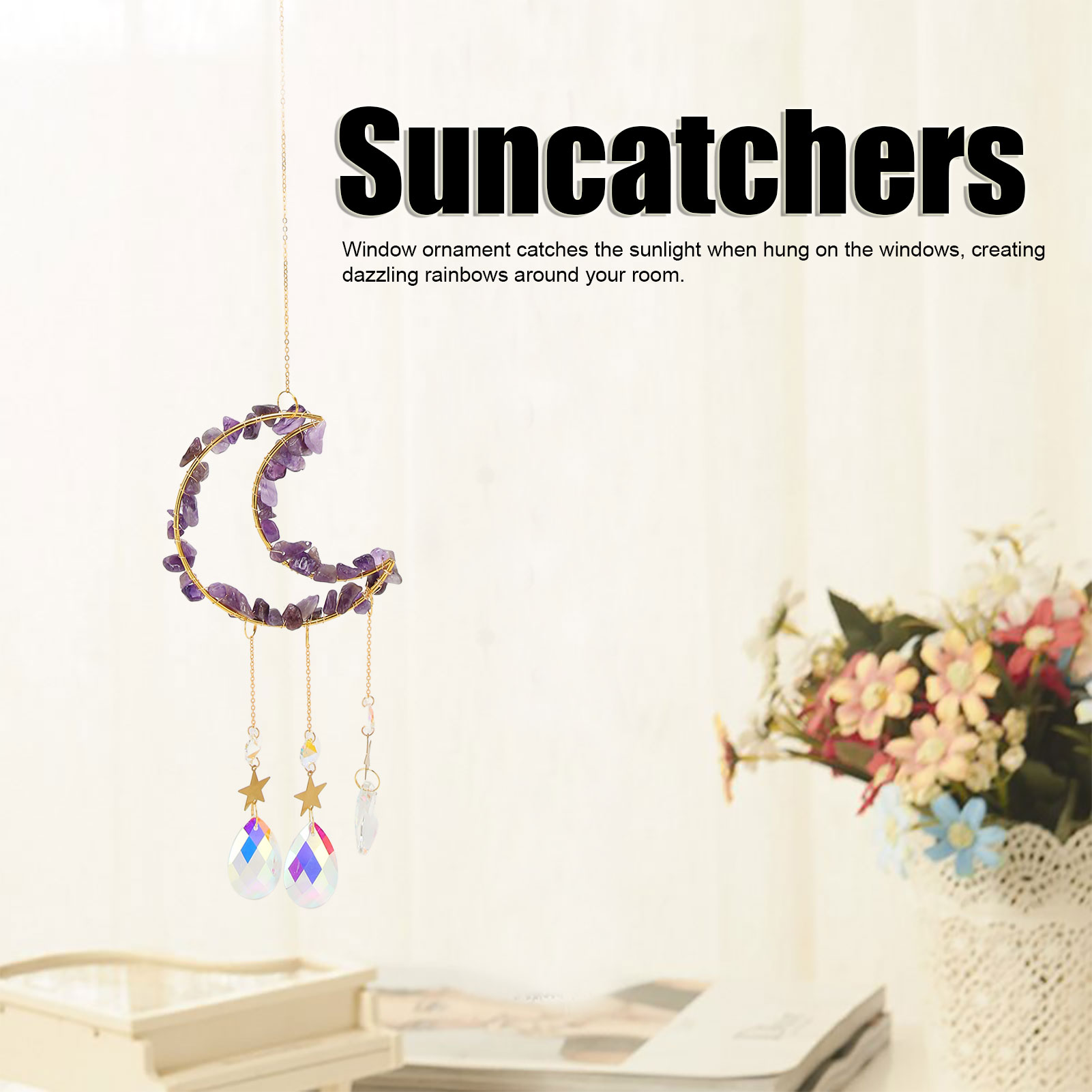 1、Catch Sunlight: Window ornament catches the sunlight when hung on the windows, creating dazzling rainbows around your room. 2、Beautiful: Crystals suncatcher can add beautiful shiny details to every corner around your house to attract and surprise your guests. 3、Decorative: Moon suncatcher is best decorated when in direct sunlight and is a sparkling decorative item for indoor and outdoor use. 4、Multi Scene Applicable: Moon suncatcher crystal prism is suitable for fitting home decoration, garden, window decoration and many other scenes. 5、Perfect Gift: Crystals suncatcher is a perfect gift for weddings, birthdays, anniversaries, Valentine's Day, Mother's Day, housewarming, Thanksgiving, Christmas.