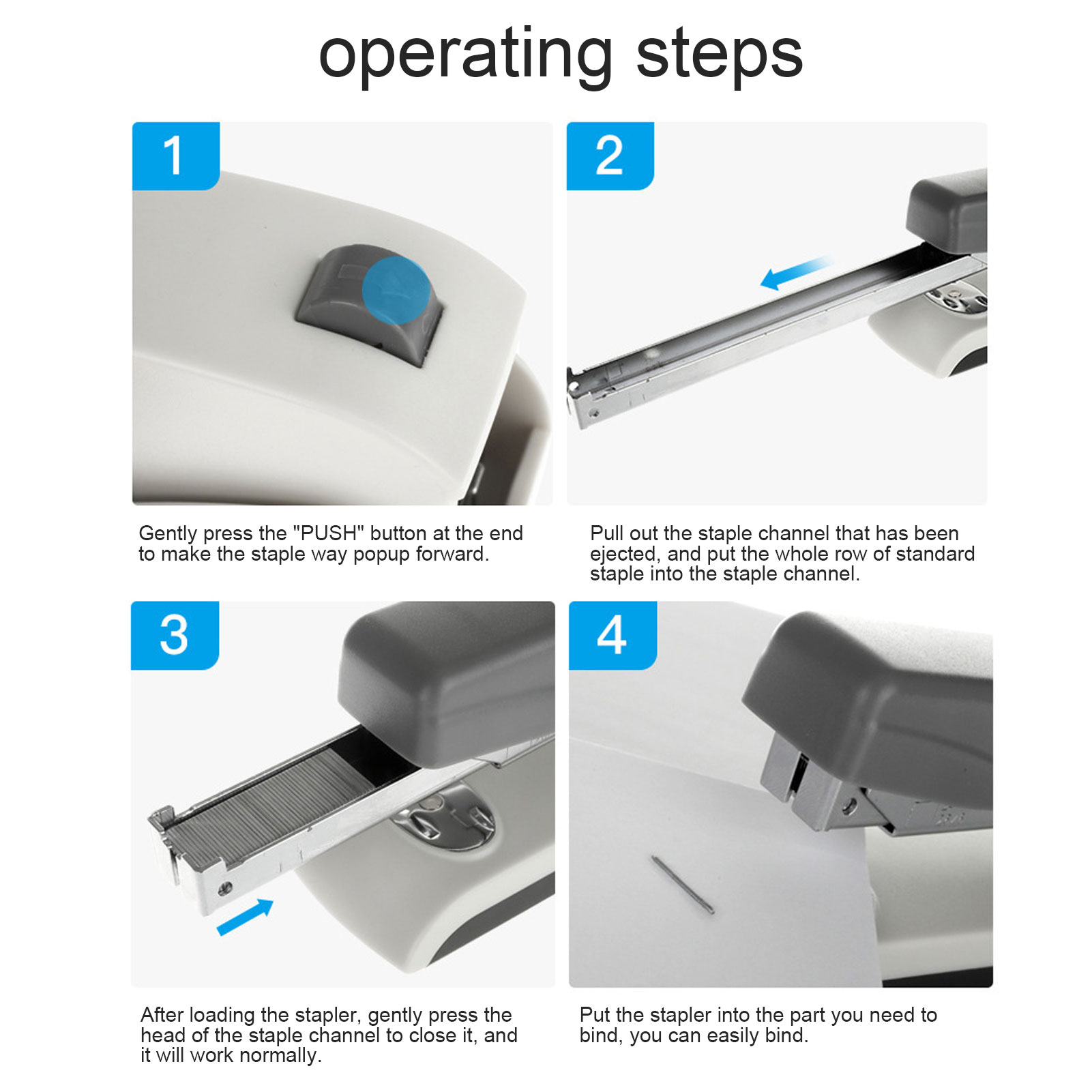 1、Ergonomic Design: Stapler adopts ergonomic design, high quality handle, the handle fits the palm of the hand, the binding is labor saving and the arc is soft, and the hand feels comfortable. 2、100 Stitch Binding Number: Temporary binding, long term binding can turn the needle trough, 100 stitch binding number, multi stitch storage, can meet different binding needs. 3、Needle Storage Compartment: The Stapler is designed with an ingenious structure, and the soft rubber storage needle compartment at the bottom is convenient for needle storage. When you need it, it can be replaced at any time. 4、Simple Operation: Stapler front mounted needle loading structure, simple and quick to complete the needle loading with one push and one push. Finger press binding, easy, efficient and fast. 5、Nonslip Soft Bottom Pad: Feel more comfortable, the bottom is designed with nonslip soft bottom pad, which makes it stable when binding documents.