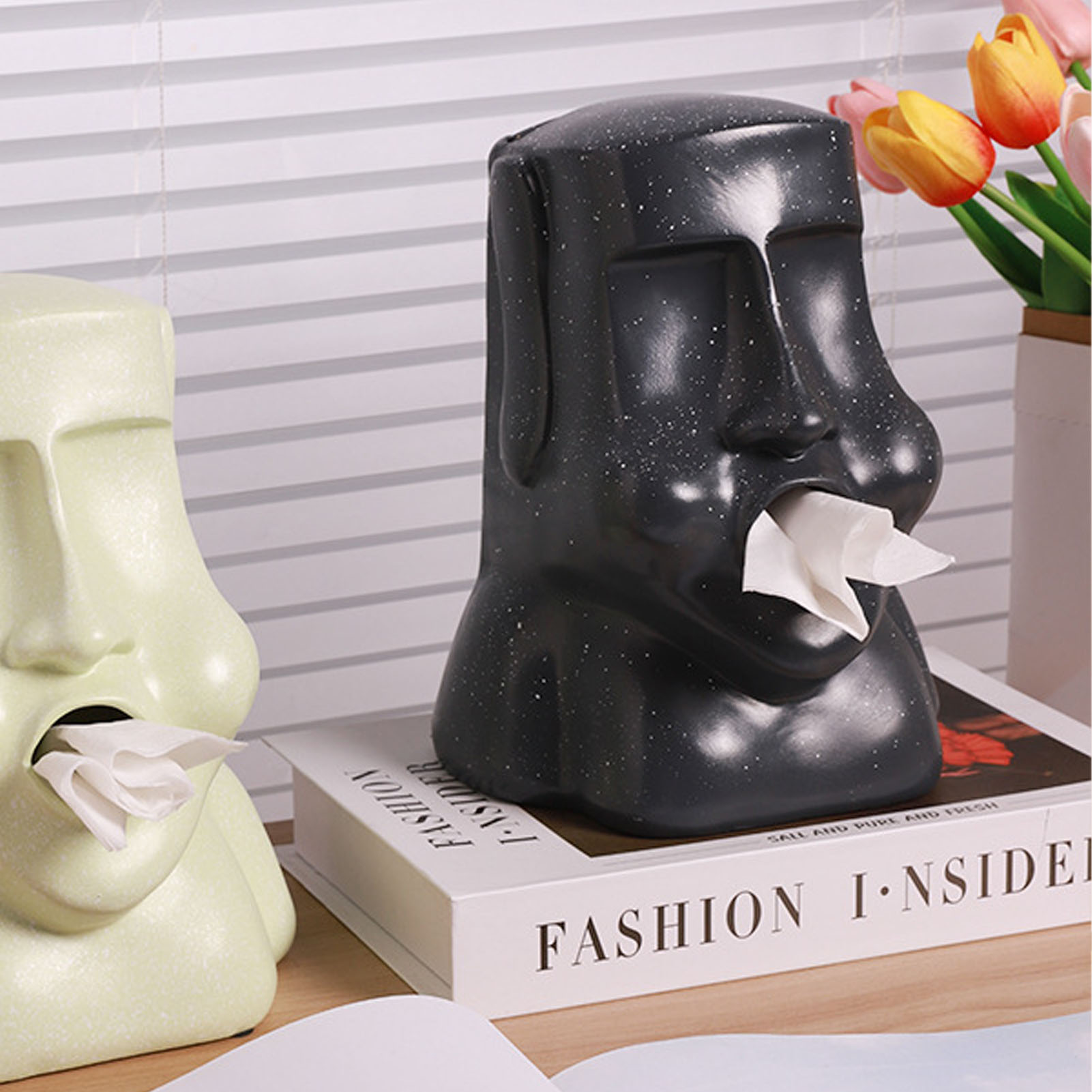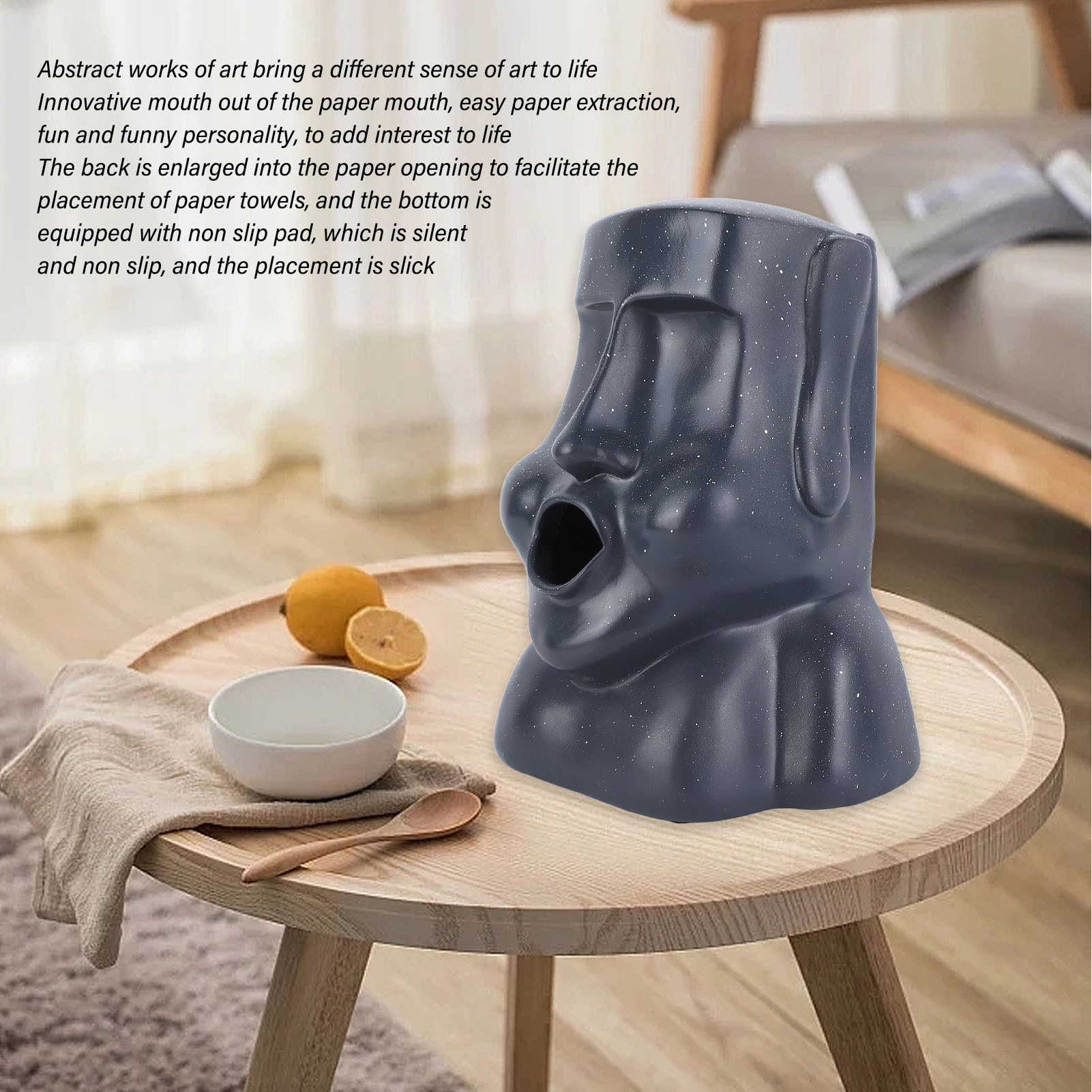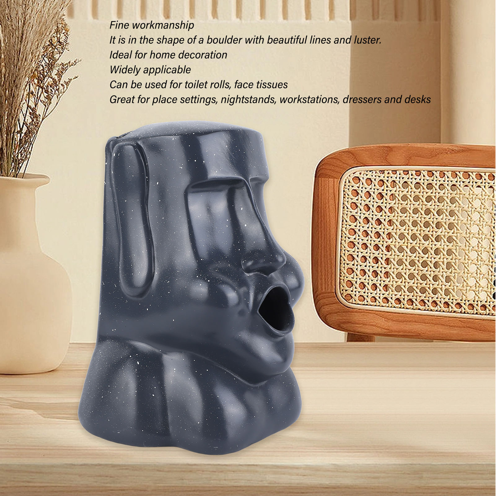 1、Innovative Look: Tissue box has a innovative mouth outlet, easy paper extraction, fun and quirky personality, adding fun to life. 2、Large Opening, Anti Skid Pad: The back of the tissue box has a large opening for easy placement of paper towels, and the bottom has an anti skid pad for quiet, non slip, and stable placement. 3、Exquisite Look: Tissue box is made of fine workmanship, its shape is in the shape of a boulder, its lines and luster are very beautiful, ideal for home decoration. 4、Wide Application: Tissue box can be used for toilet rolls, face tissues, perfect for table tops, nightstands, workstations, dressers and books. 5、Resin Material: The tissue box is made of premium resin material, safe and eco friendly, durable and long service life.
