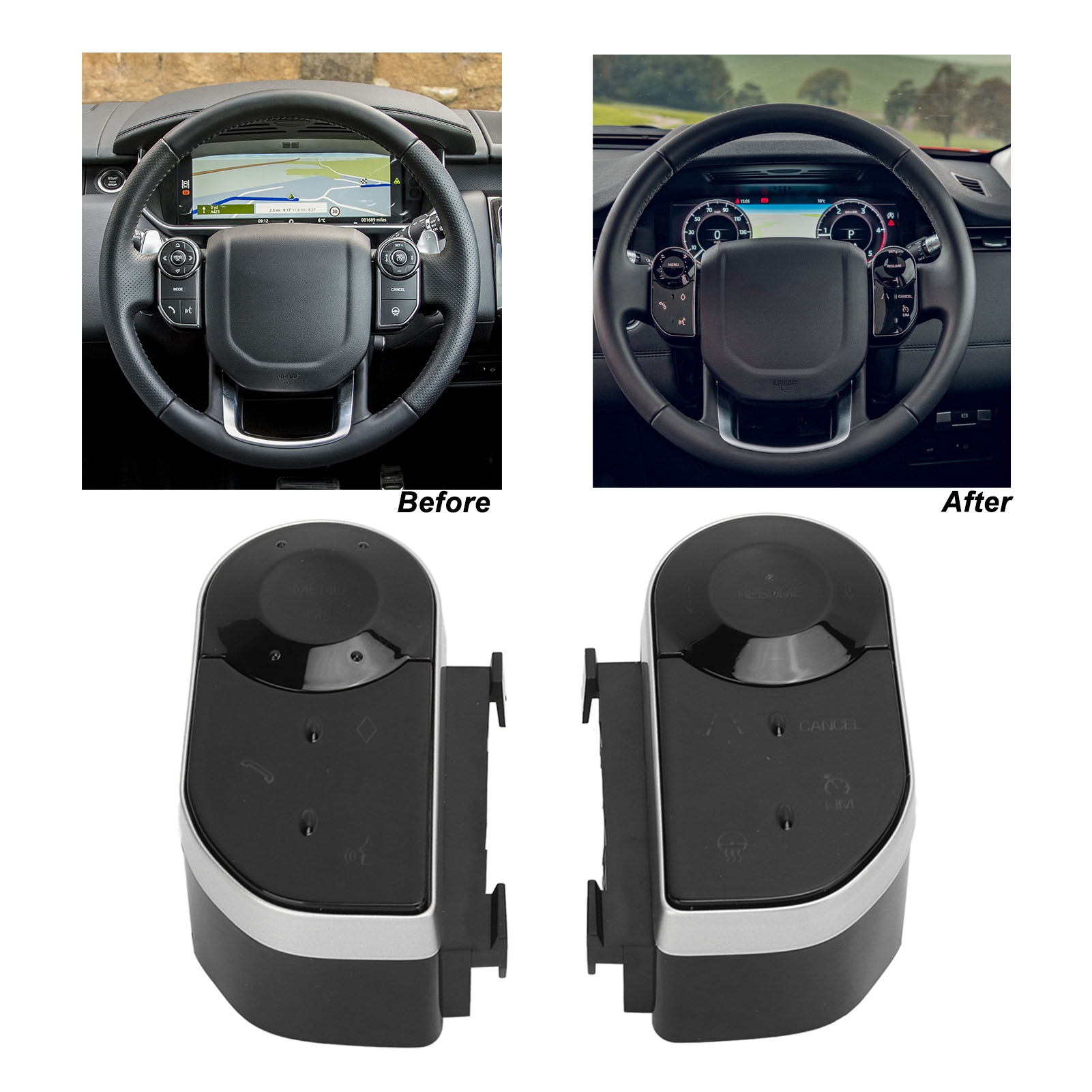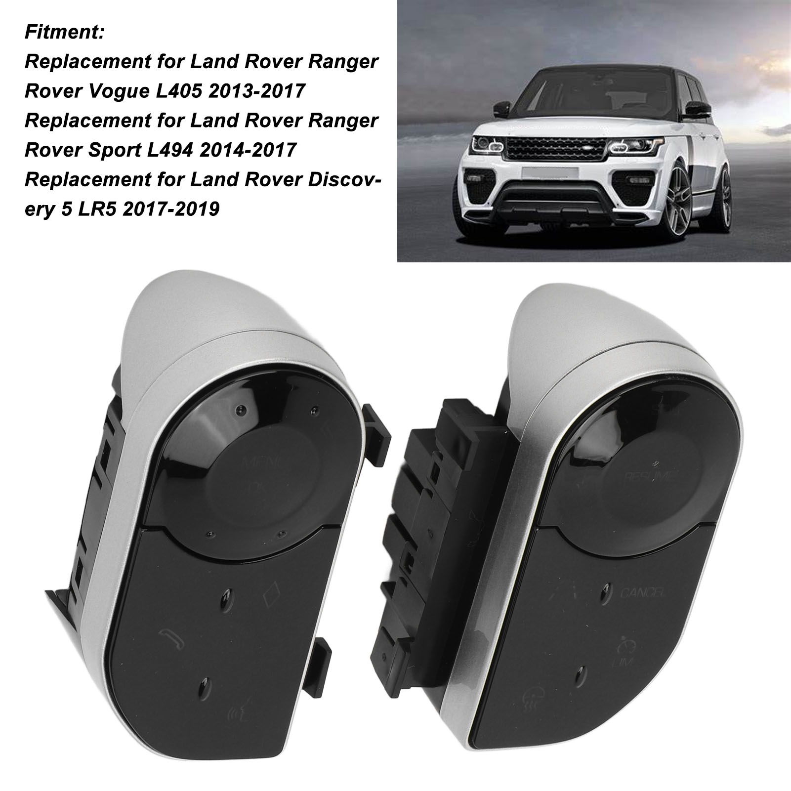 1、Fitment: The steering wheel touch button is a replacement for Land Rover Range Rover Vogue L405, replacement for Land Rover Discovery 5 LR5. 2、Excellent Material: The steering wheel key button is made of high grade ABS and metal material, which has high strength, wear resistant with smooth surface. 3、Fine Workmanship: Professional designed, each button has a clear pattern, and buttons will not affect each other, and the control response is fast. 4、Seamless Design: This key button can fit the steering wheel of the car tightly, leaving no gaps, and it is maintaining the original car model. 5、Installation: Simply remove the button on the steering wheel that was broken or unresponsive , and connect this button in the same wiring way.