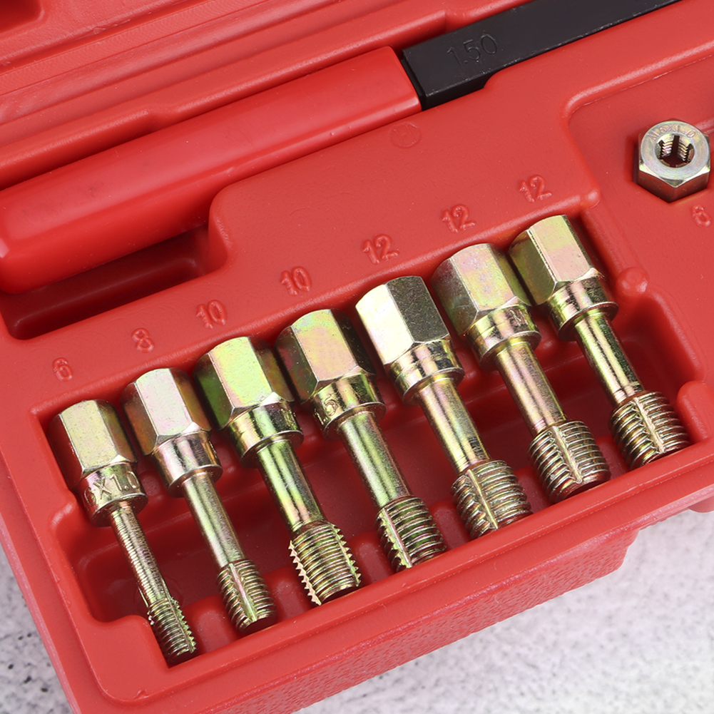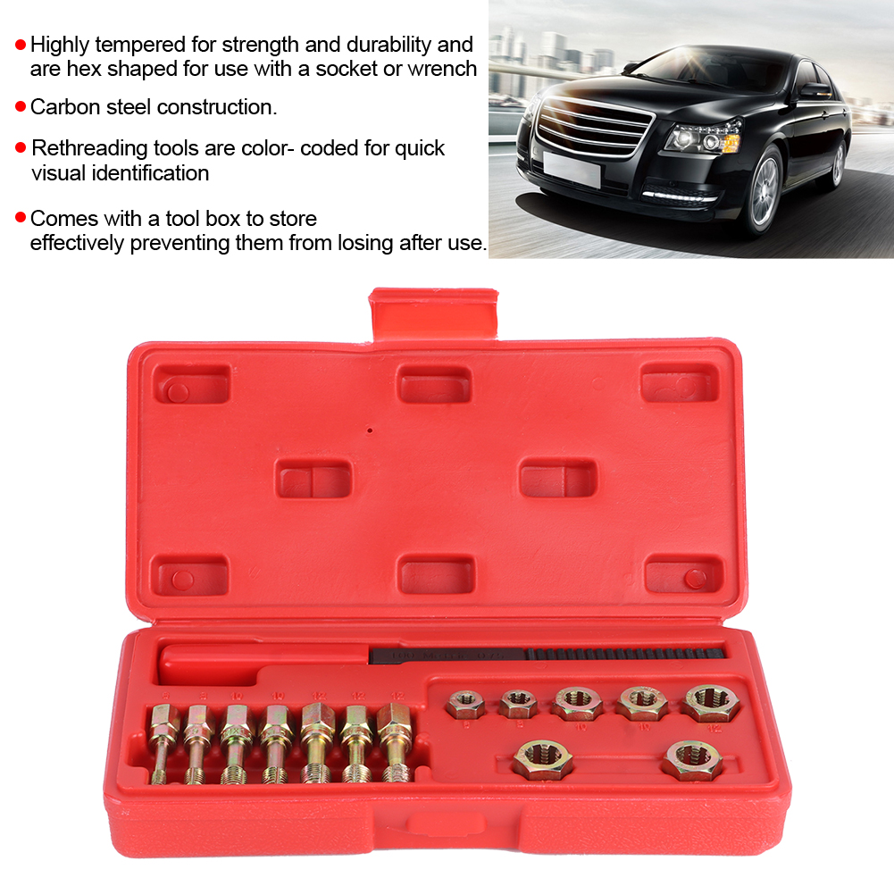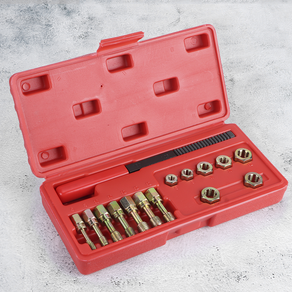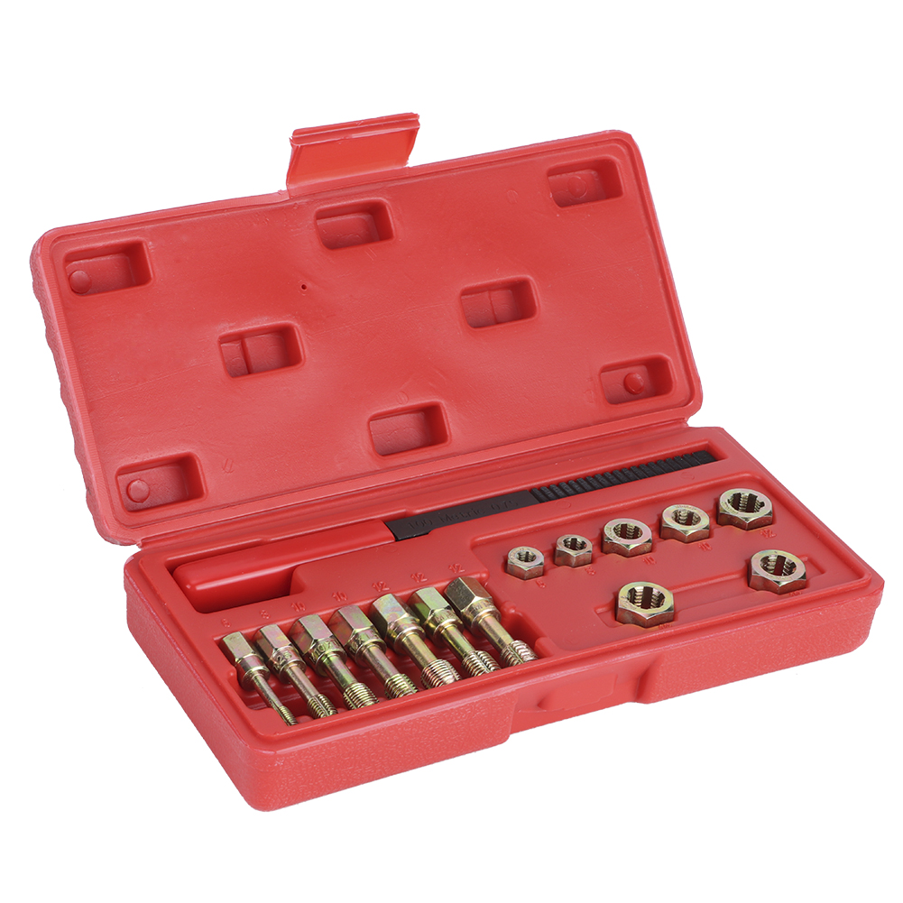 1、Highly tempered for strength and durability, more reliable and practical in use. 2、This thread repair tool kit is hex shaped for use with a socket or wrench. 3、Manufactured with the highest quality carbon steel materials for maximum durability. 4、Rethreading tools are color‑ coded for quick visual identification, offering you convenience. 5、Comes with a tool box to store, effectively preventing them from losing after use.