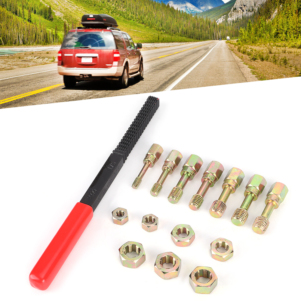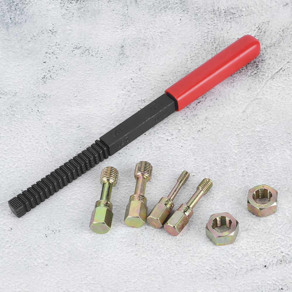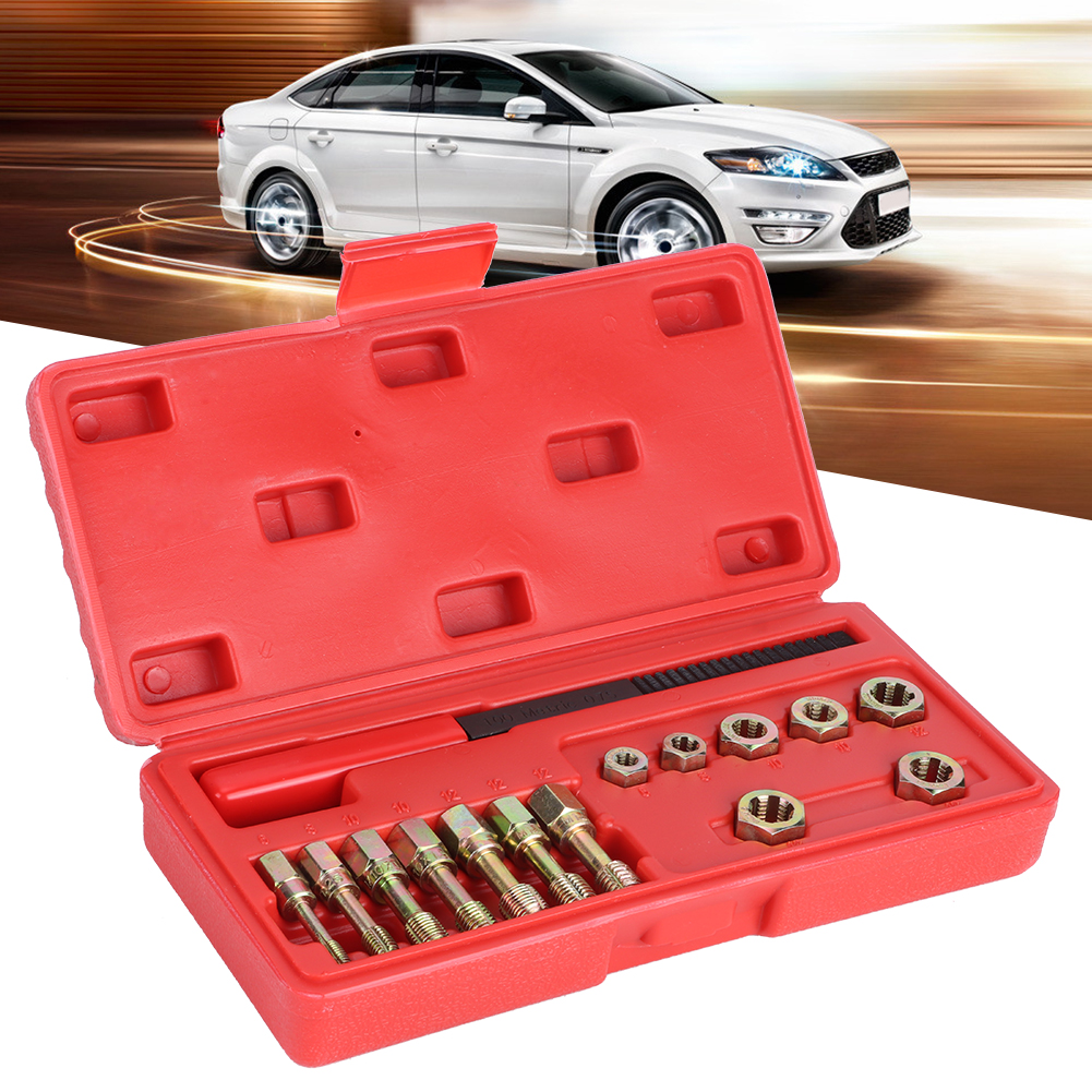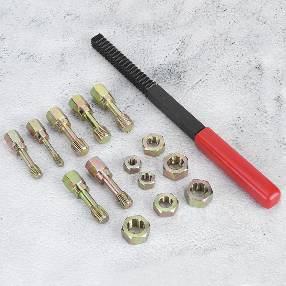 1、Highly tempered for strength and durability, more reliable and practical in use. 2、This thread repair tool kit is hex shaped for use with a socket or wrench. 3、Manufactured with the highest quality carbon steel materials for maximum durability. 4、Rethreading tools are color‑ coded for quick visual identification, offering you convenience. 5、Comes with a tool box to store, effectively preventing them from losing after use.