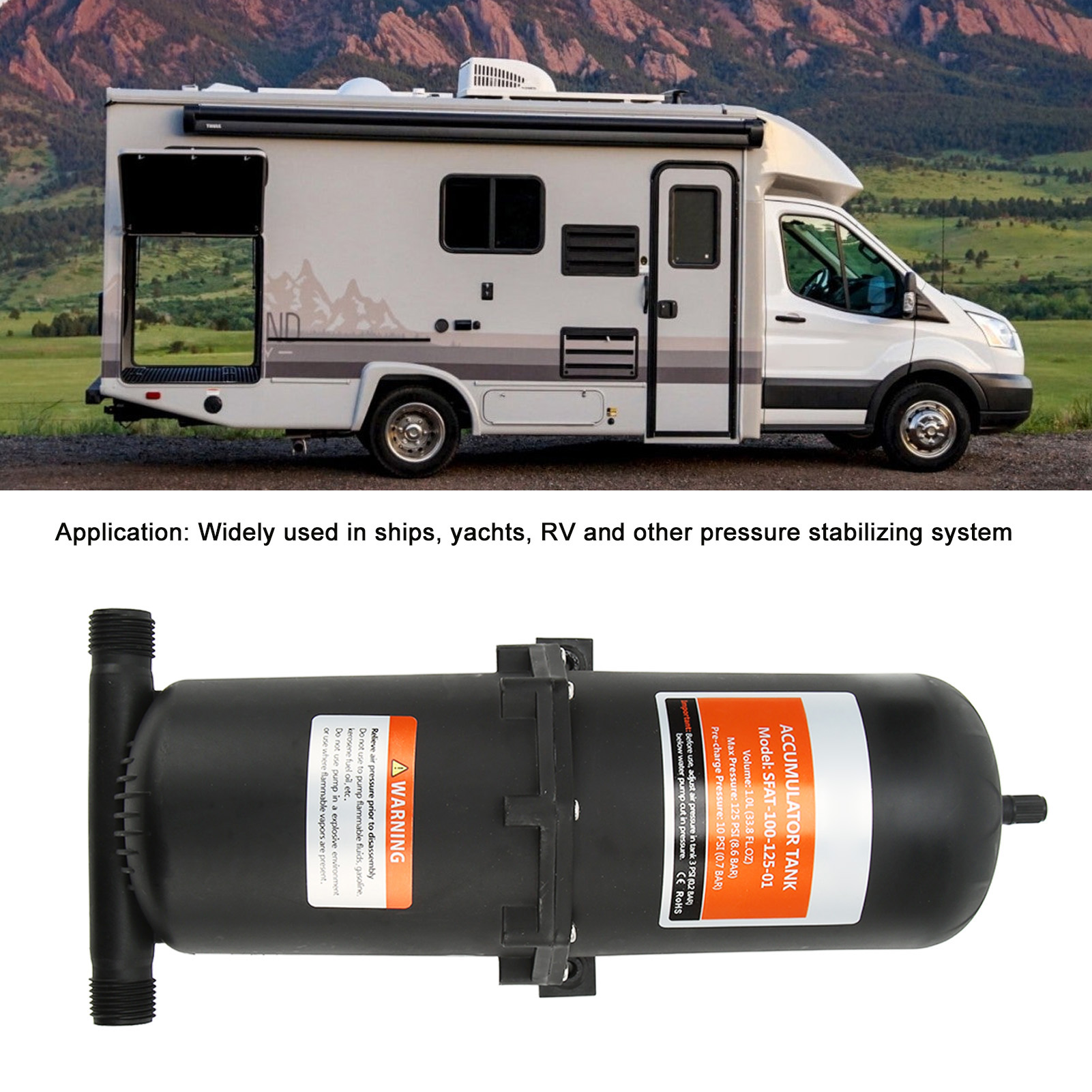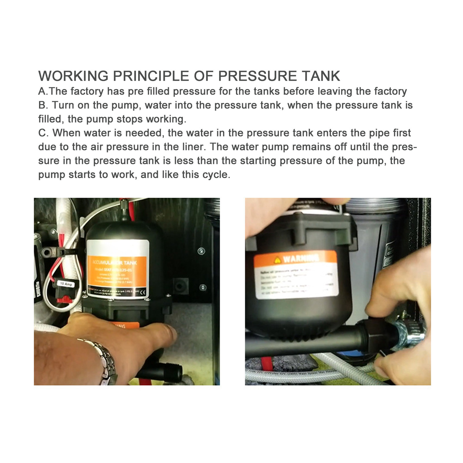 1、Function: The pressure tank can effectively absorb excess heat entering the water system line due to the heater. 2、Performance: When the RV is used for a long time resulting in water leakage, the pressure tank can effectively reduce the frequent start of the pump. 3、Constant Pressure: Accumulator tank has a constant pressure, which prevents the system pressure from going up and down. 4、Strong Cushioning: The rubber liner has a strong seal and plays the role of pressure stabilization and buffering, making the water flow more smoothly. 5、Outstanding Features: Small and delicate, low noise, detachable, easy to carry, low power consumption and long service life.