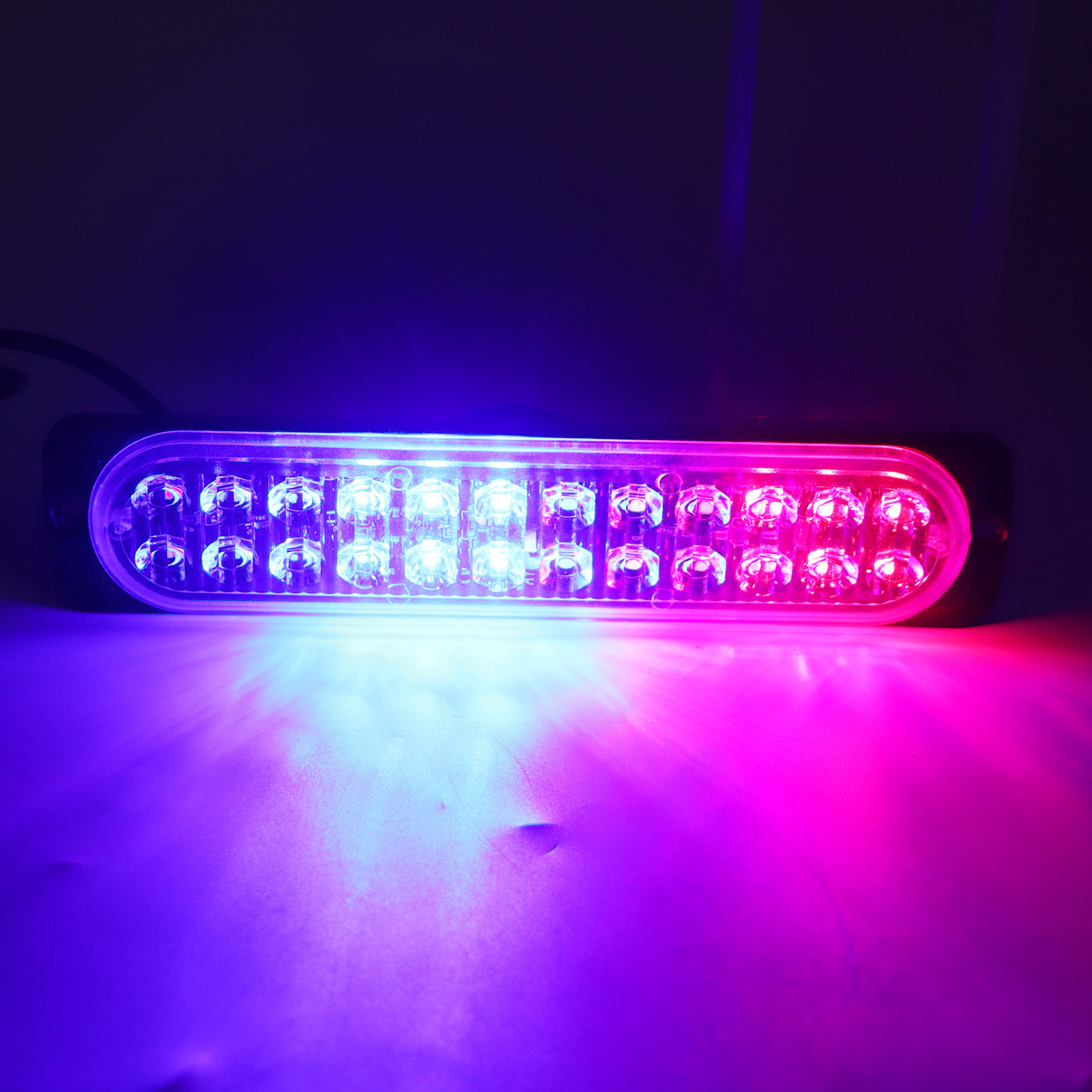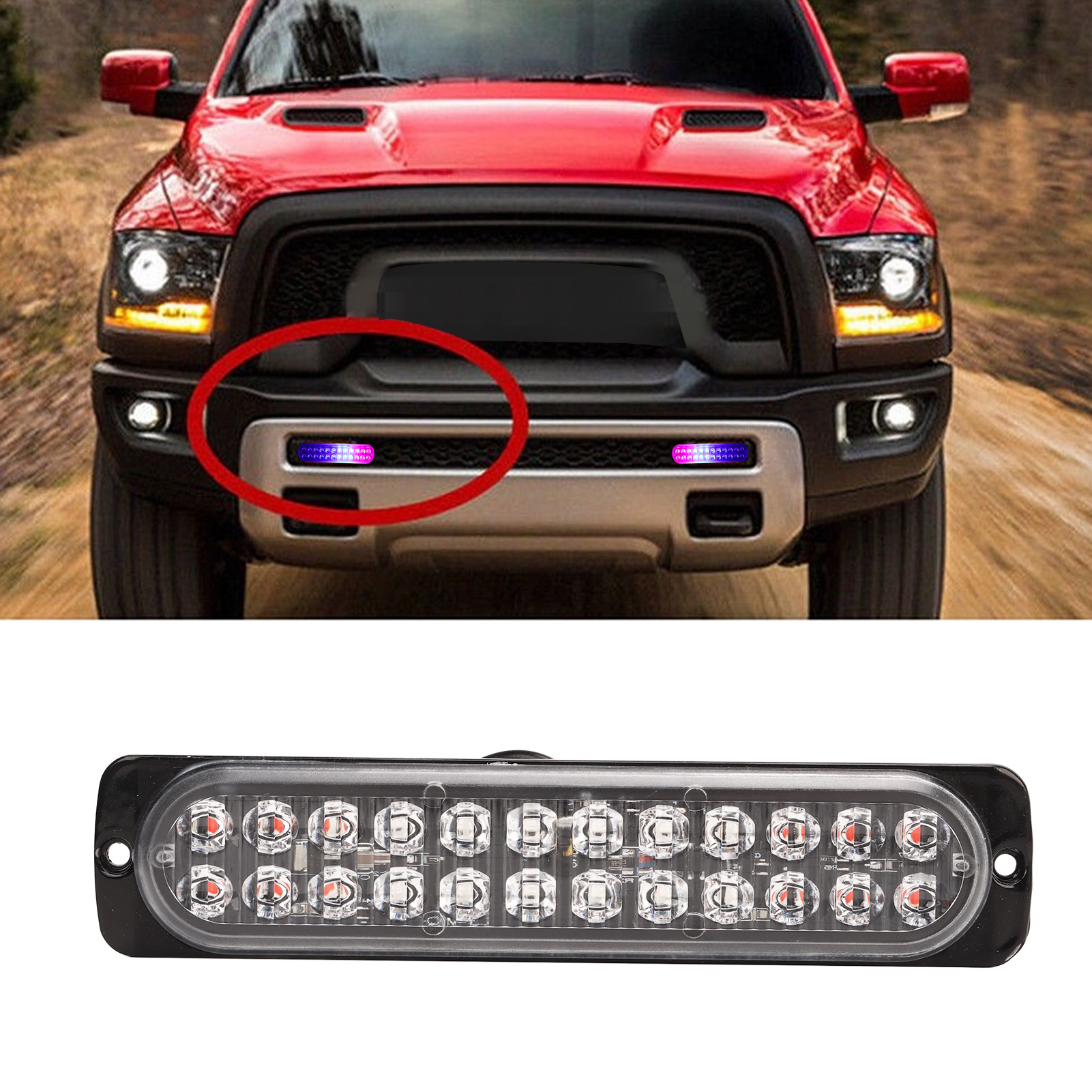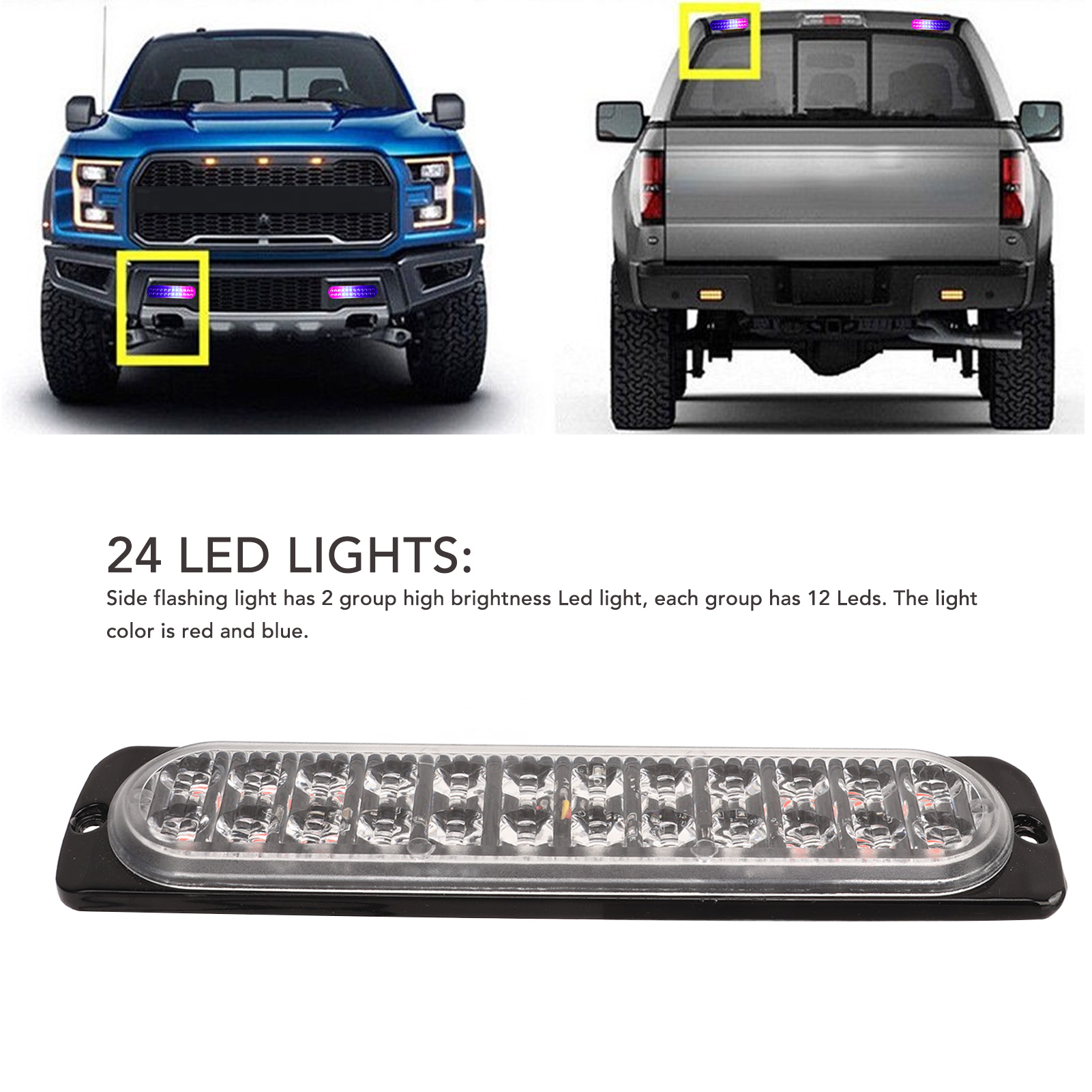 1、24 LED Lights: Side flashing light has 2 group high brightness Led light, each group has 12 Leds. The light color is red and blue. 2、High Visibility: Having high visibility during the day, at midnight, in rain or fog. Improve drive security and avoid accidents. 3、Weather Resistant: These lights can withstand severe weather conditions, IP67 waterproof rating, moisture and vibration protection for your driving escort. 4、Durable: Strobe light bar has over 50,000 hours life span because of the better production process, which is a economical choice for you, no need frequent replacement. 5、Easy to Install: Strobe light comes with nuts and screws for mounting to the grille or bumper. Common to all vehicles in 12 or 24V, can be installed in every position of the vehicle.