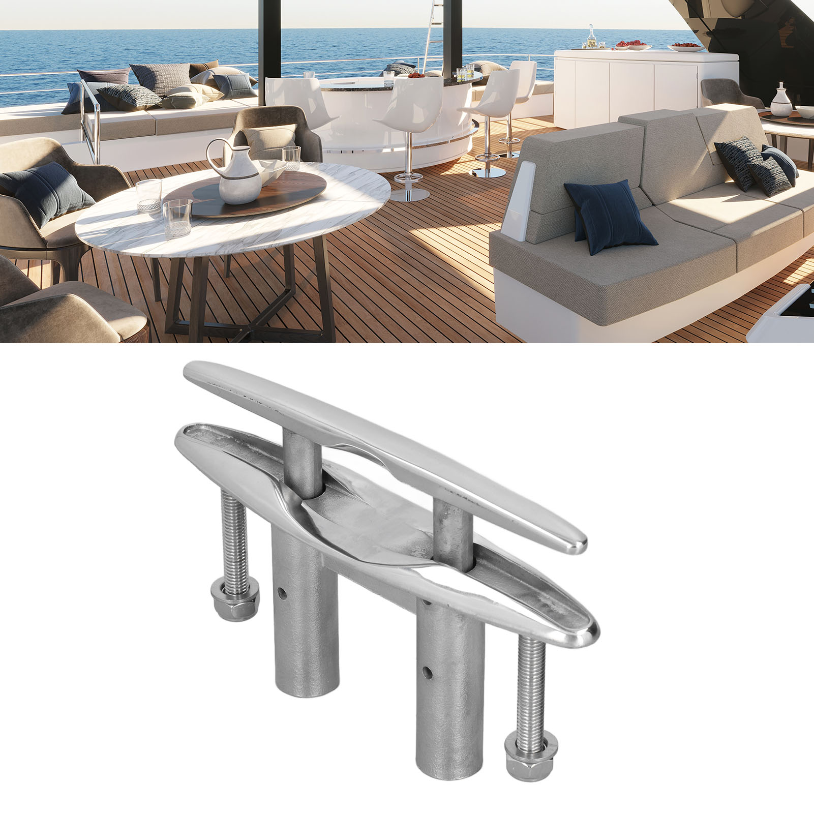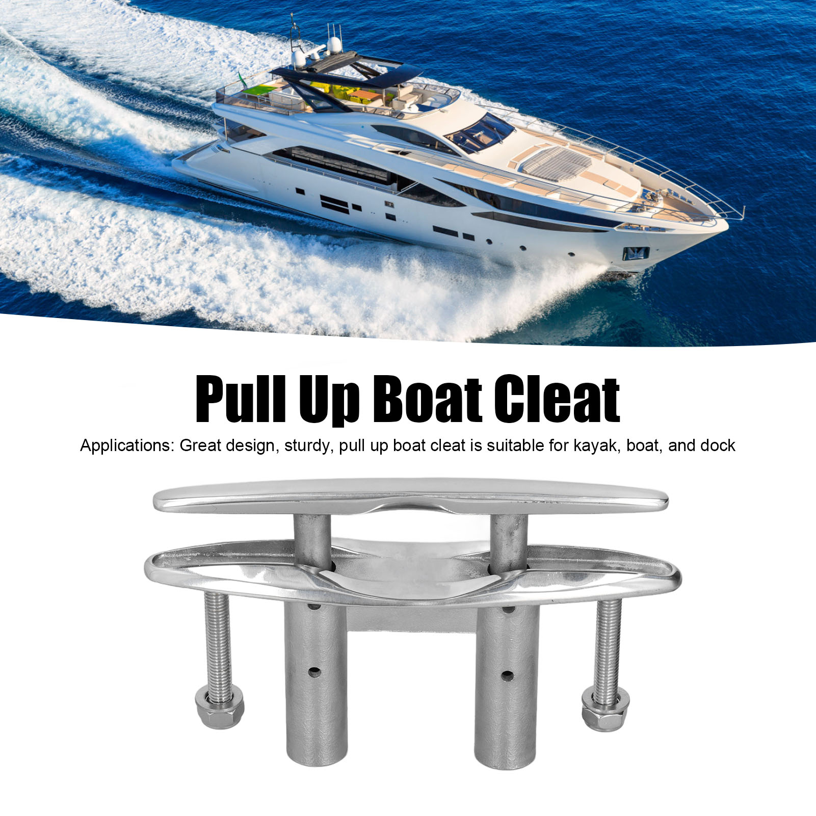 1、Applications: Great design, sturdy, pull up boat cleat is suitable for kayak, boat, and dock. 2、Function: Flush mount marine cleat is perfectly fit for securing dock and anchor lines. 3、Highly Polished: With highly polished treatment can give the boat cleat a beautiful mirror like finish. 4、Premium Material: Made of 316 stainless steel, excellent seawater corrosion resistance, high oxidation resistance and durability. 5、High Reliability: With elaborate manufacturing technology, has high reliability and stable performance.