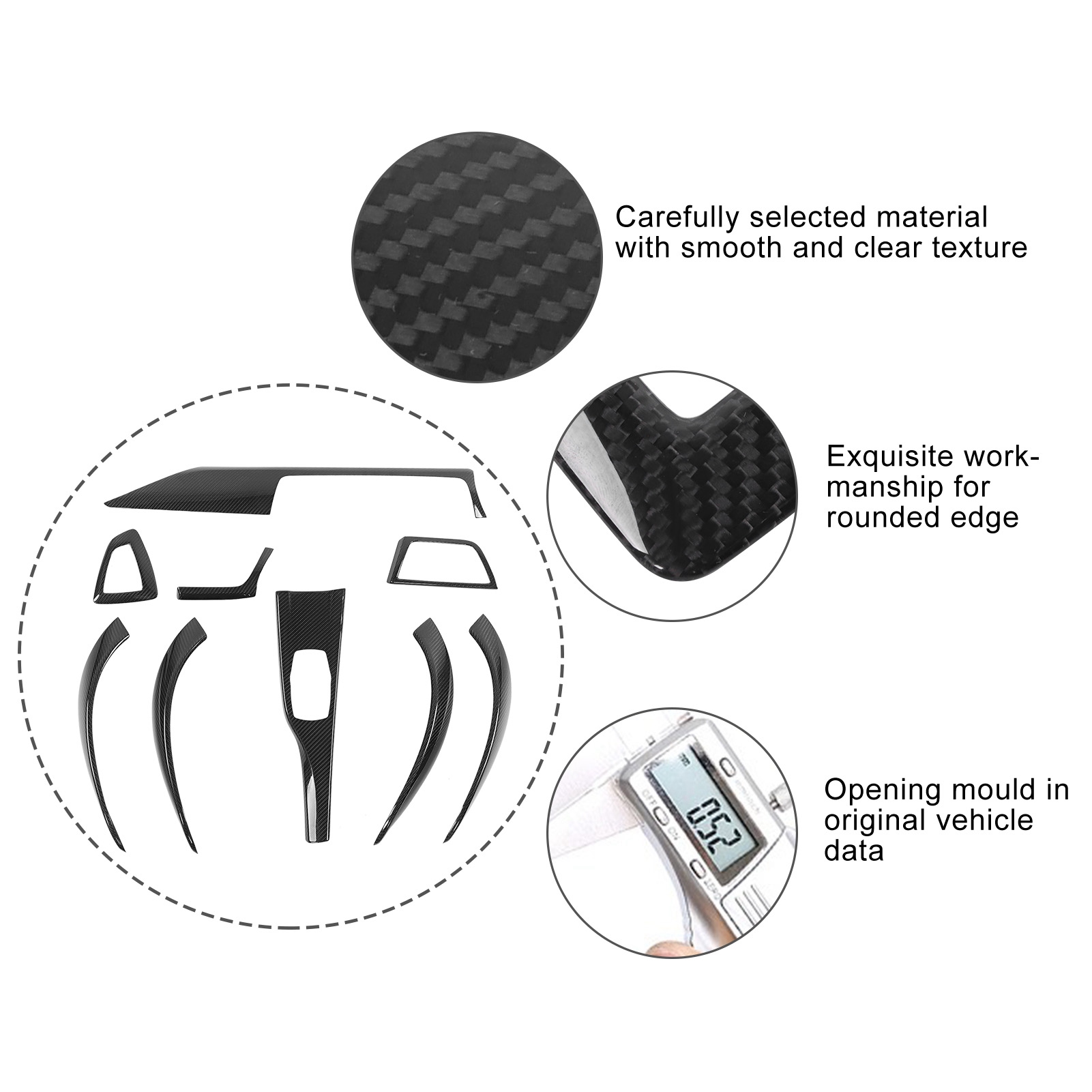 1、Total 9pcs interior trim kit, allows consistent car interior upgrading with same style and texture of decor sticker. 2、Adopts dry carbon fiber material, 3K twilled weaving, brings a sense of luxury and elegance, you can enjoy the aesthetics of carbon fiber. 3、Advanced hot‑pressing tank forming technology for superior anti‑ultraviolet, anti‑corrosion and anti‑fouling properties. 4、Super light weight yet durable, effectively protect your car interior from damage, not easy to fade, crack or yellow, can keep your car interior new all the time. 5、The cover is thin enough to keep your original car trims, molded from original car parts, can provides tightly and perfectly matching. 6、Support easy and straight‑forward installation, just peel off and stick, no damage to your car.
