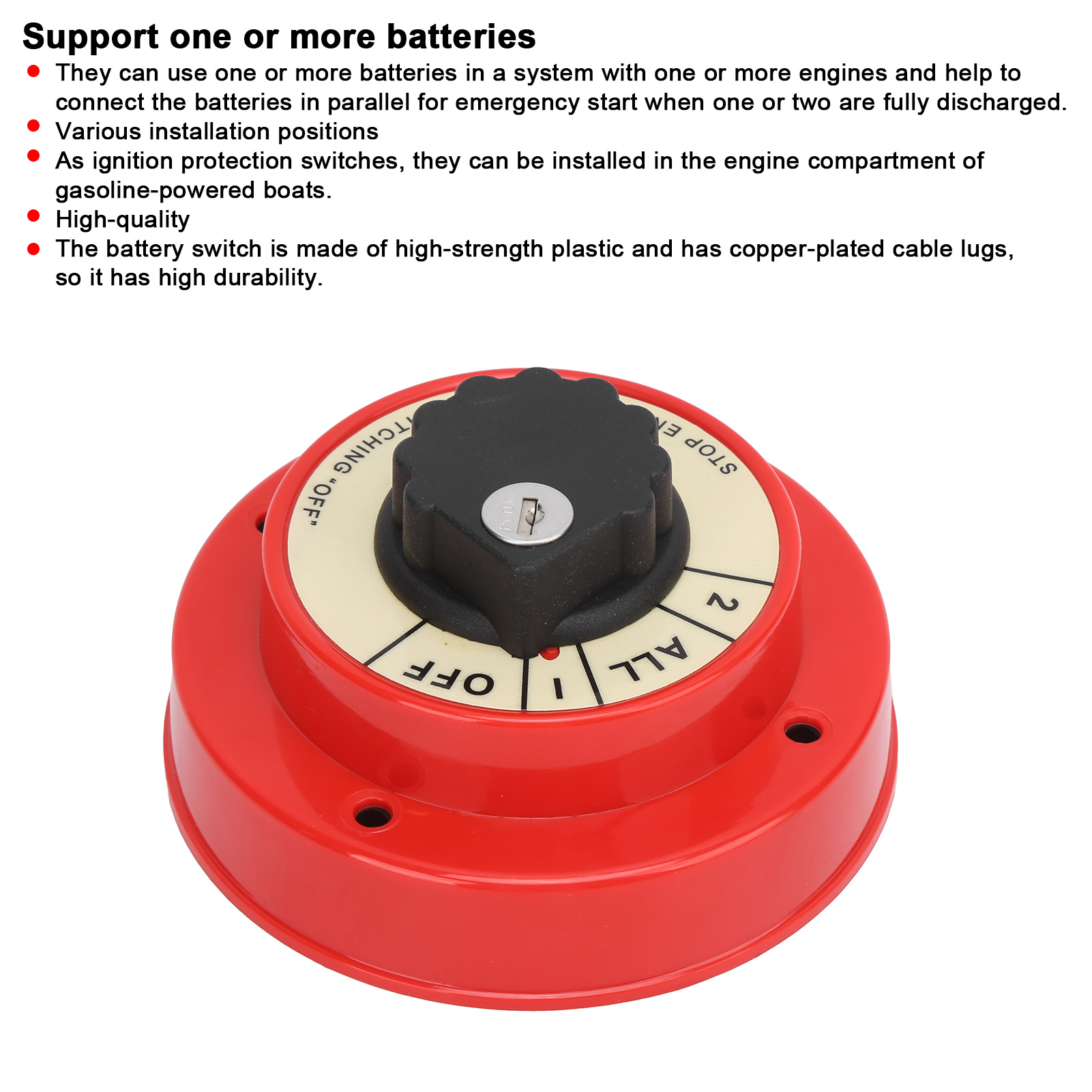 1、The switch can be installed in many positions. As ignition protection switches, it can be installed in the engine compartment of gasoline‑powered boats. 2、Except the functions of the battery disconnect switch, the switch also allows the selection of batteries (two or more) for specific purposes, including starting the engine, running accessories and charging. 3、It allows one or more batteries used in a system with one or more engines and help to connect the batteries in parallel for emergency start when one or two are fully discharged. 4、This dual battery selector switch is made of high‑strength plastic with copper‑plated cable lugs to improve durability. 5、This is a kind of marine hardware assembly, which can be suitable for your boats' switch. And the quality of our product is stable and reliable.