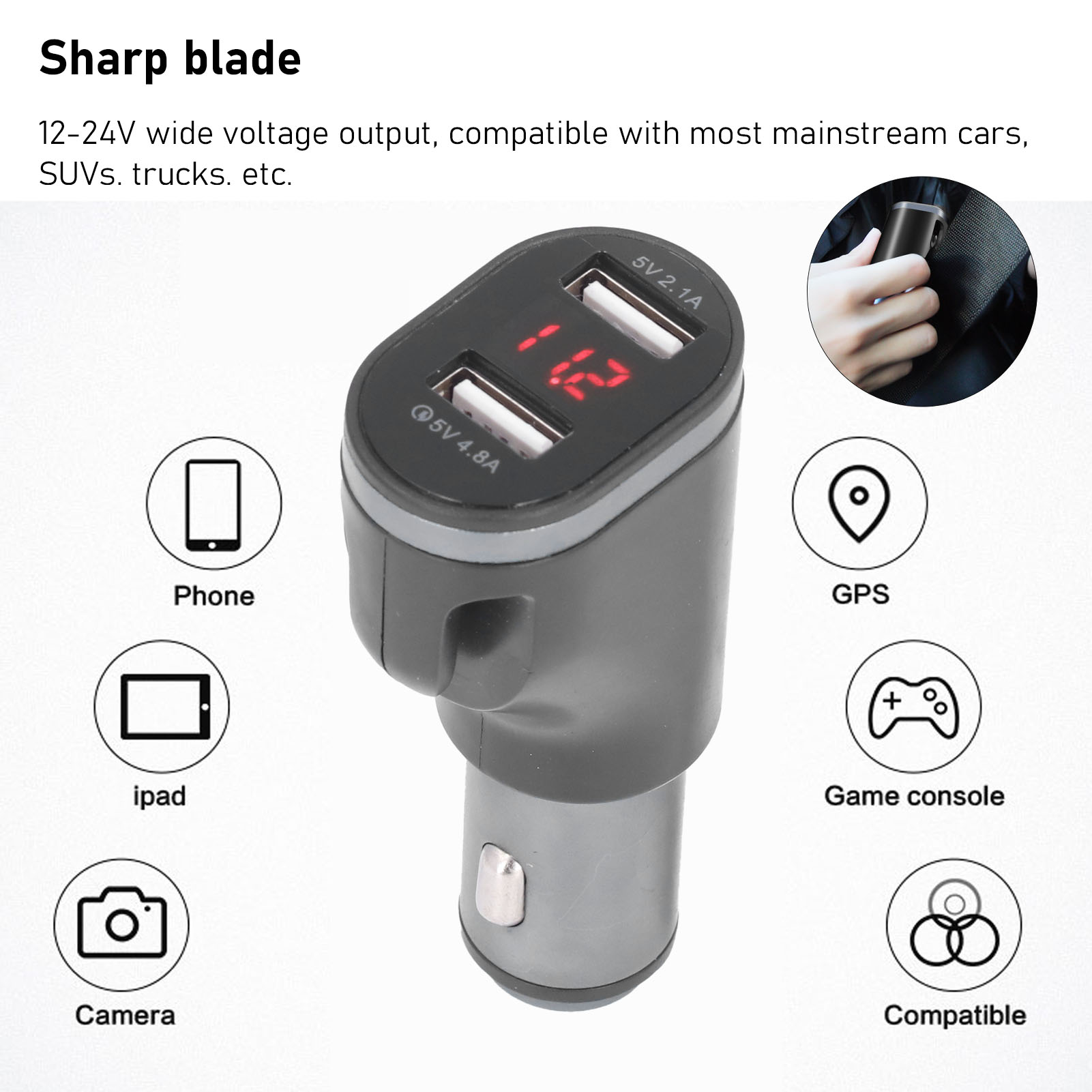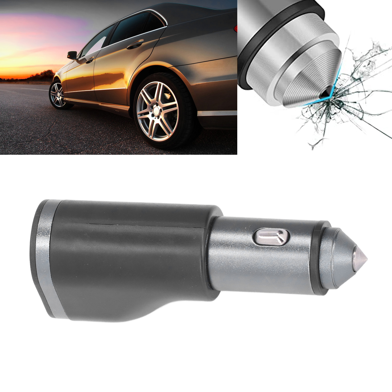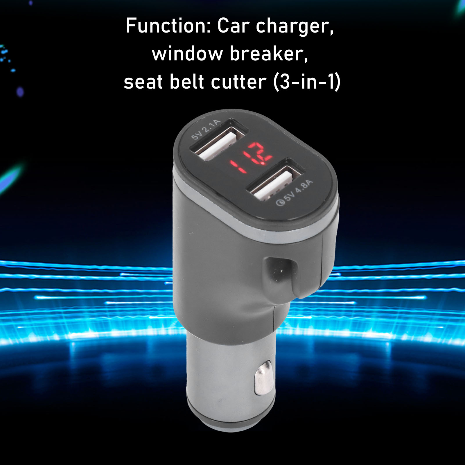 Function: Car charger, window breaker, seat belt cutter (3-in-1)