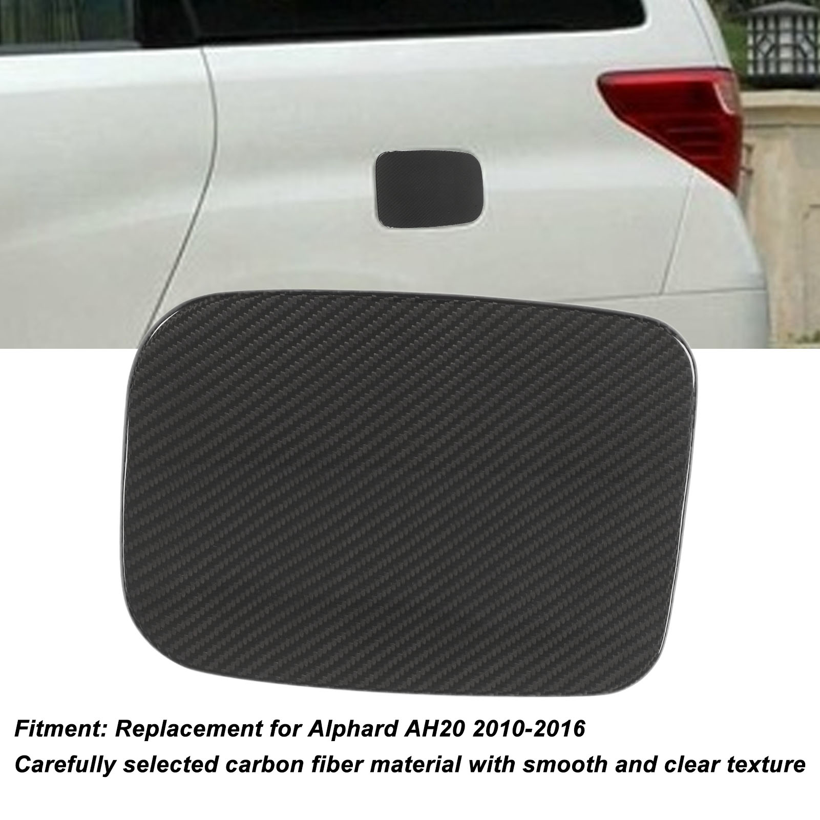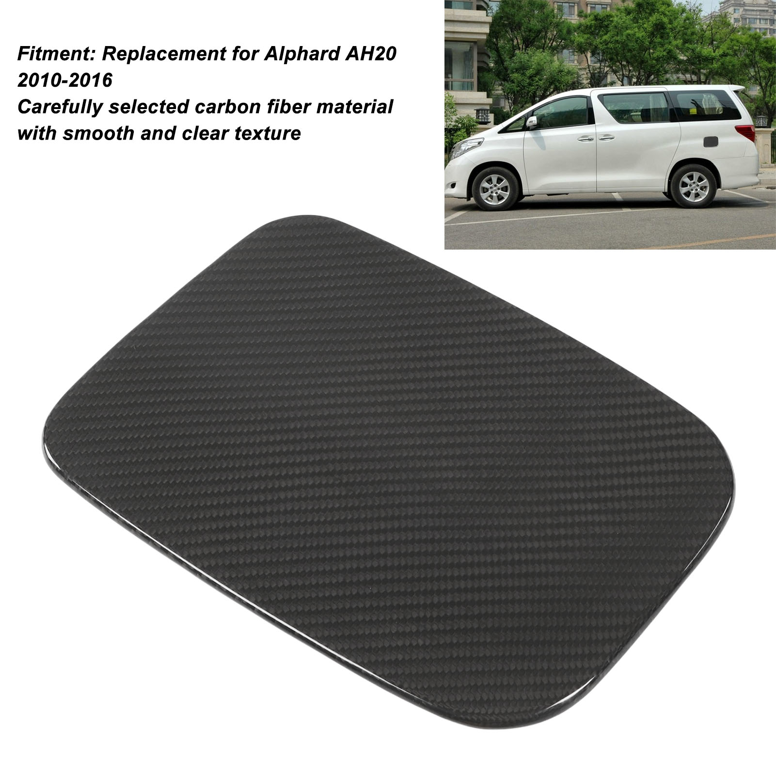1、Ideal Application: The exterior gas tank cap decoration is especially designed replacement for Alphard AH20 2010‑2016 with high accuracy and perfect fitness to meet your needs. 2、Carbon Fiber Trim: Exterior fuel tank cap trim is made of genuine dry carbon fiber material with smoother and clear texture, excellent UV protection and weather proof, reliable in using. 3、Delicate Decoration: The exterior gas tank cap cover trim after fine surface processing for a glossy look, adding luxury and elegant sense to the trim, delivering a sport sense to your car. 4、Convenient Installation: The exterior fuel tank cap decoration is equipped with a roll of double sided adhesive tape, easy to attach without damage to your car, not easy to fall off with strong adhesion. 5、Great Production: The high grade exterior gas tank cap cover can also protect your gas tank cap from being scratched and worn during driving journey, prolong its service life.