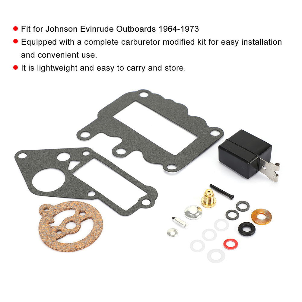 1、Equipped with a complete carburetor modified kit for easy installation and convenient use. 2、Made of high quality metal and ABS material, anti-corrosion and high strength for maximum durability. 3、Exquisite workmanship, stable performance and high reliability. 4、Especially designed fit for Johnson Evinrude Outboards 1964-1973. 5、It is lightweight and convenient to use, easy to carry and store.