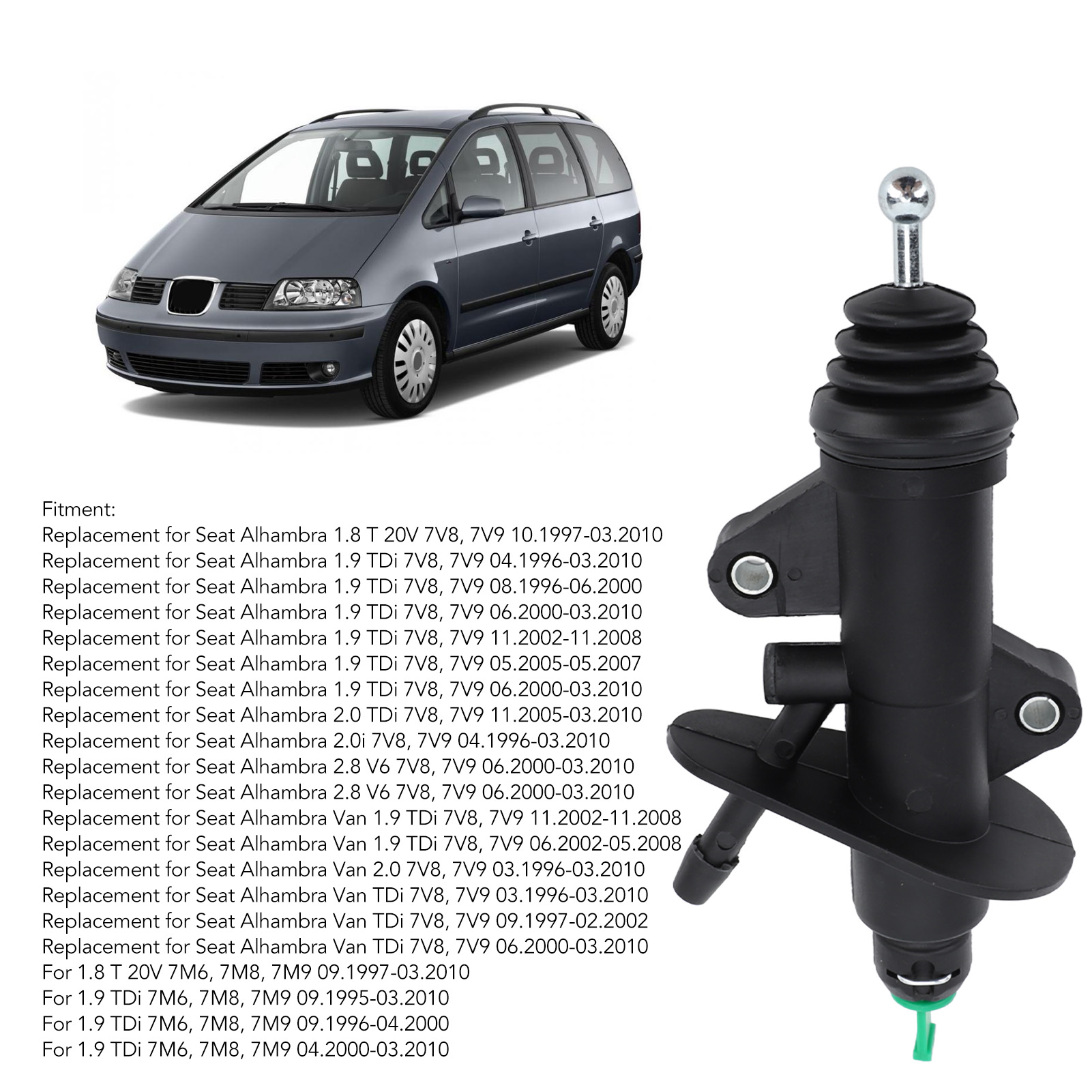 1、Applicable Models: Cylinder clutch is replacement for Seat Alhambra 1.9 TDi 7V8, 7V9 06, for 2.8 VR6 Syncro 7M6, 7M8, 7M9 11. and for Van 2.8 VR6 7M 08. 2、OE Number: The part numbers of reference are 7M0721401A, 1076417, 7317054, 7M0721401A, 7M0721401B, 7M0721401C, 7M0721401D, 7M3721401, 7M3721401, 7M3721401A. 3、Enhanced Driving Comfort: The cylinder clutch system has a very smoother start and stop process, which greatly enhances driving comfort. 4、Advanced Material: Master cylinder clutch is made of premium material, which is hardness, not easy to deform, sturdy and durable and has a long service life. 5、Ideal Replacement: Fine craftsmanship, this is your ideal option and replacement for your original damaged and old one, perfect for your car.