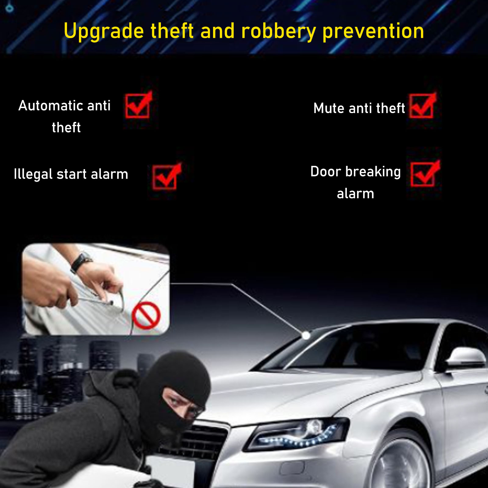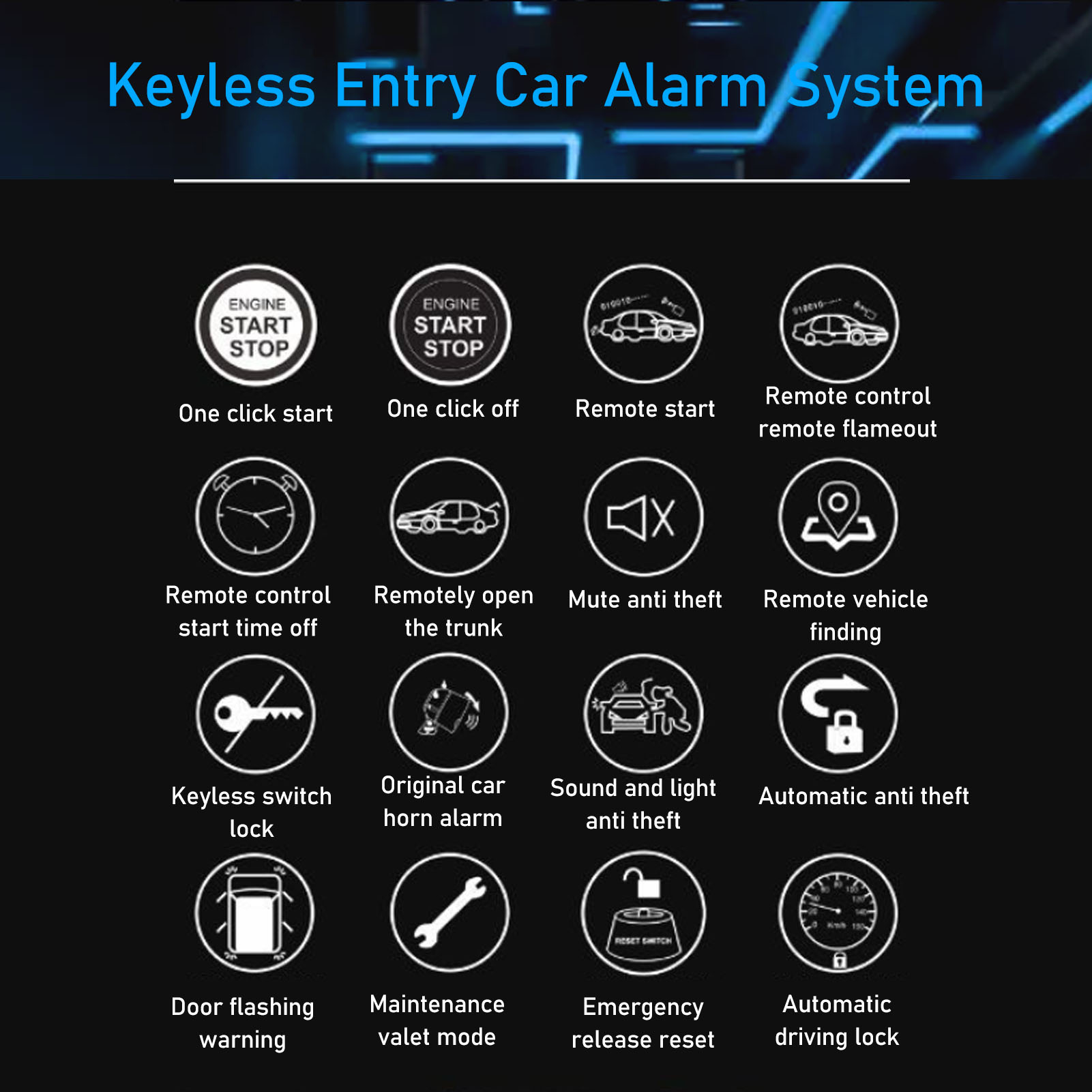 1、Improved Security: Anti theft systems provide additional security for vehicles, preventing accidental vehicle theft and reducing the likelihood of causing property damage. 2、Anti Breaking: The alarm system has strong anti interference and anti cracking capabilities, which can curb the malicious cracking behavior to a certain extent and effectively reduce the possibility of vehicle theft. 3、Supported Functions: The system supports remote start timing off, intelligent handbrake detection, intelligent fuel pump start detection, remote opening rear trunk, remote car finding, remote unlocking, remote locking, etc. 4、Convenient Operation: Simply press the one start button on the car key to activate the anti theft system, eliminating the need to use the key to insert the car door. 5、Upgraded Performance: Keyless start system is suitable for 12V fuel vehicles, and the professional design and advanced performance improve the convenience and speed of your operation.