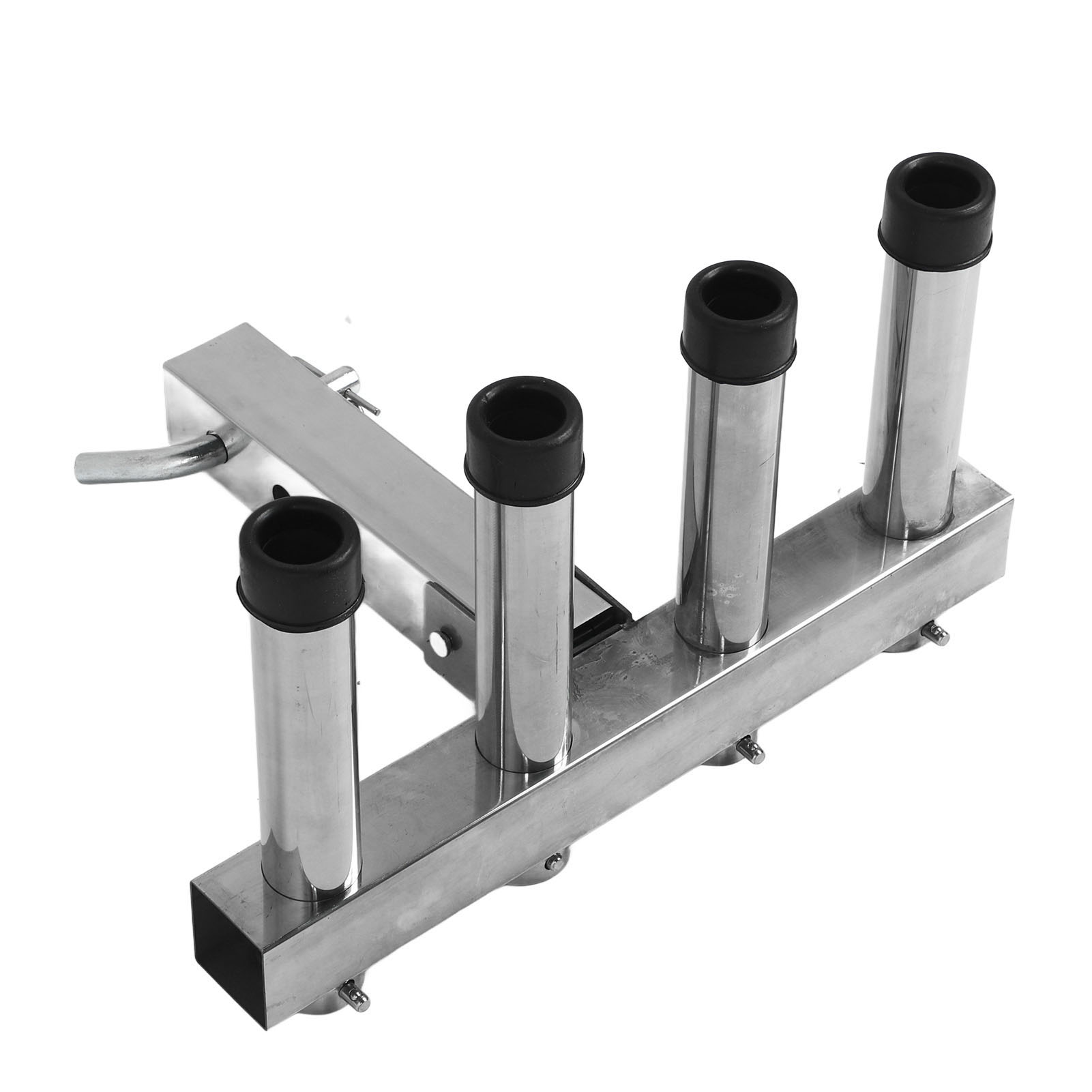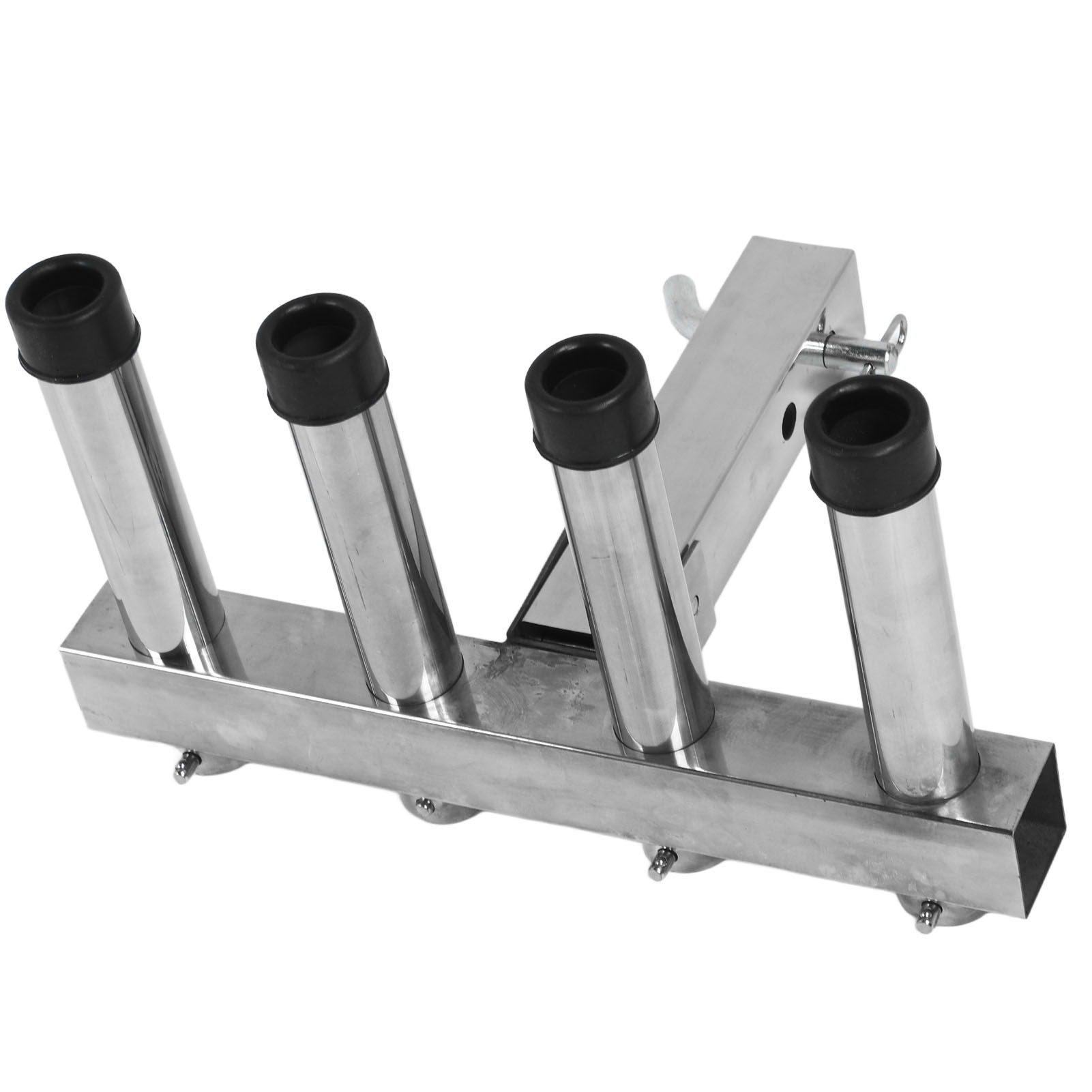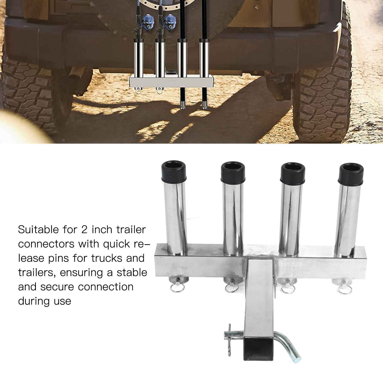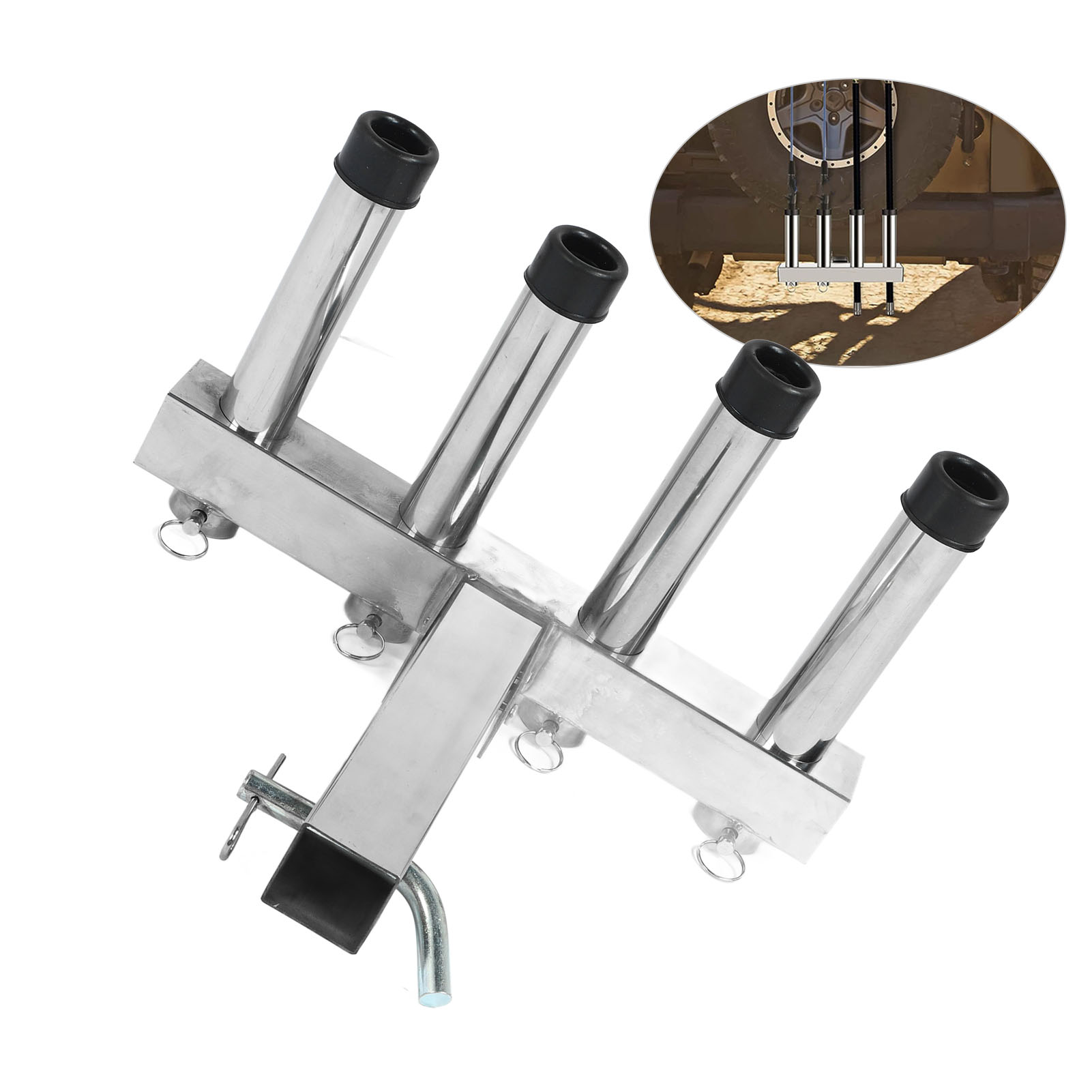 1、Suitable Scene: Adjustment fishing rod holder is suitable for 2 inch trailer connector with quick release pin and suitable for trucks and trailers ensuring a stable and secure connection during use. 2、Adjustable and Convenient Storage: The fishing rod holder features 4 adjustable pipes that allow you to easily organize and secure your fishing rods according to your needs, greatly reducing the hassle of carrying and storing them. 3、Space Saving: The fishing rod holder effectively utilizes space by securely holding multiple fishing rods in an organized manner, making it ideal for both storage and transportation purposes. 4、Durable Material: Made from high class stainless steel material, the fishing rod rack offers excellent durability. It can withstand any weather conditions and maintain a long lifespan. 5、Easy to Use: Truck adjustment fishing rod rack is designed to be easy to use, so you can use it easily, which is convenient and practical for you.
