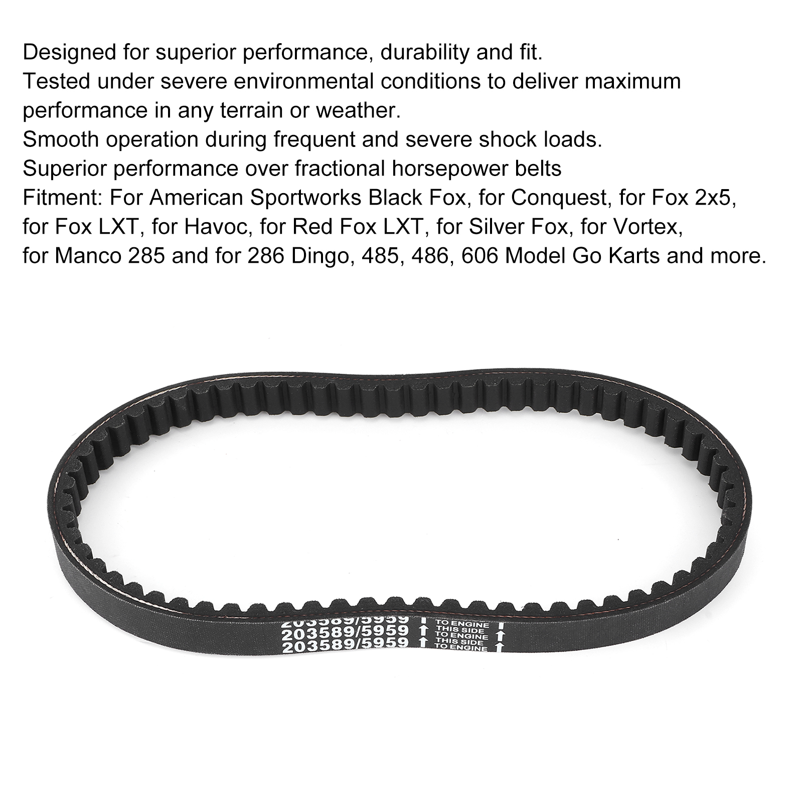1、It designed for superior performance, durability and fit. Tested under severe environmental conditions to deliver maximum performance in any terrain or weather. 2、The drive belt can also operates smoothly during frequent and severe shock loads. 3、It has superior performance over fractional horsepower belts on recommended applications. 4、Fits for American Sportworks Black Fox, for Conquest, for Fox 2x5, for Fox LXT, for Havoc, for Red Fox LXT, for Silver Fox, for Vortex, for Manco 285 and for 286 Dingo, 485, 486, 606 Model Go Karts and more. 5、Made of excellent quality rubber material, it is a great replacement belt for the old or worn one.