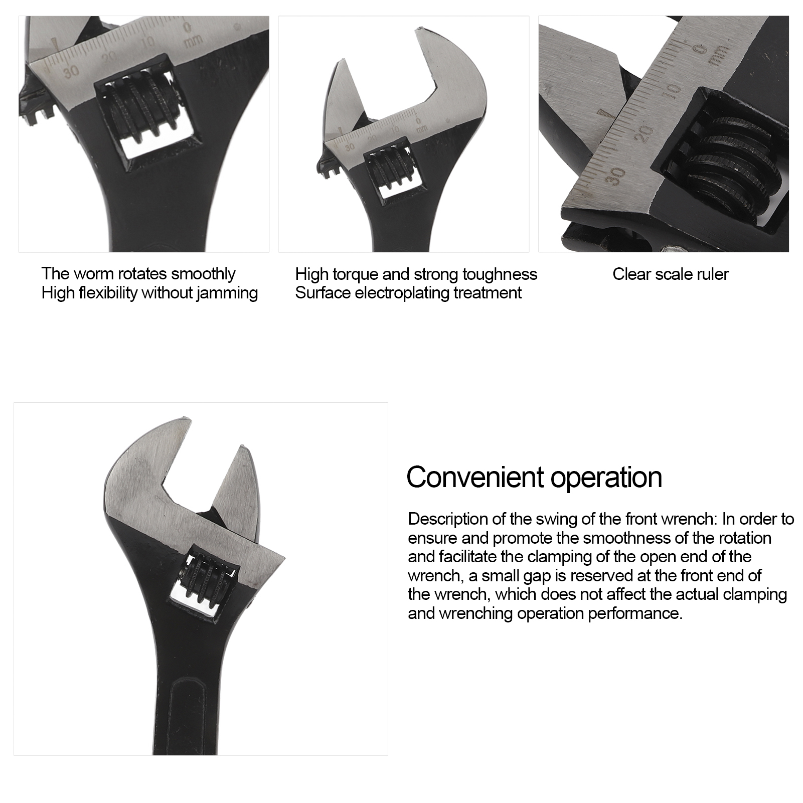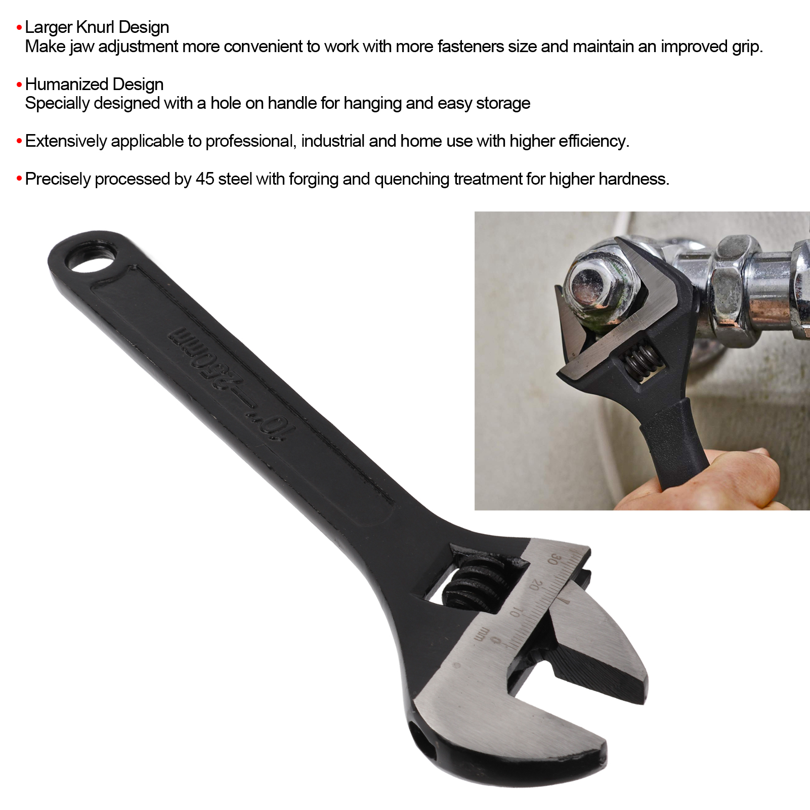 1、Larger Knurl Design: The larger knurl makes jaw adjustment more convenient to work with more fasteners size and maintain an improved grip. 2、Humanized Design: The heavy duty adjustable wrench is specially designed with a hole on handle for hanging and easy storage, more convenient to use. 3、Wide Application: The great adjustable wrench is extensively applicable to professional, industrial and home use with higher efficiency. 4、High Quality Materials: The jaw adjustable wrench is precisely processed by 45 steel with forging and quenching treatment for higher hardness. 5、High Performance: The sturdy jaw opening wrench body features increased strength, and excellent resistance to rust, not easy to break, have a longer service life.
