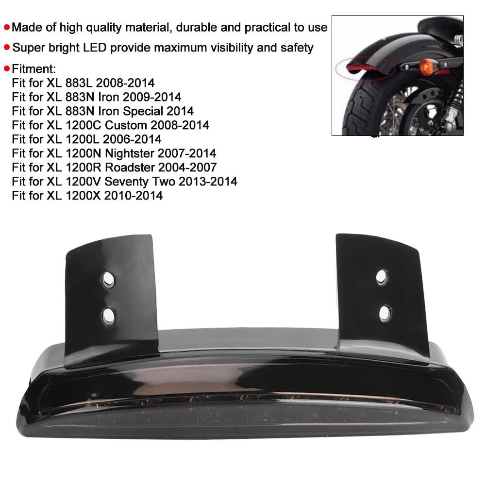 1、Made of high quality and superior material, durable and practical for using. 2、Super bright LED provides maximum visibility, making your driving safer. 3、This center-mount running and brake light commands the attention of following vehicles. 4、This taillight is especially designed to fit for XL 883L 2008-2014. 5、Precision manufacturing ensures stable performance and long service life.