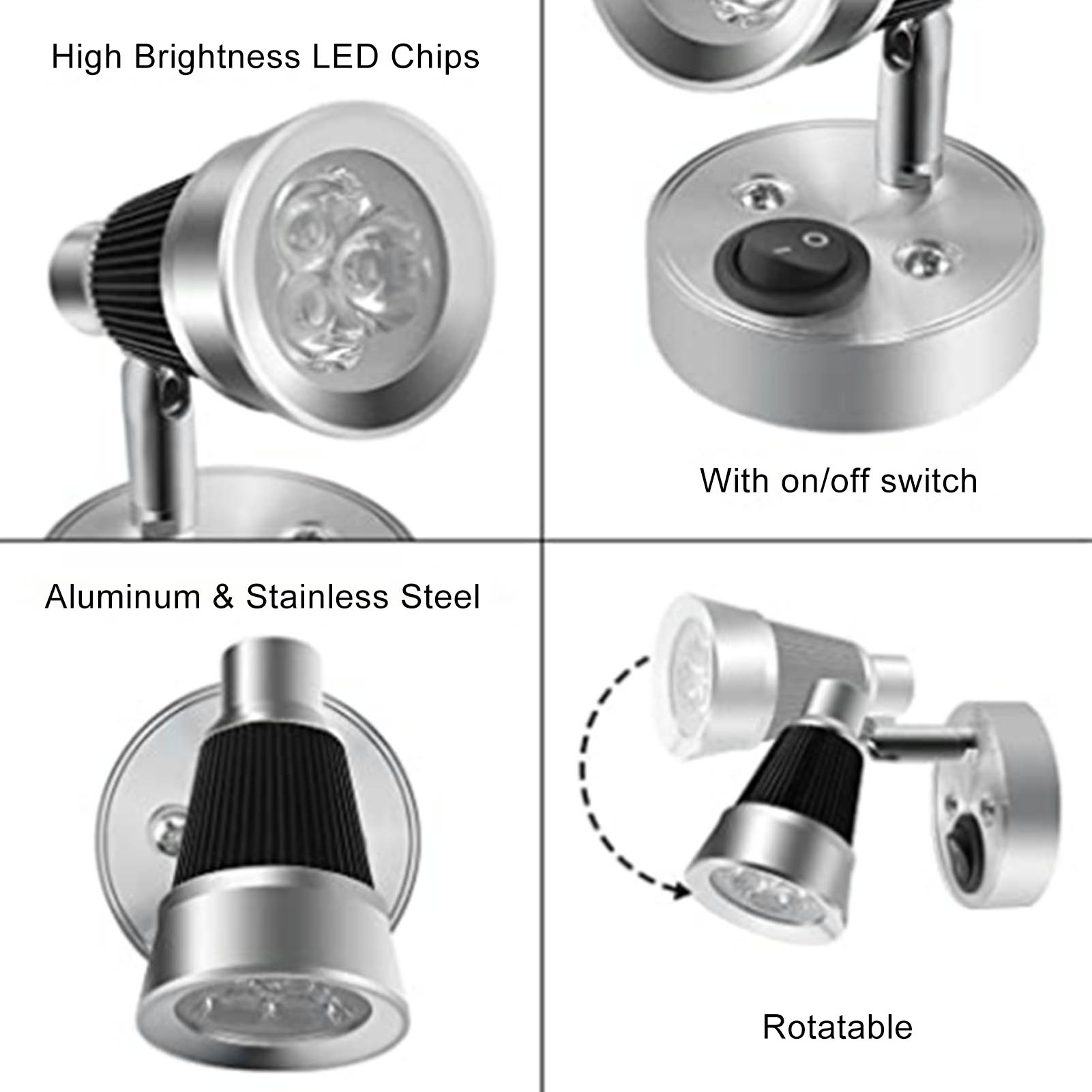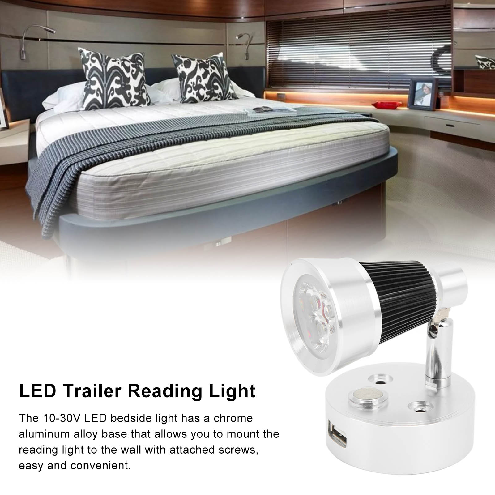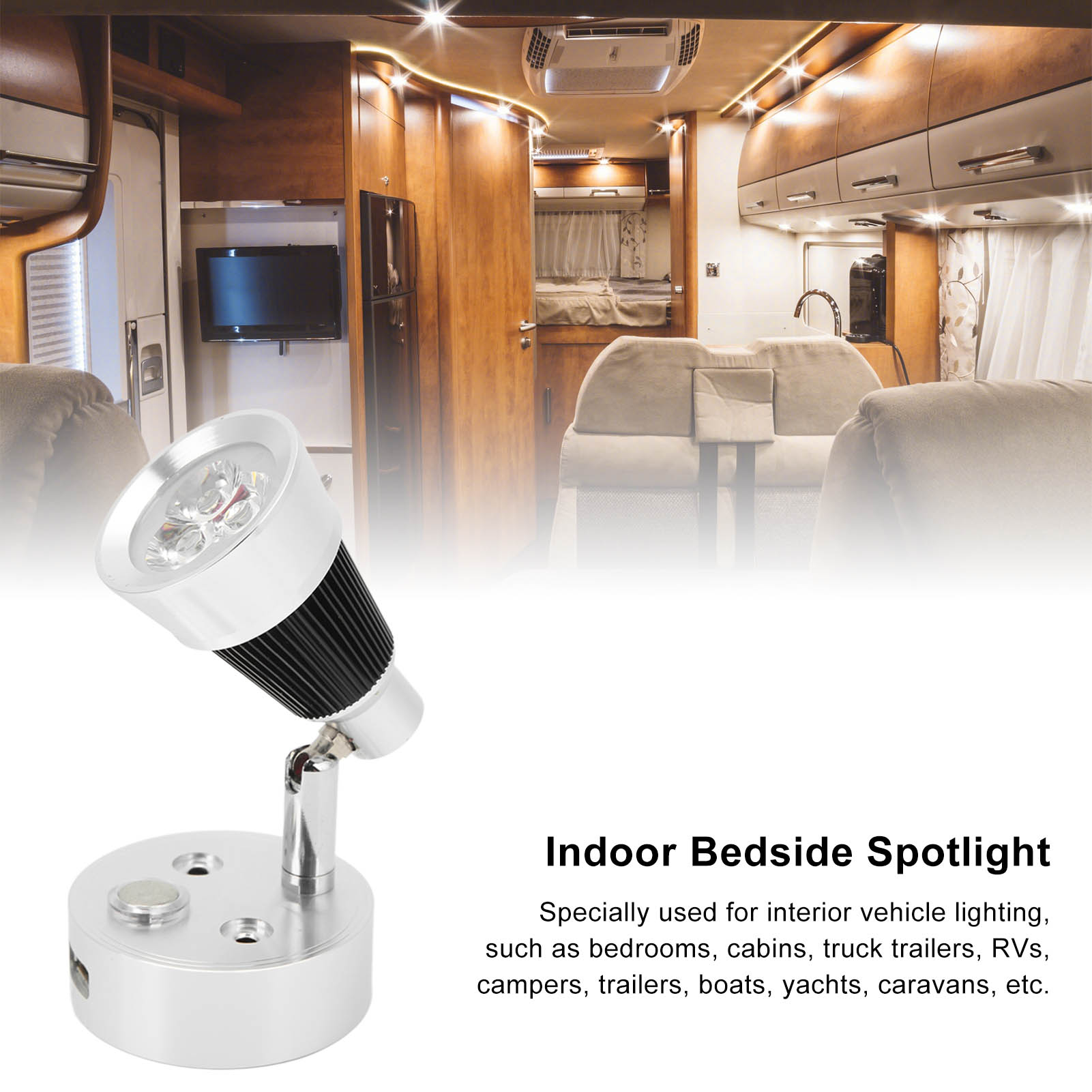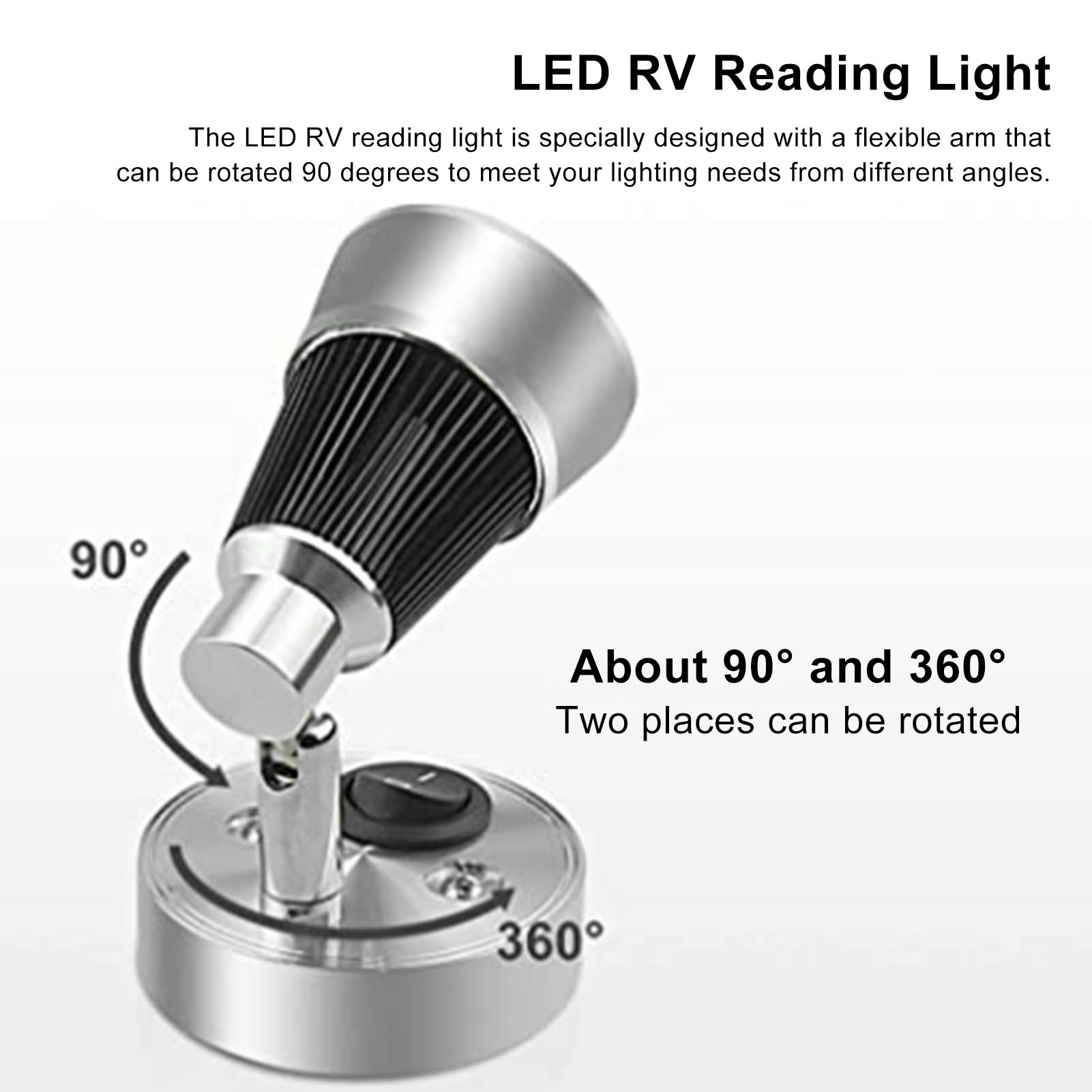 1、Wide Range of Applications: Specially used for interior vehicle lighting, such as bedrooms, cabins, truck trailers, RVs, campers, trailers, boats, yachts, caravans, etc. 2、Adjustable Orientation: The LED RV reading light is specially designed with a flexible arm that can be rotated 90 degrees to meet your lighting needs from different angles. 3、Touch Switch Design: The adjustable LED reading light adopts touch switch, which can control the light silently without disturbing others, more considerate to use. 4、Easy to Install: The 10‑30V LED bedside light has a chrome aluminum alloy base that allows you to mount the reading light to the wall with attached screws, easy and convenient. 5、Classic Design: The premium RV boat reading light comes with high grade silver appearance, simple and modern, well matching with the overall style of your vehicles.