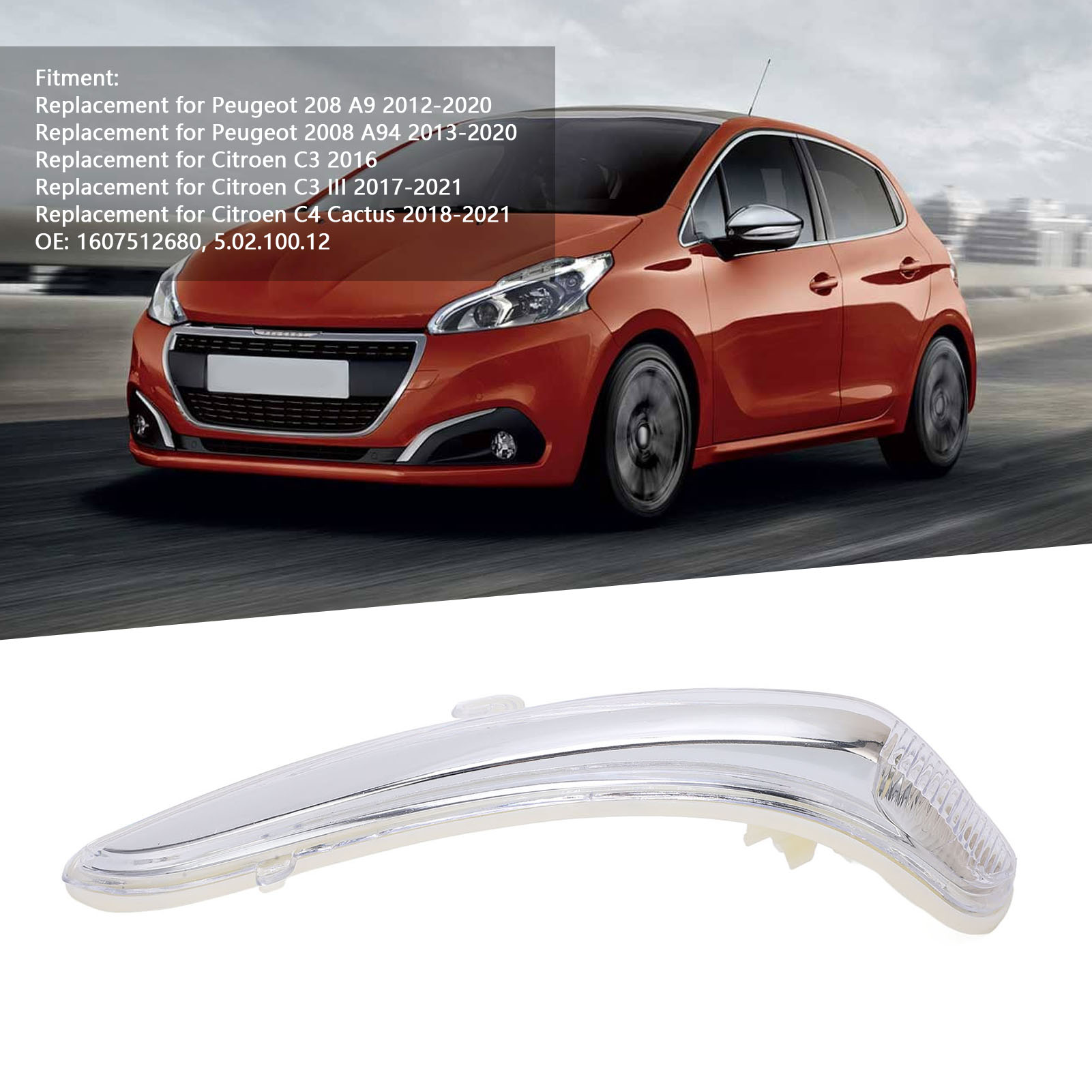 1、Fitment: Replacement for Peugeot 208 A9 2012‑2020, replacement for Peugeot 2008 A94 2013‑2020, replacement for Citroen C3 2016, replacement for Citroen C3 III 2017‑2021, etc. 2、OE Number: Replacing manufacturer part numbers for reference are 1607512680, 5.02.100.12. Please double check the part number of your item beofre purchasing. 3、Rolling Design: In order to improve driving safety and indicate the direction of the vehicle, side mirror turn signal housing uses rolling and flashing methods to instruct the vehicle to turn left, so as to attract the attention of other vehicles and pedestrians, improving the safety of the vehicle. 4、High Quality Material: Smoked lens dynamic sequential rolling door mirror turn signal lamp housing, low power consumption and energy saving, ABS plastic housing is waterproof, scratch resistant, long term exposure does not fade, can adapt to all kinds of extreme weather. 5、Simple Installation: Plug and play design, no modification or trimming required, no additional resistors or relays required. Remove the top case with a trimming tool and 2 inner screws (not included), and replace the original mirror turn signal directly.