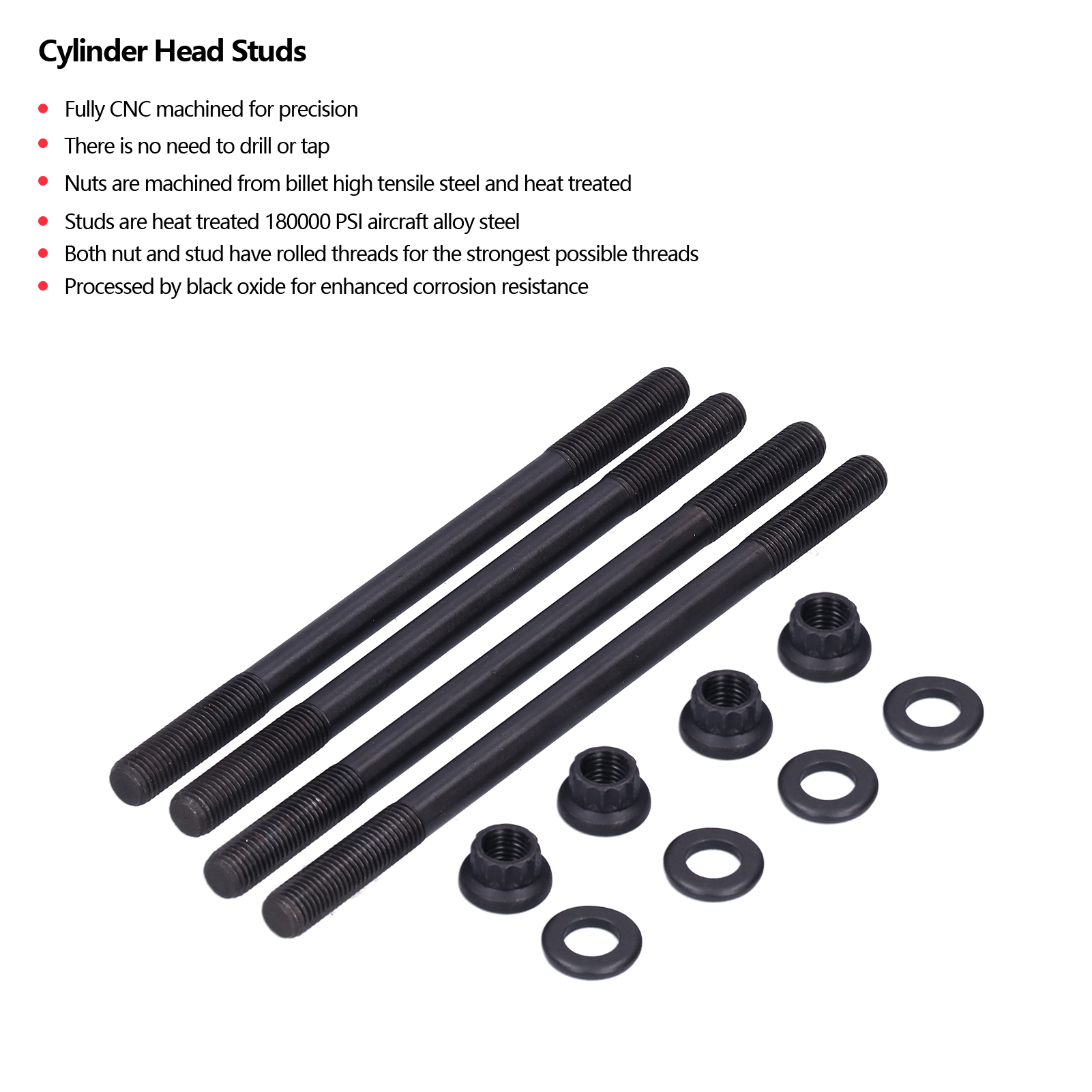 1、The cylinder head bolts is fully CNC machined for precision, there is no need to drill or tap, effectively save your time. 2、Nuts are machined from billet high tensile steel and heat treated; and studs are heat treated 180000 PSI aircraft alloy steel. 3、Both nut and stud have rolled threads for the strongest possible threads, and processed by black oxide for enhanced corrosion resistance. 4、The head nuts is 12 point chromoly, and the torque is increased to 35 foot pounds, can solve most of the problems that bother you. 5、The motorcycle cylinder head studs kit is made of high quality steel materials with more reliable and durable performance.