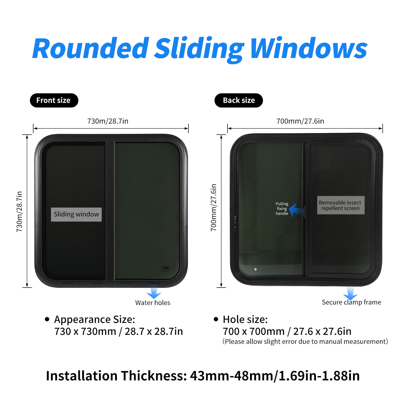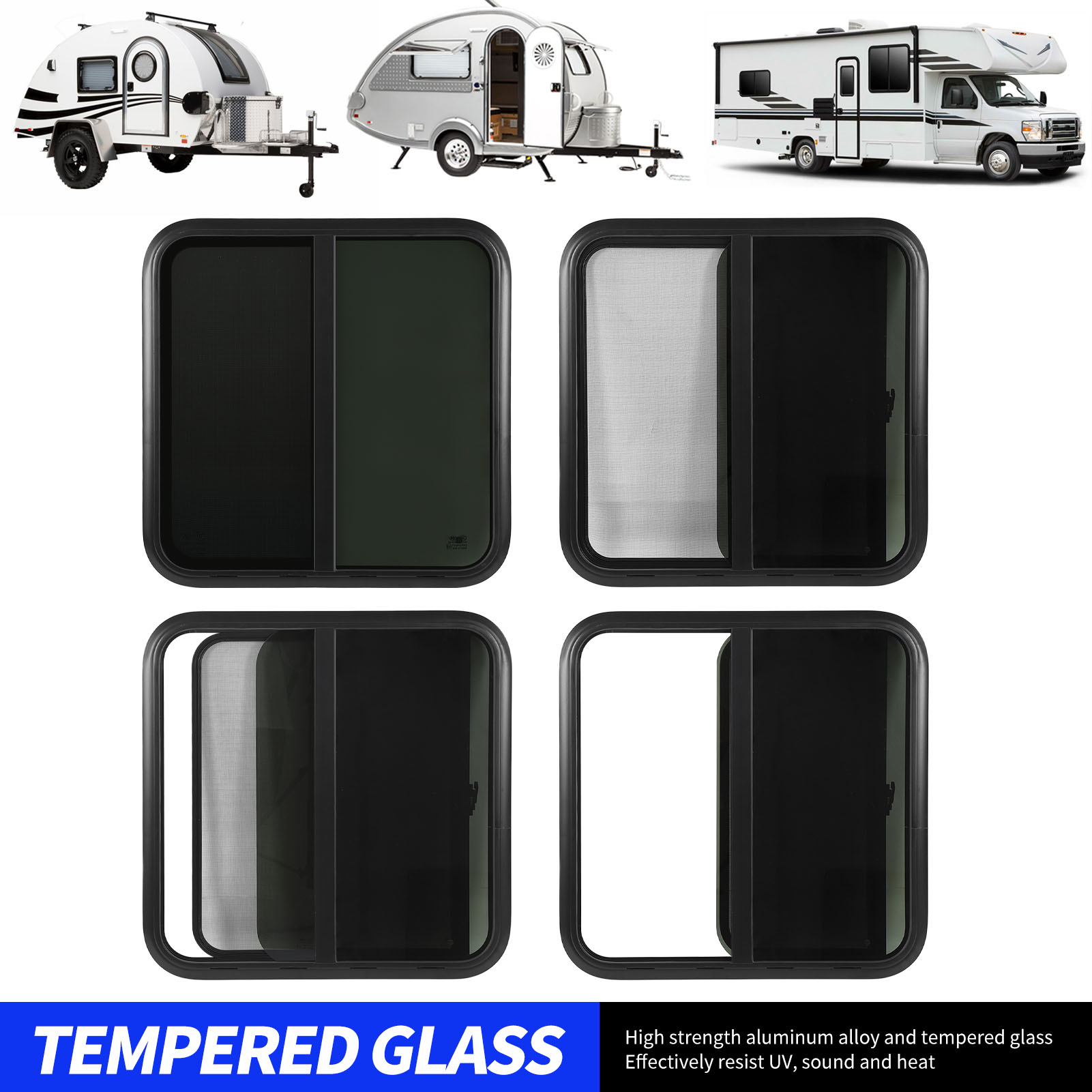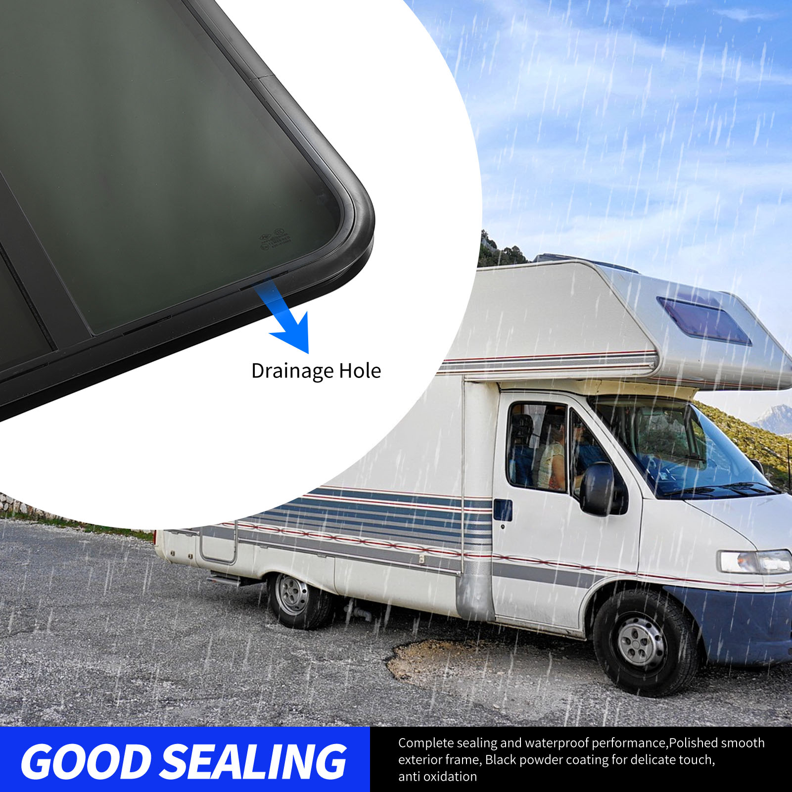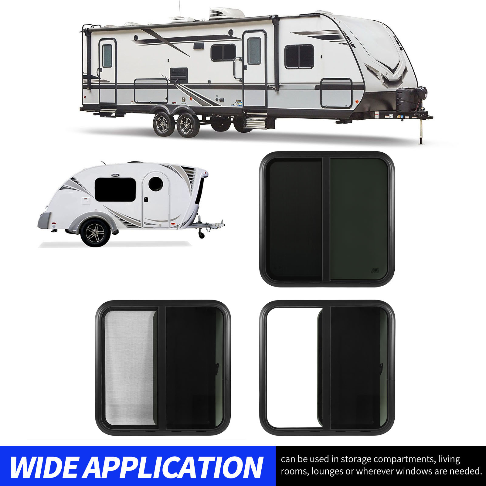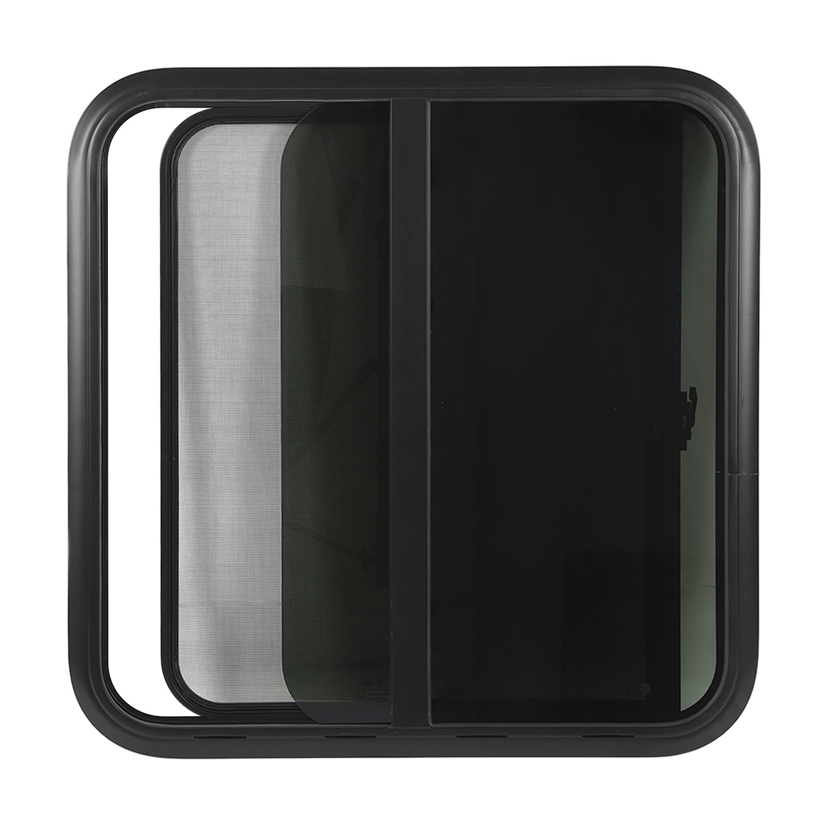 1、Robust Frame: The frame is made of high strength aluminum alloy with a black powder coating that provides oxidation resistance and ensures long lasting performance even in harsh outdoor environments. 2、Leak Prevention: The entire frame has a rubber ring to ensure a perfect seal to keep your RV cool in the summer and warm in the winter. There are drain holes under the frame to ensure rainwater runoff. 3、Tempered Glass: 4mm thick black tempered glass provides durability and safety for windows. Tinted glass resists UV radiation and high temperatures, preventing interior from overheating. 4、Smooth Operation: The camper window with sliding openings, single sided glass that can be slid open and closed, and a removable insect net on the side of the opening that provides an insect barrier. 5、Application: Applicable to campers, trailers, RVs, mobile housing, construction vehicles, etc. Suitable for storage cabins, living rooms, lounges or wherever windows are required.