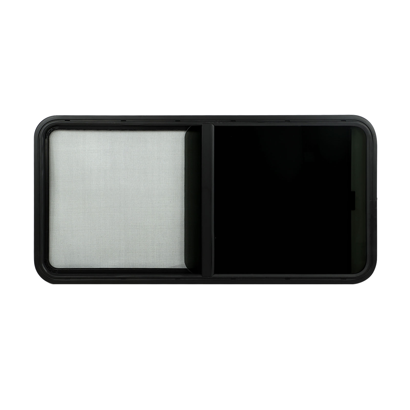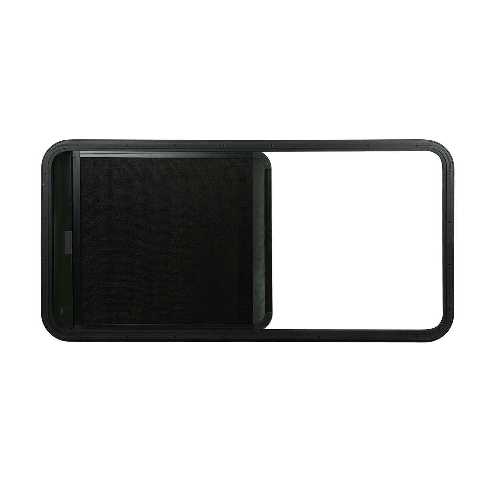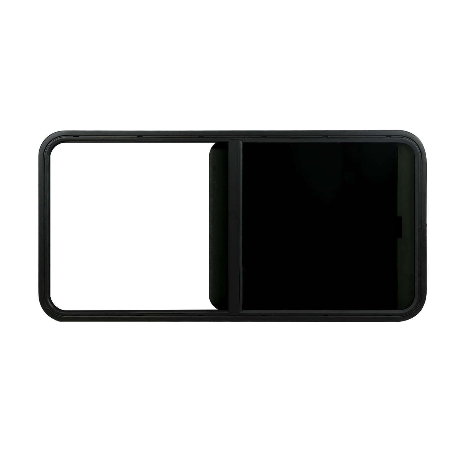 1、Stable Structure: The overall frame of the sliding window is made of high strength aluminum alloy glass, and the surface is polished and smooth with black powder coating, ensuring anti oxidation and antirust. 2、Tinted Glass: 4mm thick black tempered glass (E4 certified) ensures the overall sturdiness of the window, and the tinted glass is effectively resistant to UV rays, sound and heat, providing a comfortable environment. 3、Perfect Sealing: The entire frame has a waterproof rubber ring, perfect sealing, keep your camper cool in summer and warm in winter, and there are drainage holes under the frame to ensure rainwater flow out. 4、Easy to Slide: The rounded slide window is opened by push pull, the lower half of the glass can be pushed and pulled, and there is a movable insect net on the open side to provide a barrier for insects and mold. 5、Application: Suitable for wall thickness 5mm‑7mm or 54mm‑55mm, suitable for campers, RVs, construction vehicles, etc., can be used in storage cabins, living rooms, lounges or any location that requires windows.