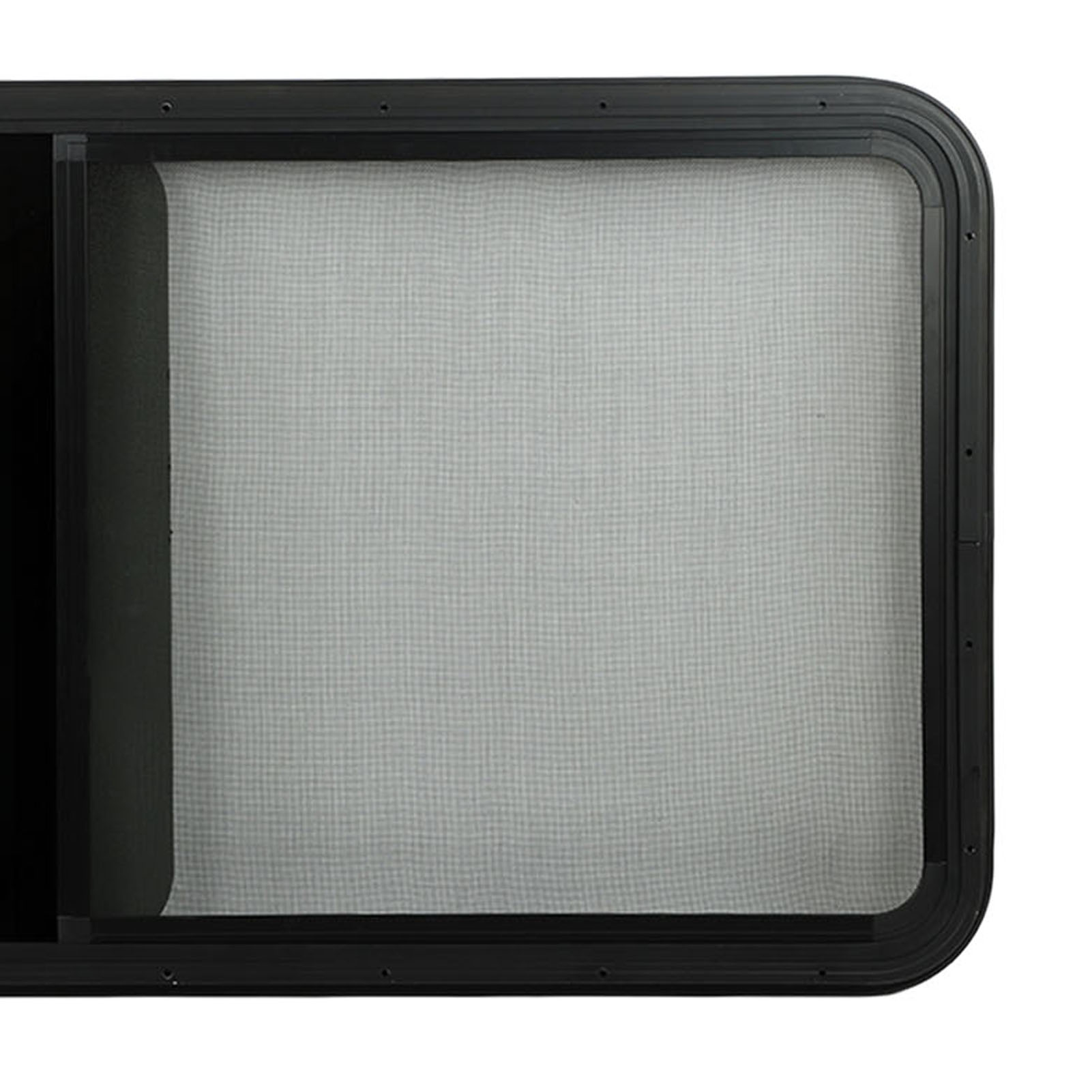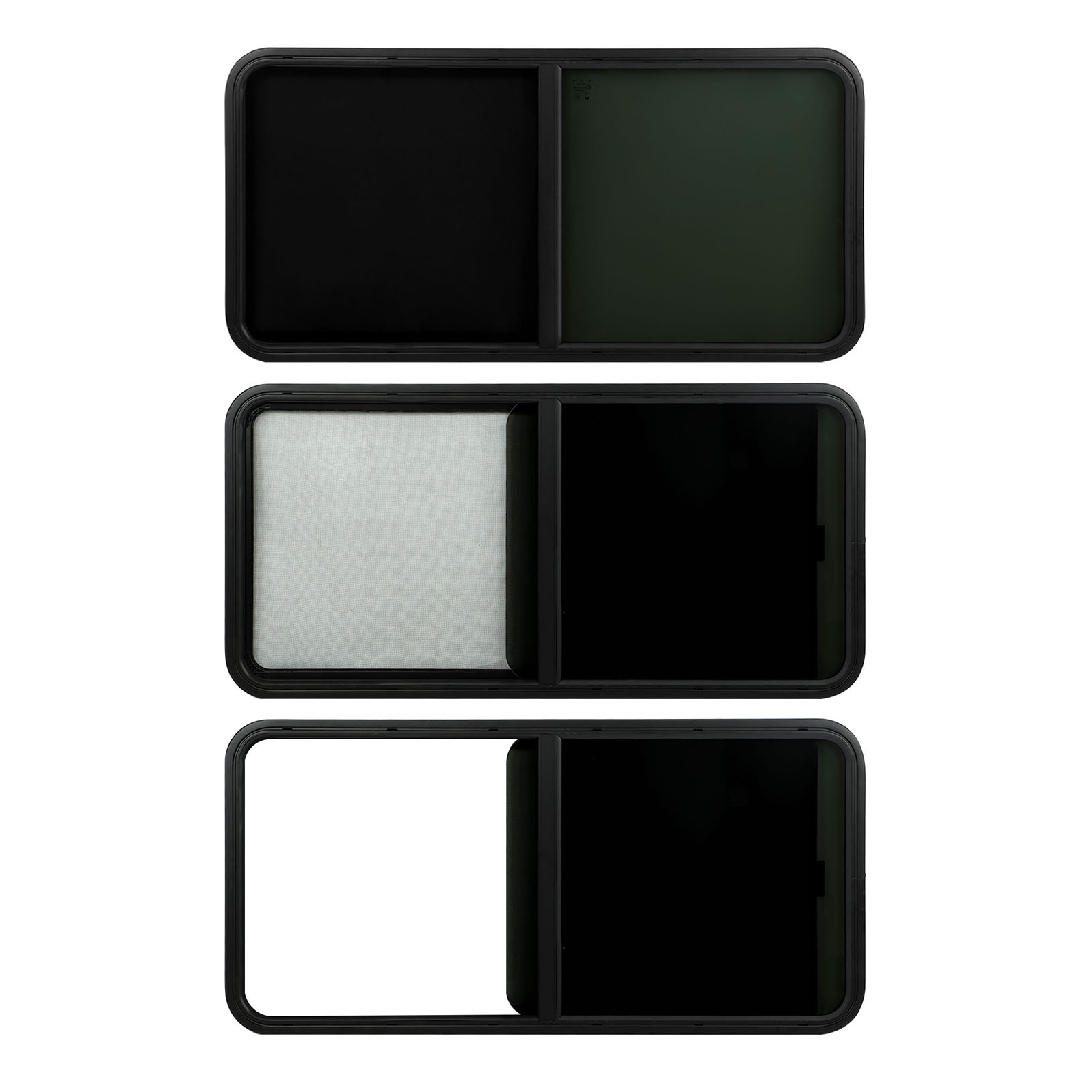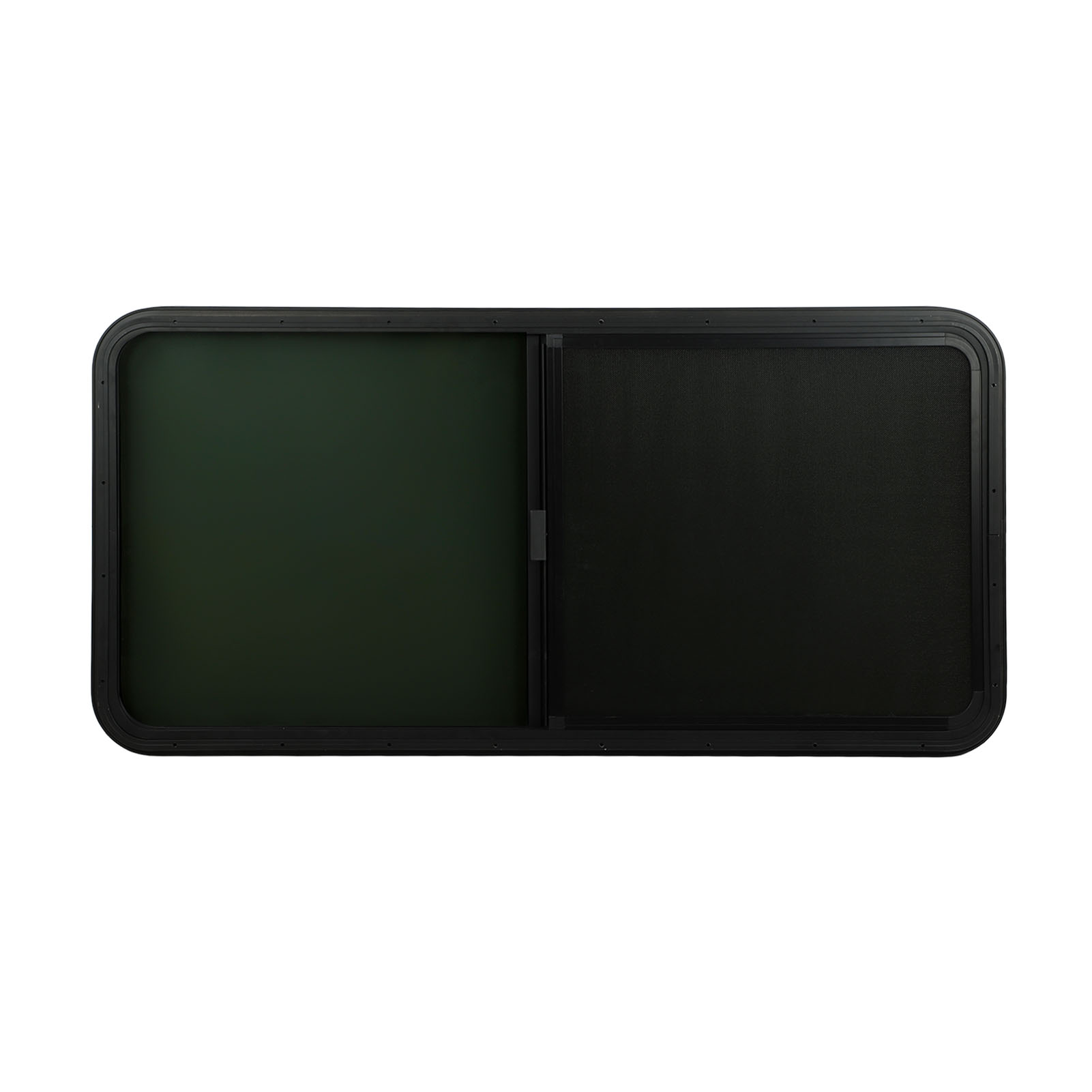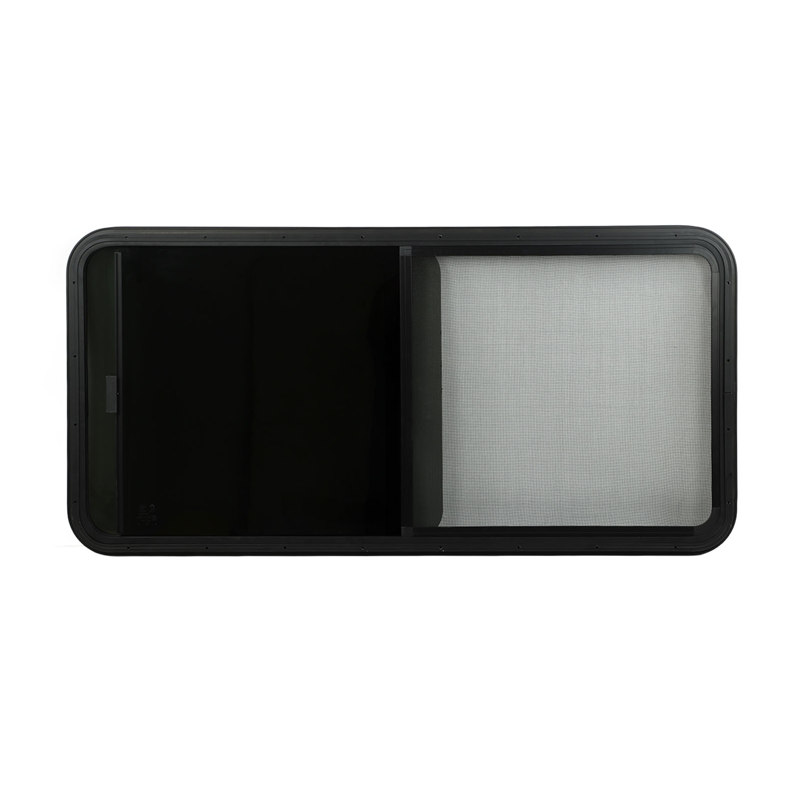 1、Stable Structure: The overall frame of the sliding window is made of high strength aluminum alloy glass, and the surface is polished and smooth with black powder coating, ensuring anti oxidation and antirust. 2、Tinted Glass: 4mm thick black tempered glass (E4 certified) ensures the overall sturdiness of the window, and the tinted glass is effectively resistant to UV rays, sound and heat, providing a comfortable environment. 3、Perfect Sealing: The entire frame has a waterproof rubber ring, perfect sealing, keep your camper cool in summer and warm in winter, and there are drainage holes under the frame to ensure rainwater flow out. 4、Easy to Slide: The rounded slide window is opened by push pull, the lower half of the glass can be pushed and pulled, and there is a movable insect net on the open side to provide a barrier for insects and mold. 5、Application: Suitable for wall thickness 5mm‑7mm or 54mm‑55mm, suitable for campers, RVs, construction vehicles, etc., can be used in storage cabins, living rooms, lounges or any location that requires windows.