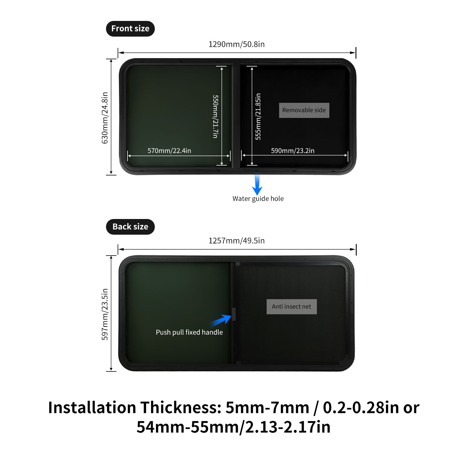 Installation Opening Size: 1257 x 597mm / 49.5 x 23.5in (measurement need to take off the fixed frame, manual measurement will have 1-2mm error is normal)