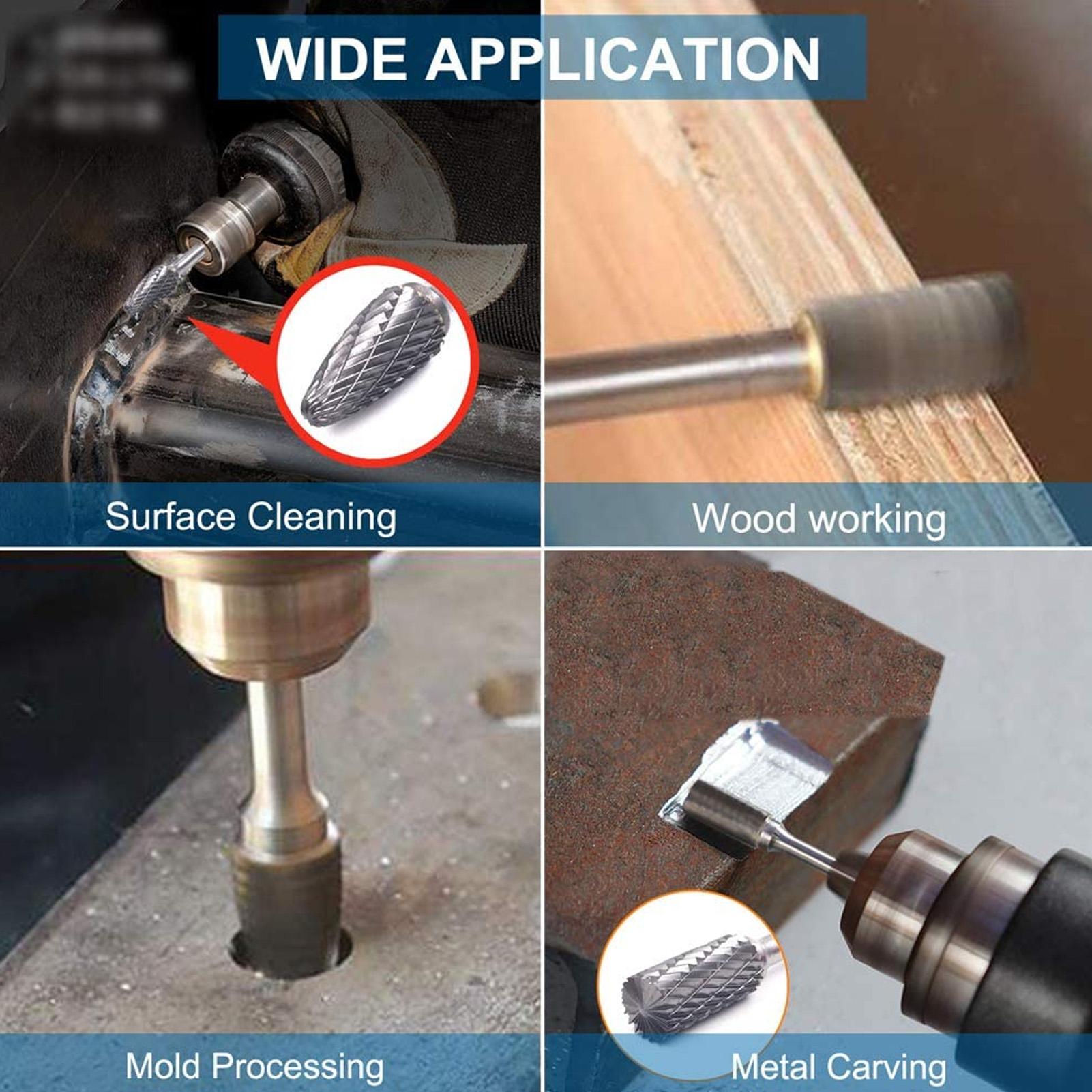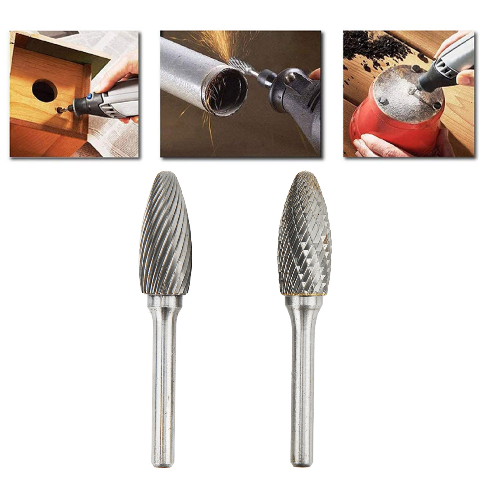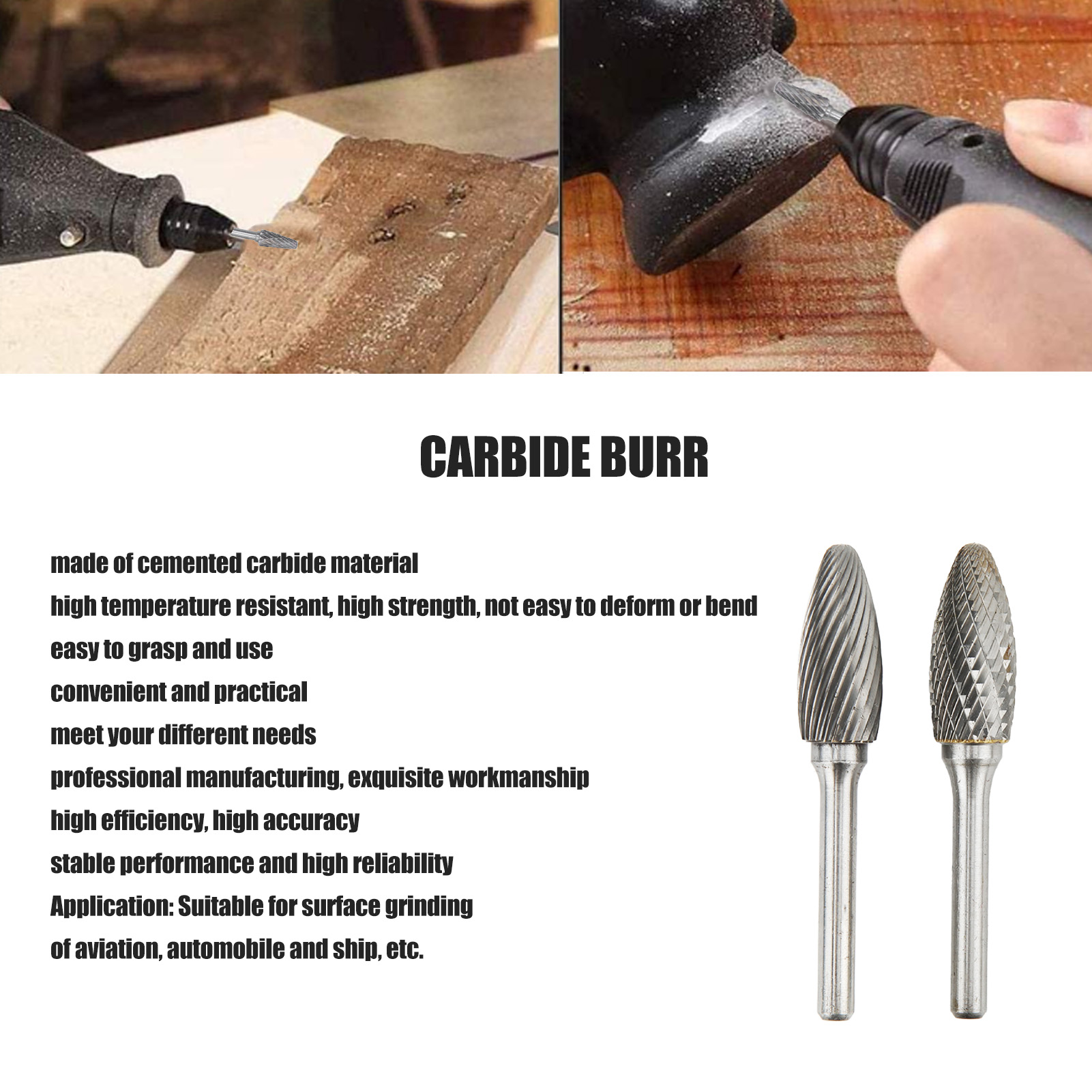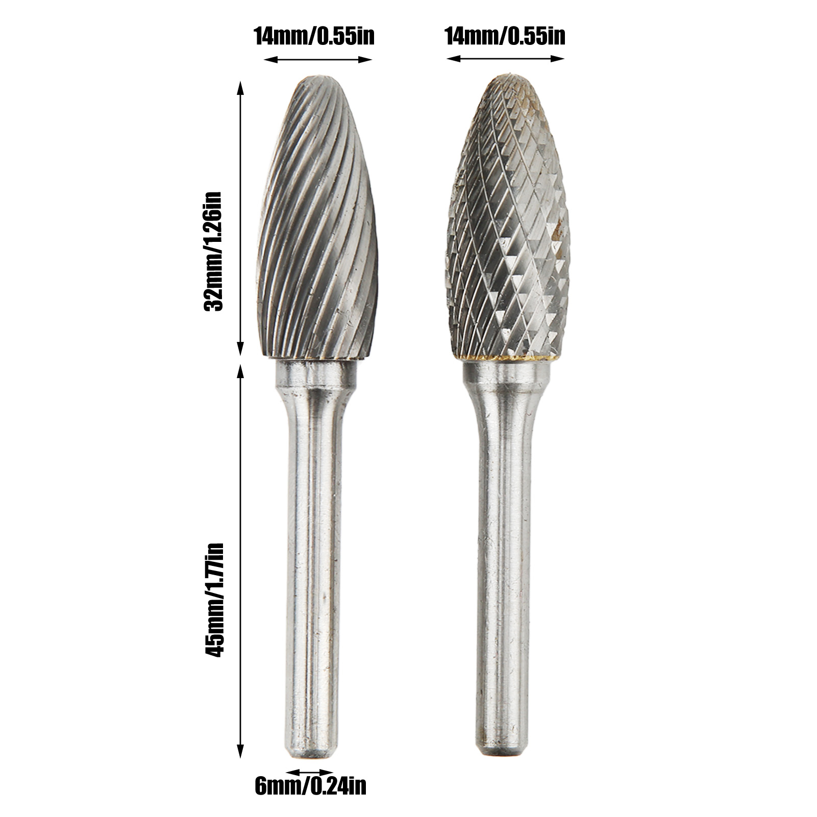 1、Overall Dimensions: Single and double cut carbide burrs shank diameter 6mm, length 45mm; cutter head diameter 14mm, length 32mm. 2、Premium Material: Made of cemented carbide, it is 10 times more durable than HSS burrs and 200 times more durable than small grinding wheels. 3、Advantages: High hardness, strong wear resistance, no deformation even at extremely high temperatures, and can be used for a long time. 4、Acuminous Cutting Head: Double cuts leave a smoother finish, making it better for wood, plastic, aluminum and titanium alloys. 5、Multipurpose: Used for metalwork, model engineering, wood carving, jewellery making, welding, casting, deburring, grinding and sculpting. 6、Wide Application: Rotary file is widely used in machinery, aviation, automobile, ship metal processing and DIY engraving, etc.