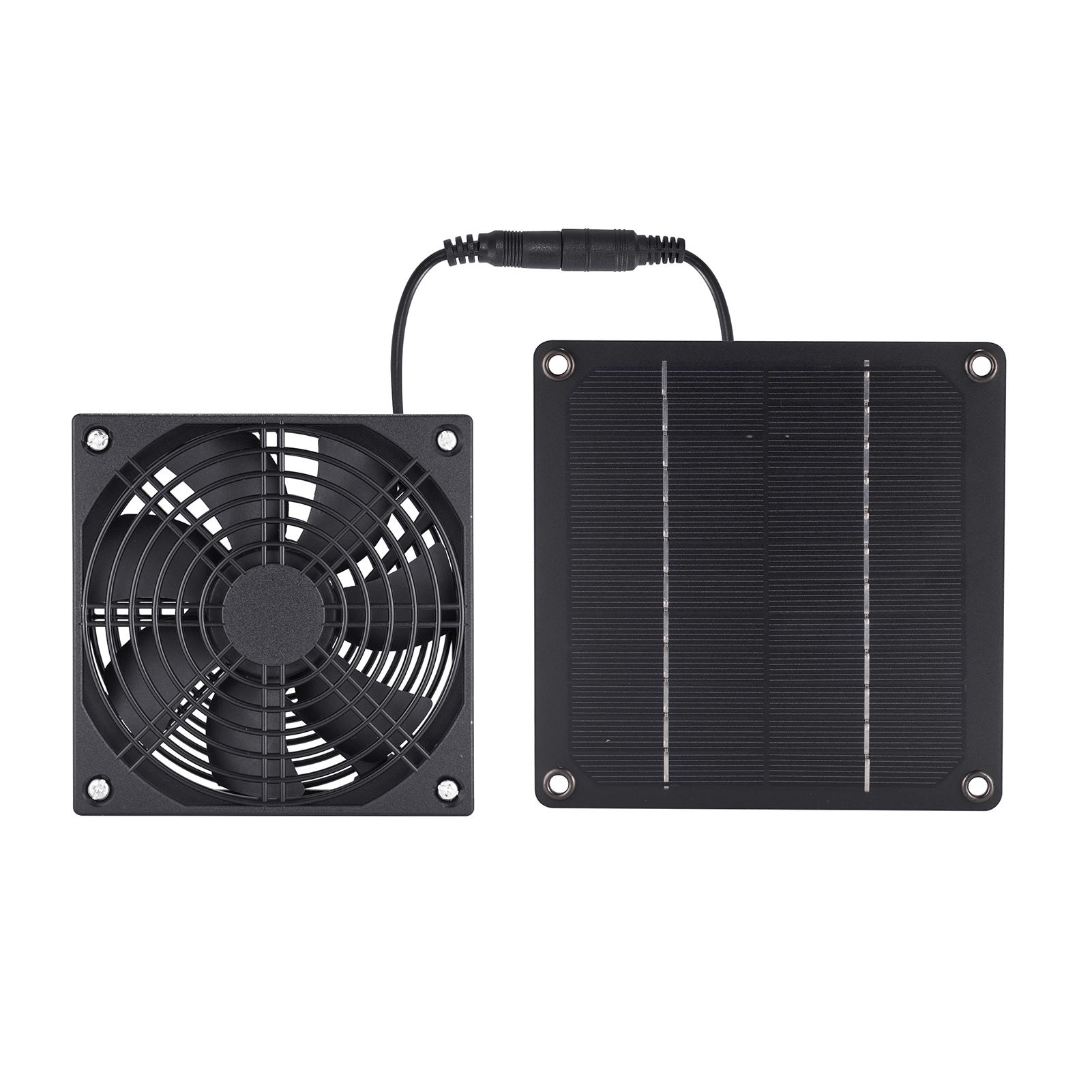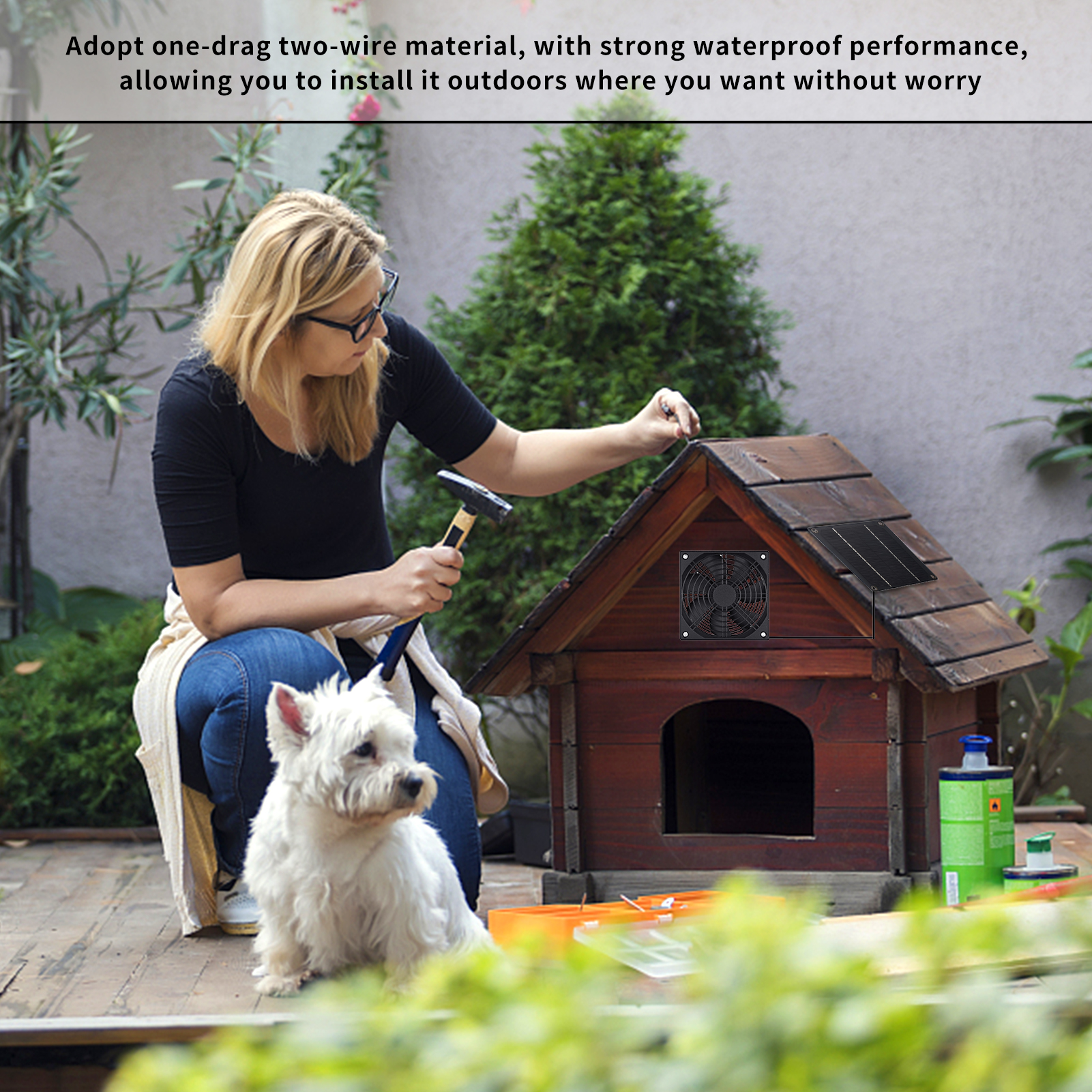 1、Adopt one-drag two-wire material, with strong waterproof performance, allowing you to install it outdoors where you want without worry 2、Large air flow: Designed with high-quality weatherproof motors, the service life exceeds 6 years. The maximum rotational speed uses a rainproof fan, and the hydraulic bearings are more durable. 3、The use of rainproof fans, hydraulic bearings more durable. The service life of solar panels exceeds 10 years. With a super high wind speed of 2200RPM and an air volume of 152.6CFM, it supports a pet dormitory area of over 250 cubic feet. 4、Weatherproof design: The motor portion of the fan (PCB board/wiring/bearings) is coated to prevent short circuits or damage caused by rain. The waterproof grade can reach IPX7, suitable for outdoor use. 5、Safety protection: The dual fan is equipped with a bimetal protective net to prevent small animals from being injured and to protect the normal operation of the fan blades. 6、Suitable for small chicken coops, greenhouses, sheds, pet houses, and window exhaust in hot summer. The 10W solar panel dual fan kit can push out hot air and cool air, effectively reducing indoor temperature and keeping the air fresh.