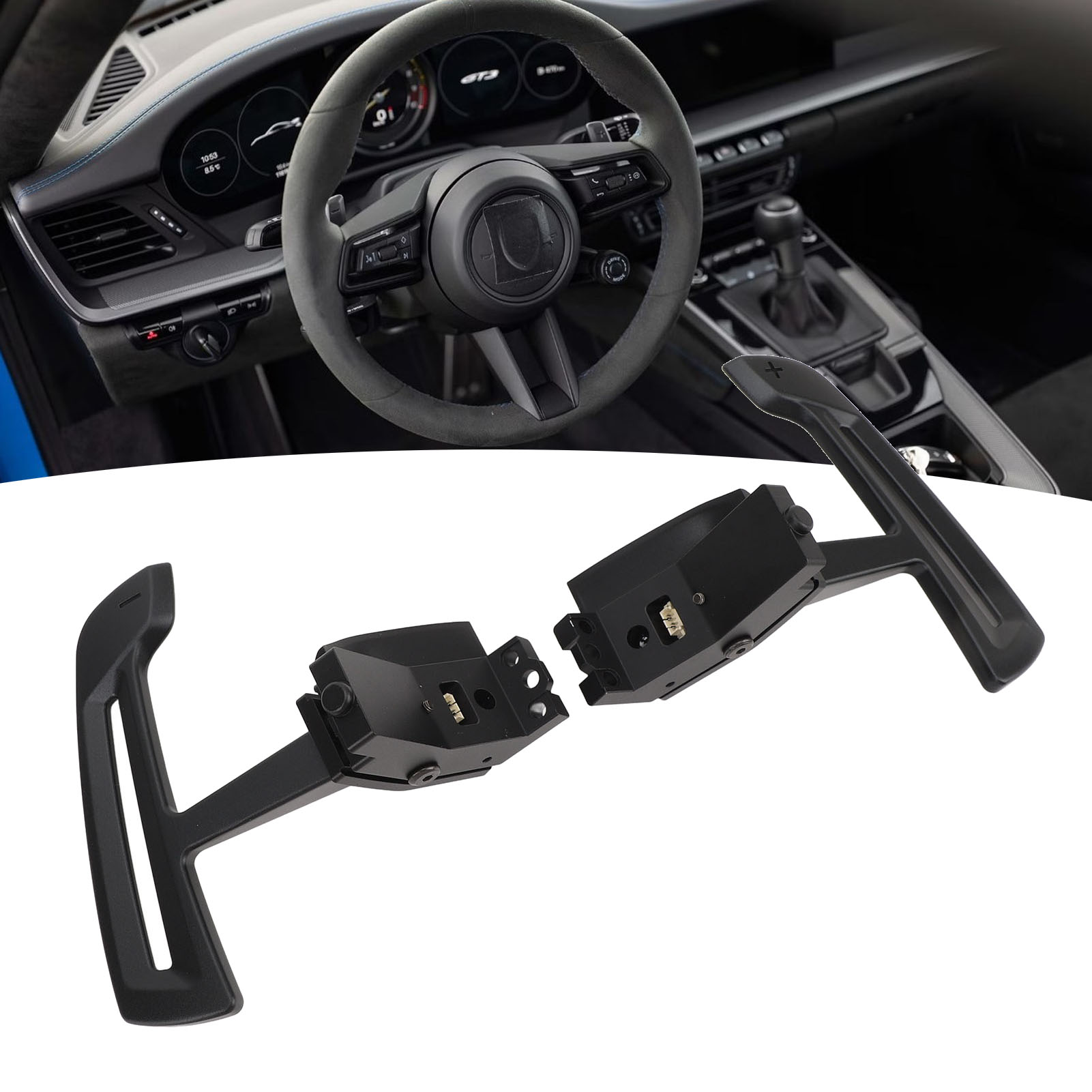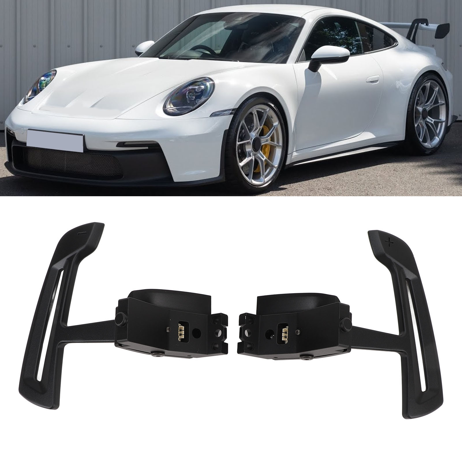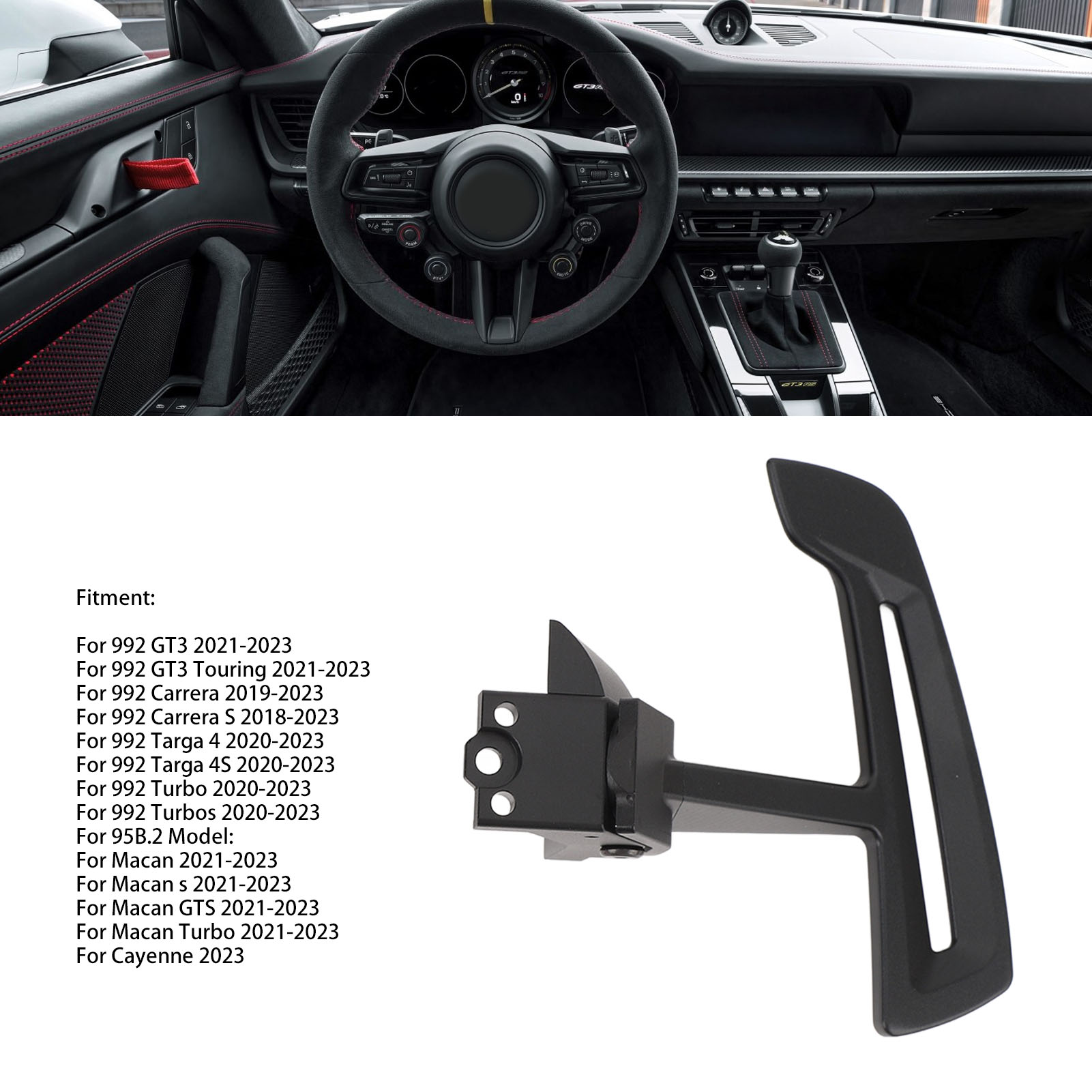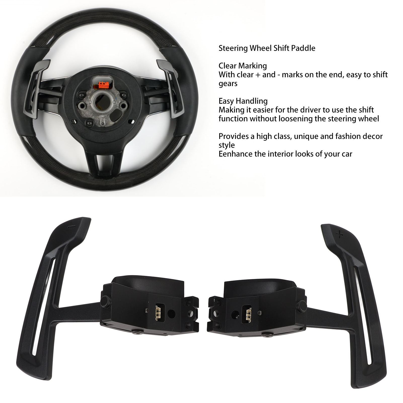 1、APPLICABLE MODELS: Steering wheel shift paddle is fit for 992 GT3 2021‑2023, for Macan 2021‑2023, for Cayenne 2023, for Macan Turbo 2021‑2023, for 992 Turbos 2020‑2023, etc. 2、SMOOTH SHIFTING: Shift paddles offers a more silky smooth and easy shifting experience, allowing you to hear clear gear shifts for a more enjoyable journey. 3、CLEAR MARKINGS: Shift paddles come with clear + and ‑ markings at the end, providing a clear indication while driving for safe and exciting shifting experience. 4、CONVENIENT CONTROL: The paddles can be easily installed on the steering wheel, allowing drivers to conveniently use the gear shifting function without releasing the steering wheel. 5、PREMIUM MATERIAL: Made of aluminum alloy, the shifter paddles ensures durability and wear resistance for long lasting use and frequent shifting operations. 6、ENHANCED DRIVING EXPERIENCE: Enjoy a more thrilling and safe driving experience with shift paddles, designed to bring a touch of excitement to your daily drive.
