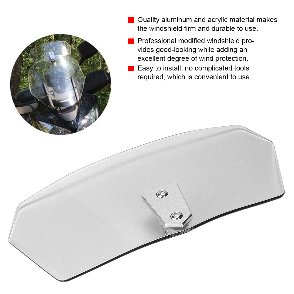 1、Quality aluminum and acrylic material makes the windshield firm and durable to use. 2、Professional modified windshield provides good-looking while adding an excellent degree of wind protection. 3、Easy to install, no complicated tools required, which is convenient to use. 4、Different colors for you to choose, which can satisfy different preference. 5、Universal design, which is a practical modification accessory.