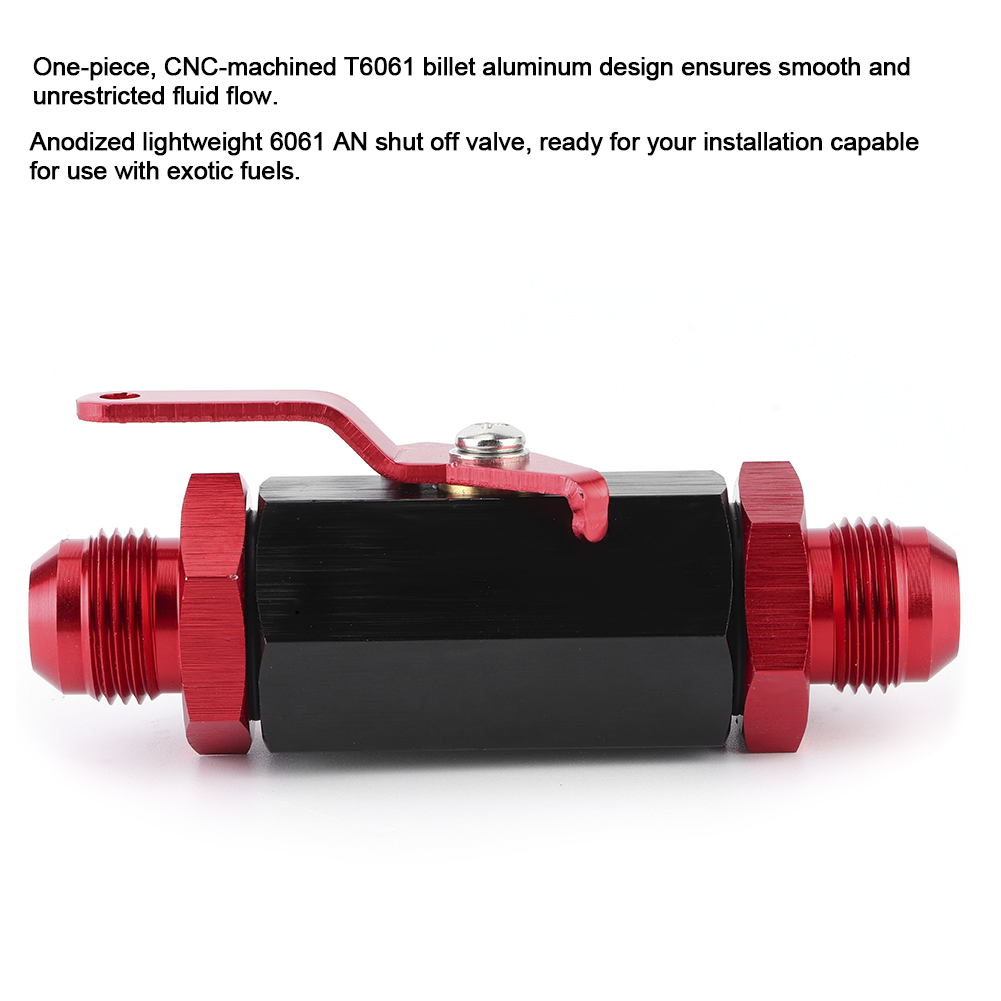 1、One-piece, CNC-machined T6061 billet aluminum design ensures smooth and unrestricted fluid flow. 2、They are available in black anodized finish with a laser-etched SS mark. 3、Anodized lightweight 6061 AN shut off valve, ready for your installation capable for use with exotic fuels. 4、Ball valve, high flow capacity, you can attach a cable for remote fuel cut off. 5、Hard-anodized coating is compatible with exotic fuel-additives. 6、10 AN male fittings for your system, body of unit is 73mm / 2.9in long.