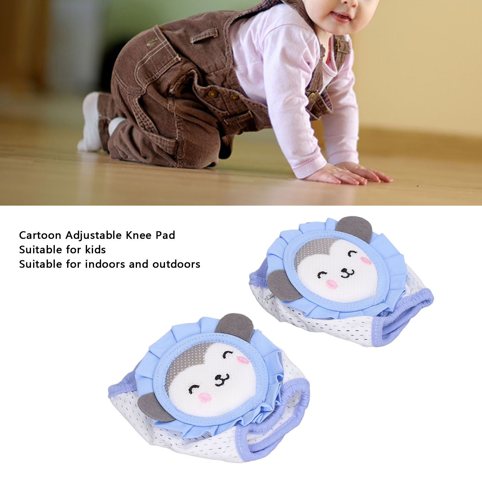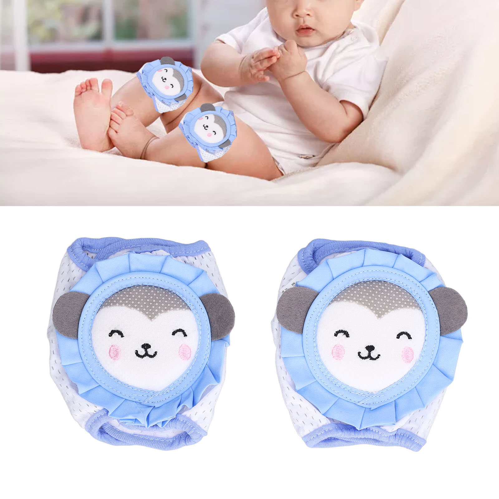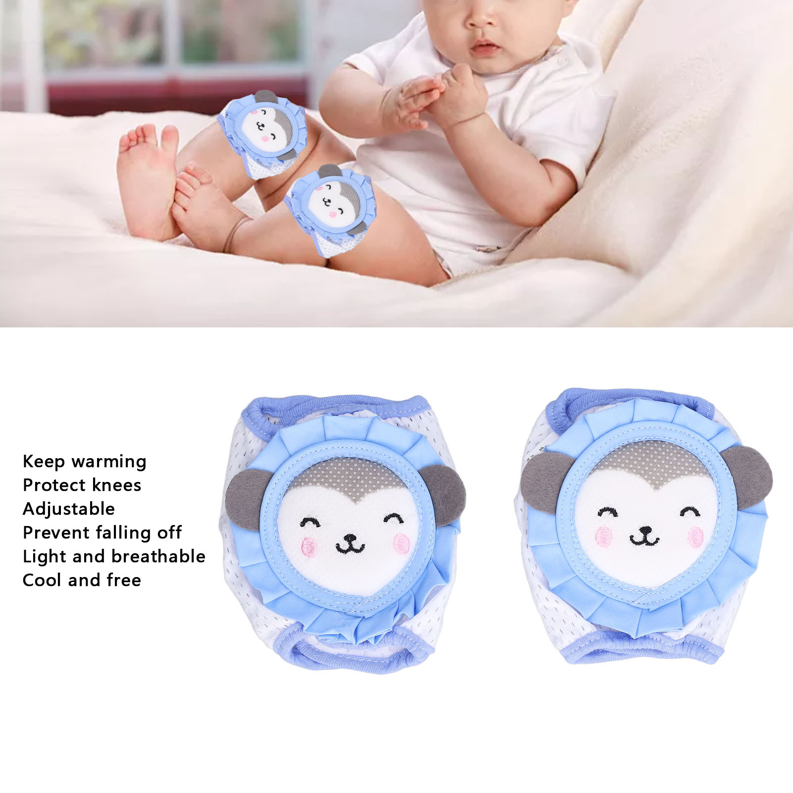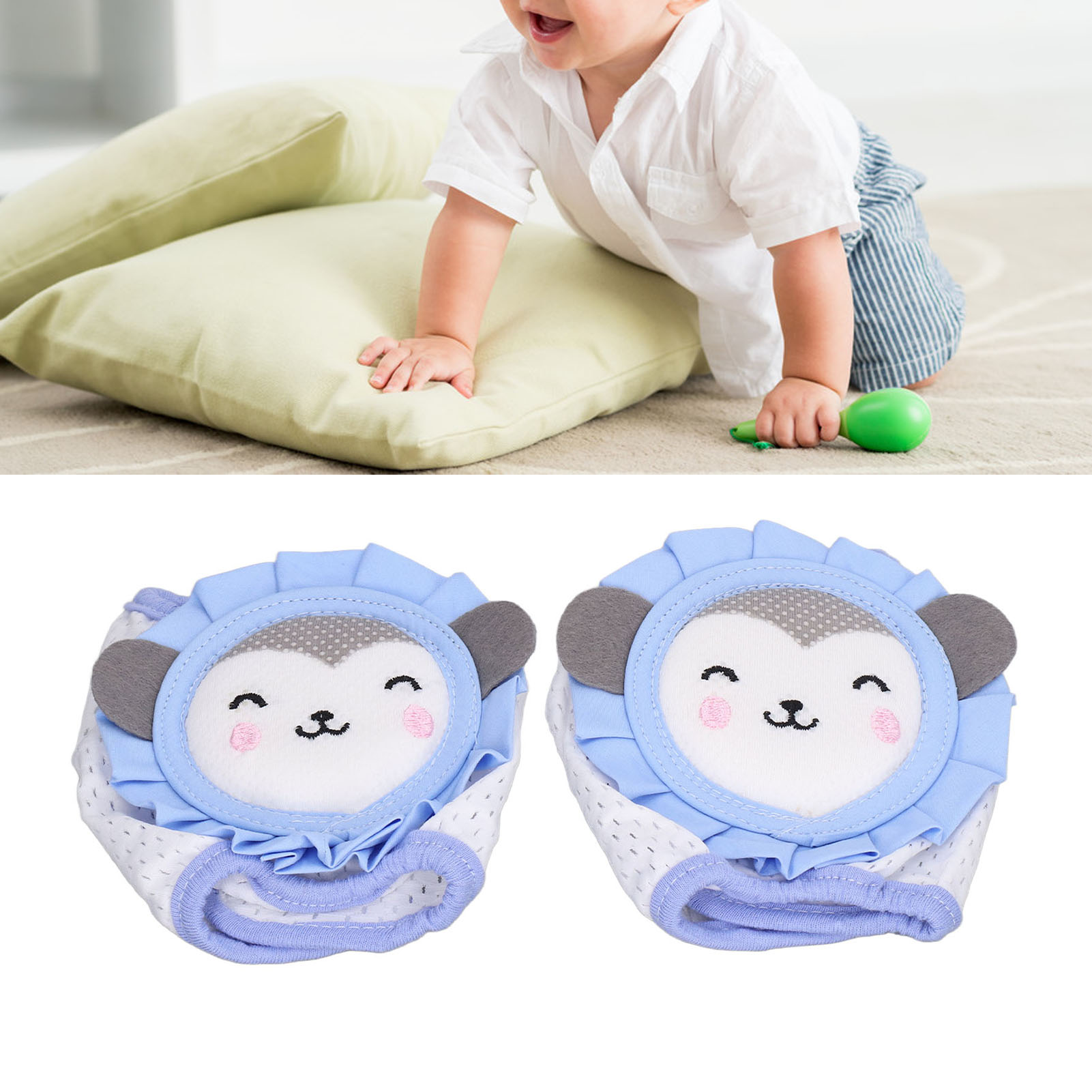 1、Knee Protection: Our cartoon knee pads will keep kids warm and protect their knee from cold and scrapes caused by hard wood or tile floor. 2、Ventilate: The baby knee pads are light and breathable, moisture wicking and soft. Cushions and fabrics keep the legs cool and free from sweating. 3、Adjustable: Our elastic knee pads can be adjusted to the size of the baby's legs. With the help of these cushions, baby's tiny knees can move freely. 4、Prevent Falling off: Our knee pads ensure children comfortably roll in the safety territory and that it will not just fall off for no reason when crawling. 5、Cute Cartoon: Sky blue monkey on the pads is loved by children, which is a best and wonderful gift for child or person who has childlike innocence.