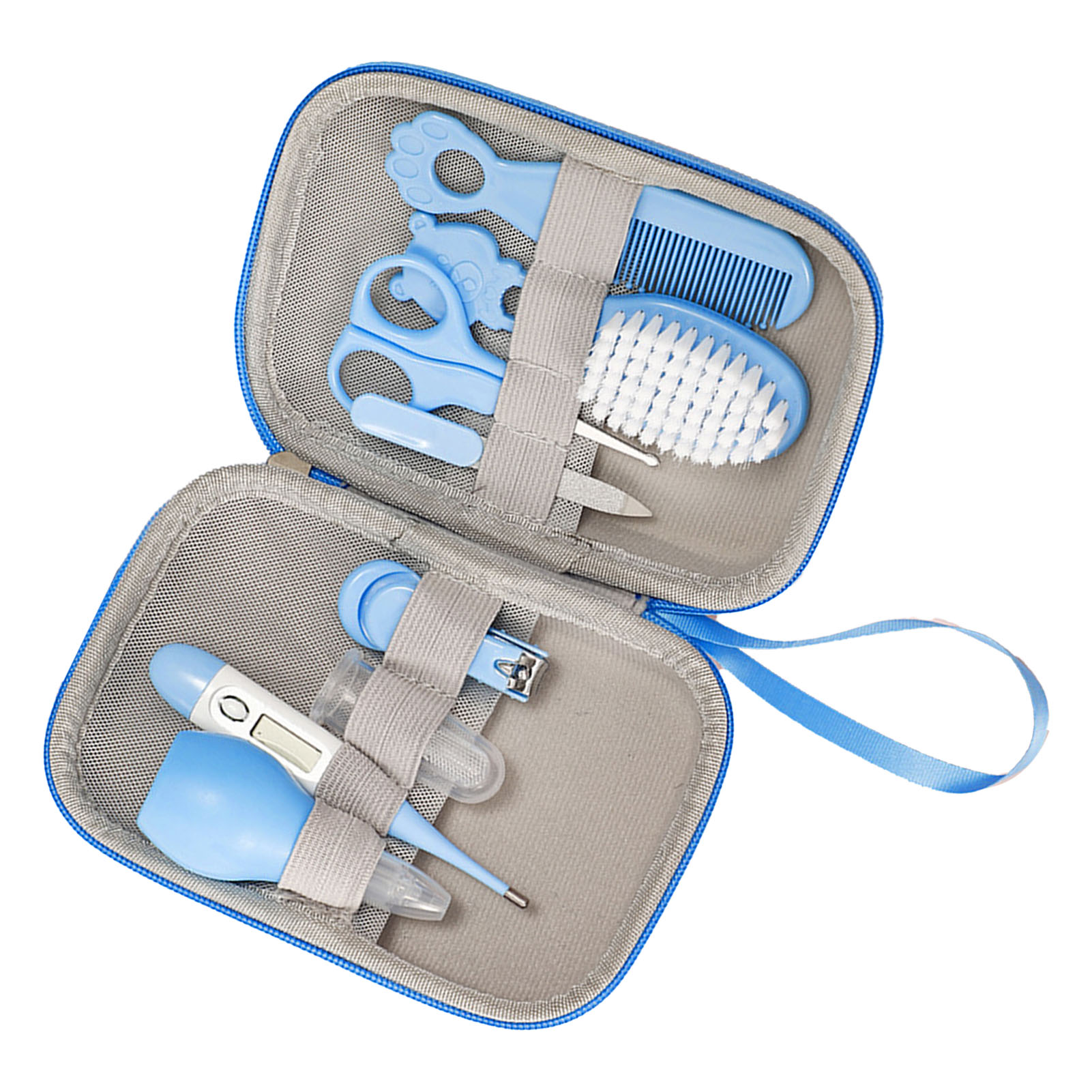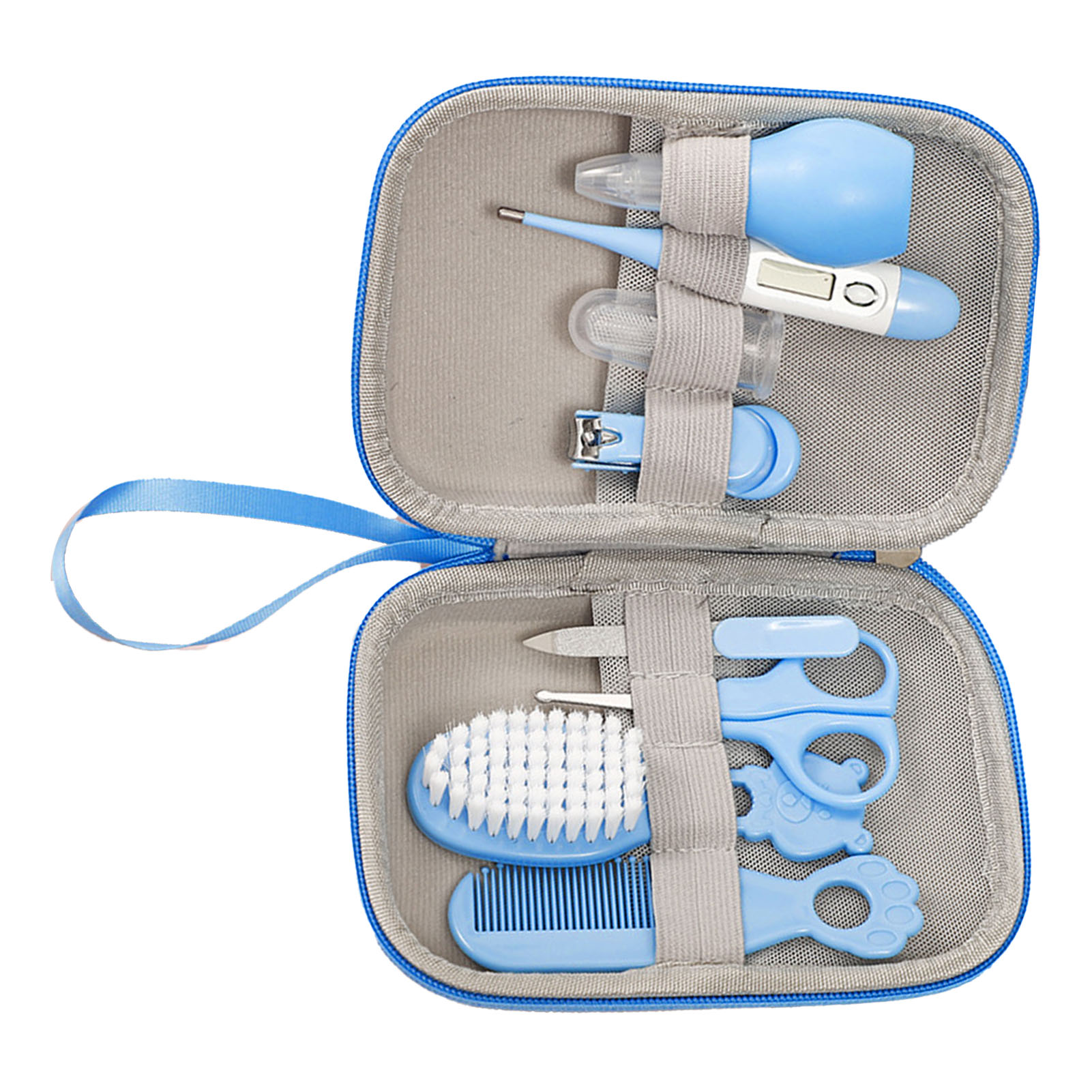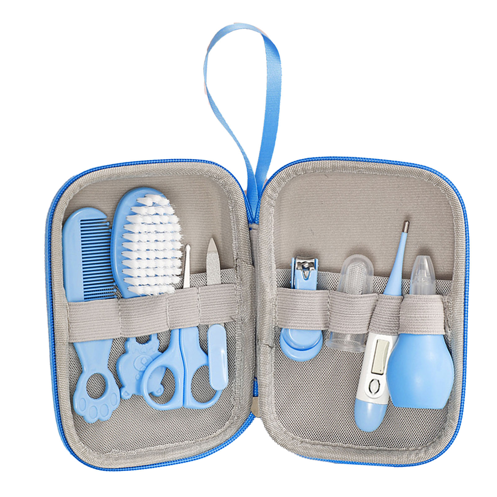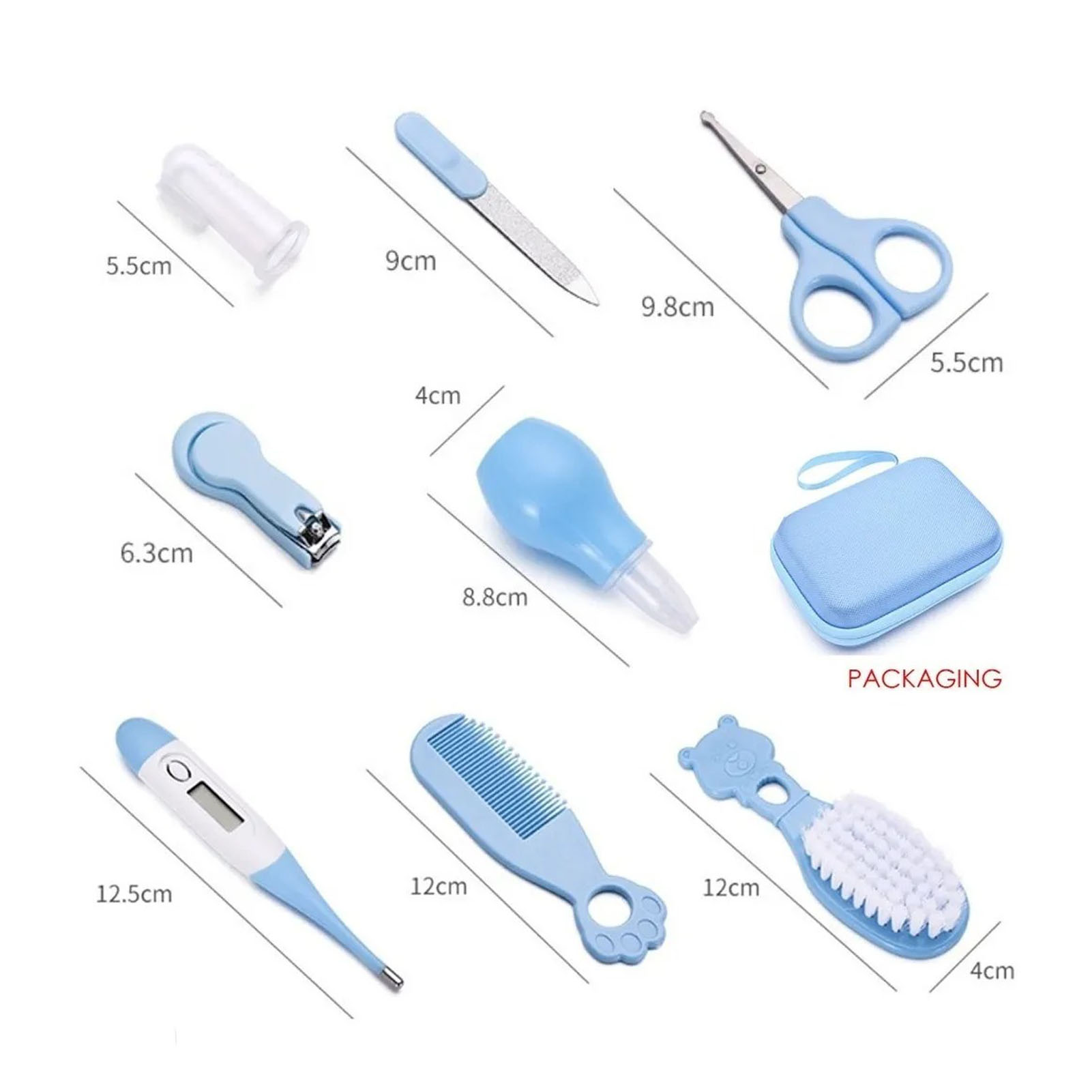 1、Baby Healthcare Kit: 8 full sets of baby healthcare tools to easily meet all needs. Includes baby brush, comb, thermometer, nail clipper, nail file, scissors, nose cleaner, and toothbrush. 2、Material: To keep every baby healthy and cared for at all times, we have designed this wash kit made of premium soft silicone material that is safe and easy to use. 3、Baby Nail Set: Give your baby's nails a good touch. Round ended scissors, mini nail clippers and nail files are designed for babies to prevent accidental injuries. 4、Small And Portable: The blue baby healthcare kit is light weight and very easy to carry, whether at home or traveling. 5、Applicability: Suitable for newborns to toddlers! High end parenting care kit is perfect for birthday gifts, baby shower gifts or Christmas gifts!