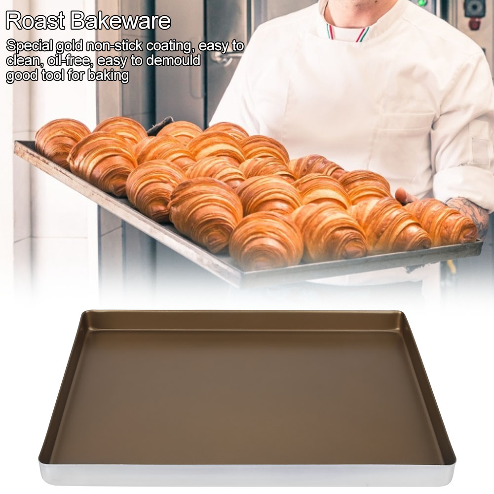1、Non-stick design, very easy to use. 2、Special gold non-stick coating, easy to clean, oil-free, easy to demould, good tool for baking. 3、One-piece stretched product structure, no dead ends, no oil or cake liquid leakage, strong and durable. 4、Made of 1.5mm aluminum alloy, high strength, light weight and durability, corrosion resistance and good thermal conductivity. 5、40 * 30 optimum size and thickness for home ovens.