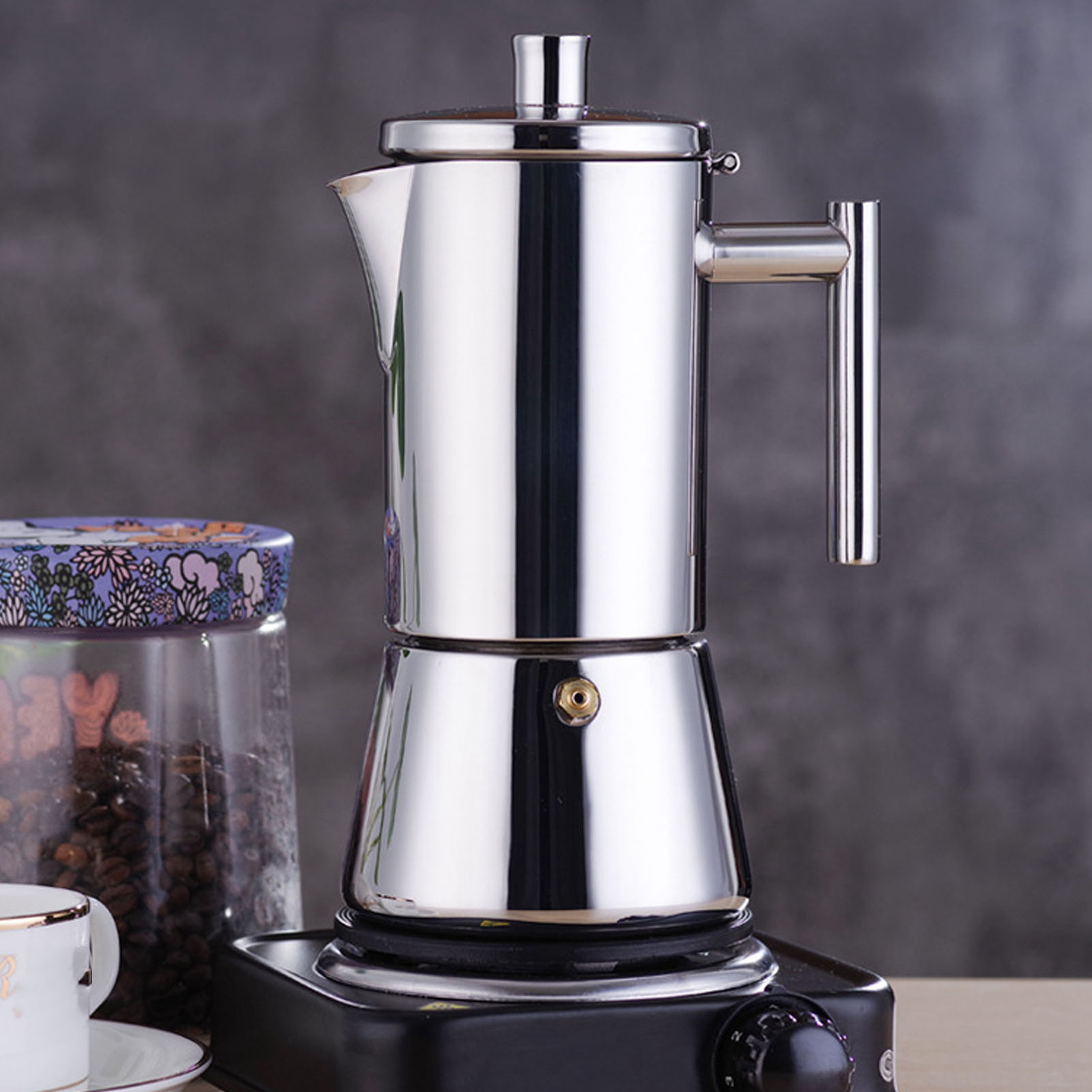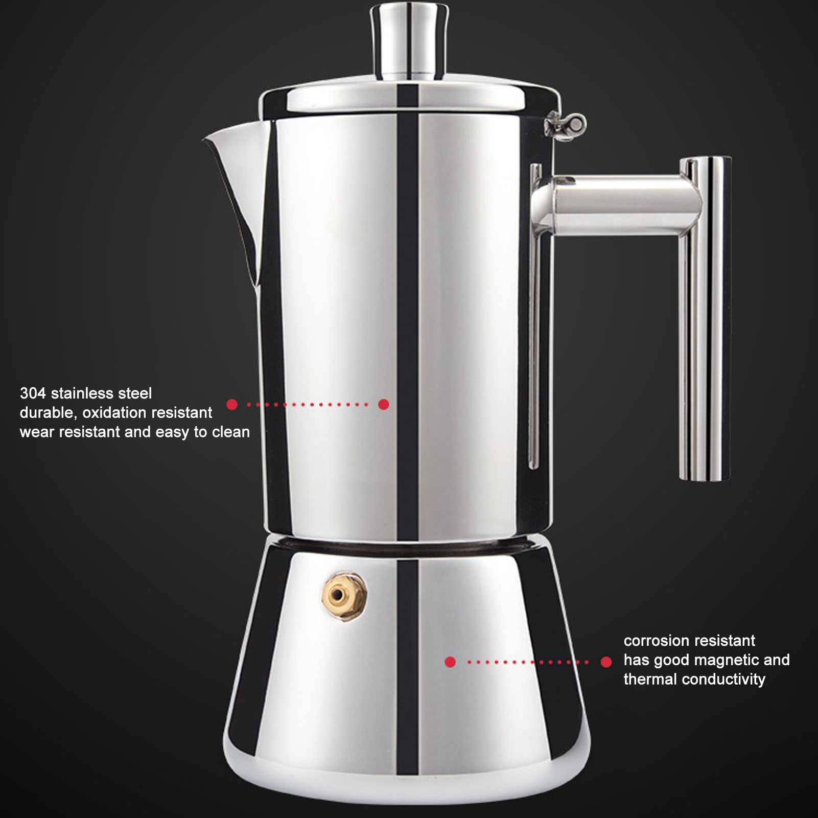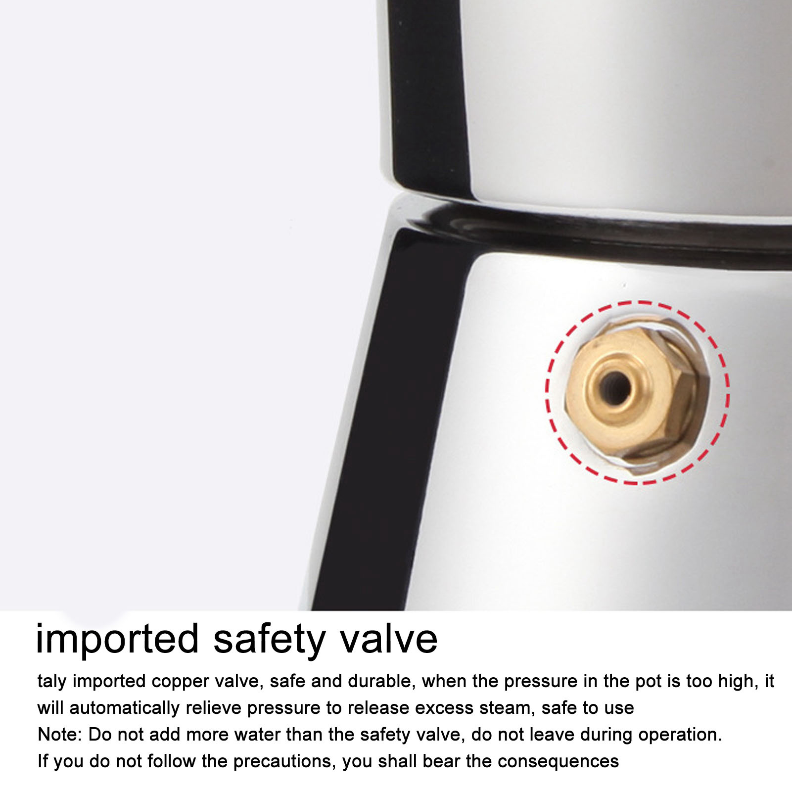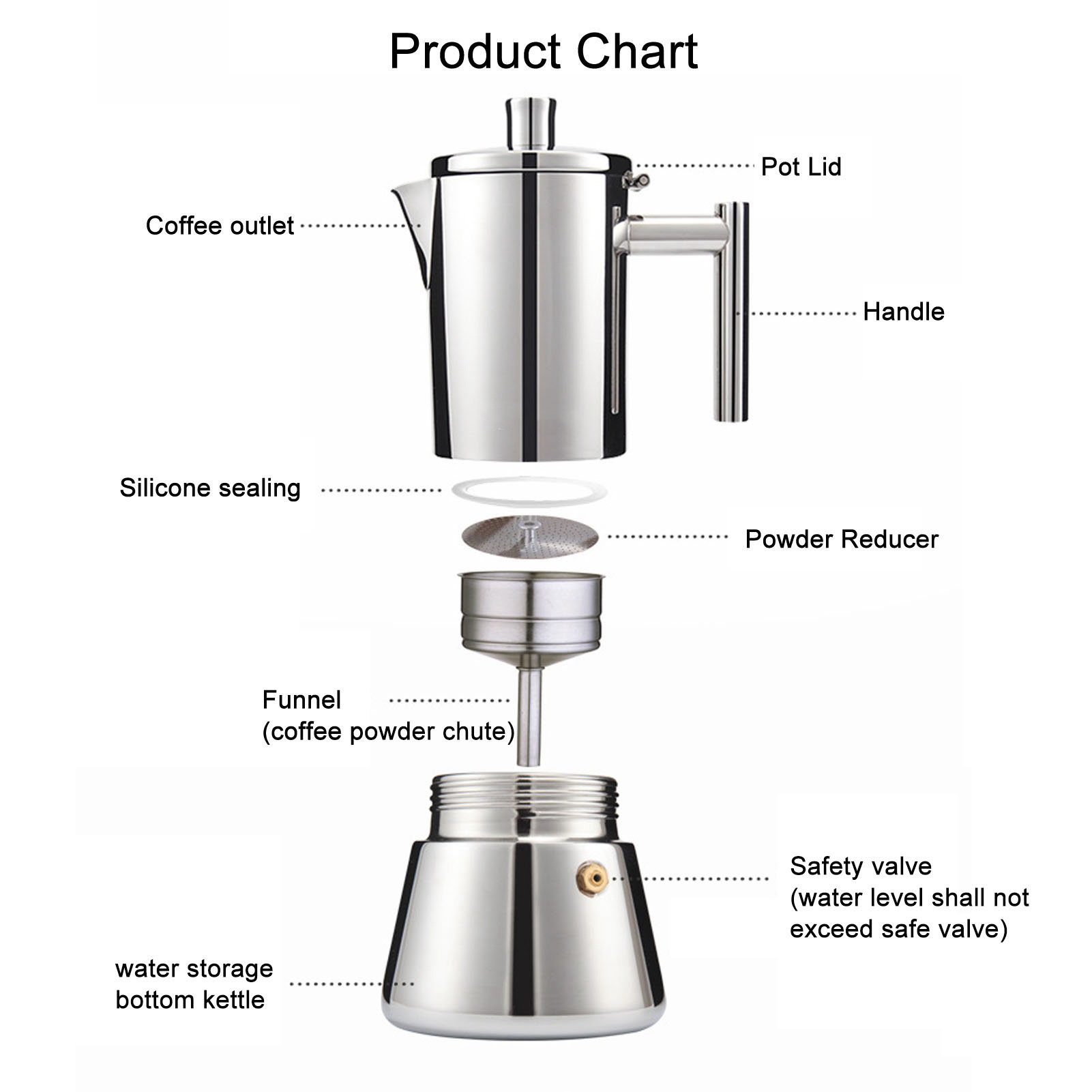 1、Premium Material: Made of premium 304 stainless steel, the coffee making pot adopts high mirror polishing treatment, rustproof and corrosion resistant. 2、Wide Application: The stainless steel coffee making pot is suitable for gas stove, induction stove, electric stove and so on, dishwasher safe. 3、Heatproof: The coffee maker kettle adopts exquisite craftsmanship, has heat resistant handle and insulation lid, can be used for a long time. 4、Safety Valve: The stainless steel coffee maker adopts safety valve design, with dual safety, takes less than five minutes to heat and brew. 5、Leakage Proof: The spout of polished coffee pot adopts the aquiline design, the water flow is clear, leakage prevention, overflow proof, not easy to splashing.
